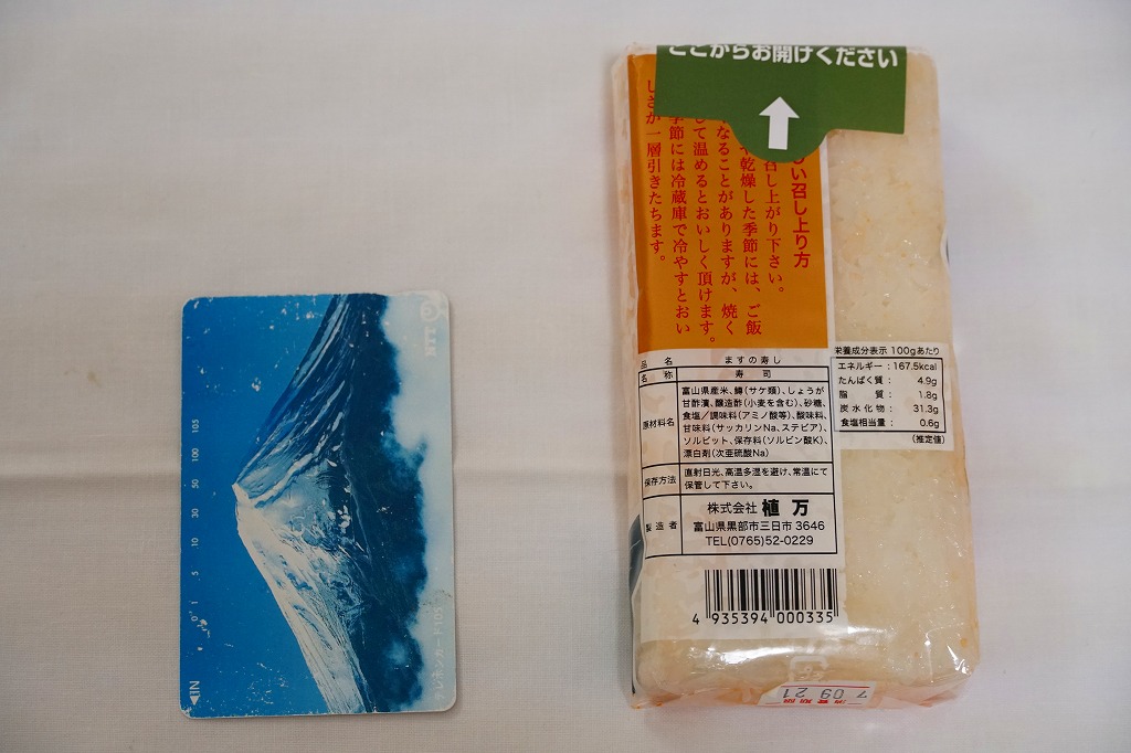 富山県内の駅売店などで買える、普通の形でないマス寿司。調製元が「かまぼこ型」と表現する、小銭入れくらいの大きさの板がひとつ、商品名などを記した透明なフィルムに直接包まれる。近年は東京のコンビニでもおにぎりサイズのマス寿司を買えるようになったが、そんな機能を持つ商品。腹の足しにされるよう、マスが薄めで酢飯が多めになっているようなことも、公式に紹介されている。価格は2015年の購入時で390円、2019年時点で420円、2023年時点で450円、2024年時点で480円、2025年時点で520円。