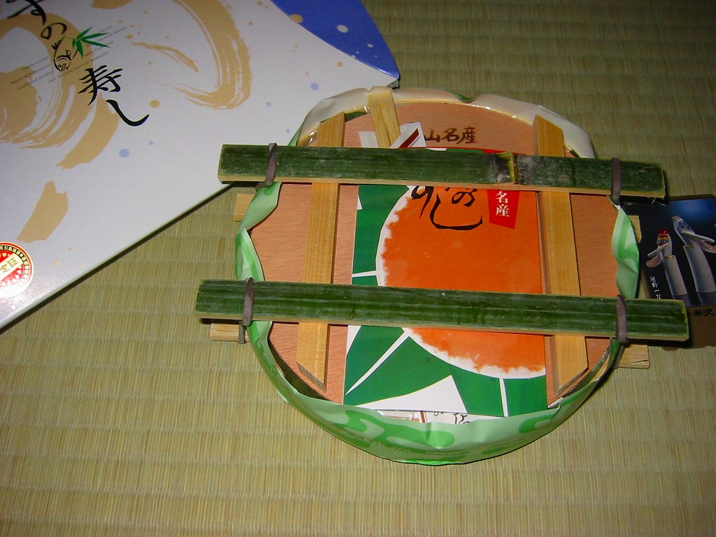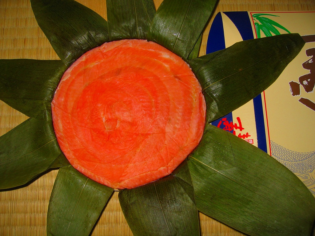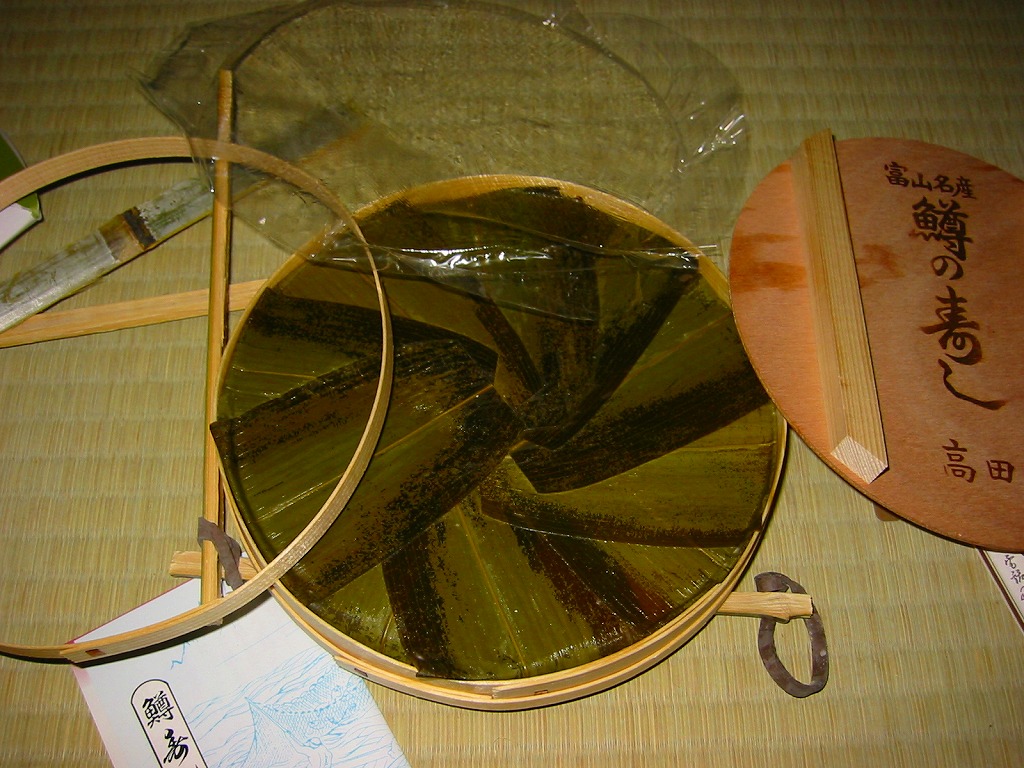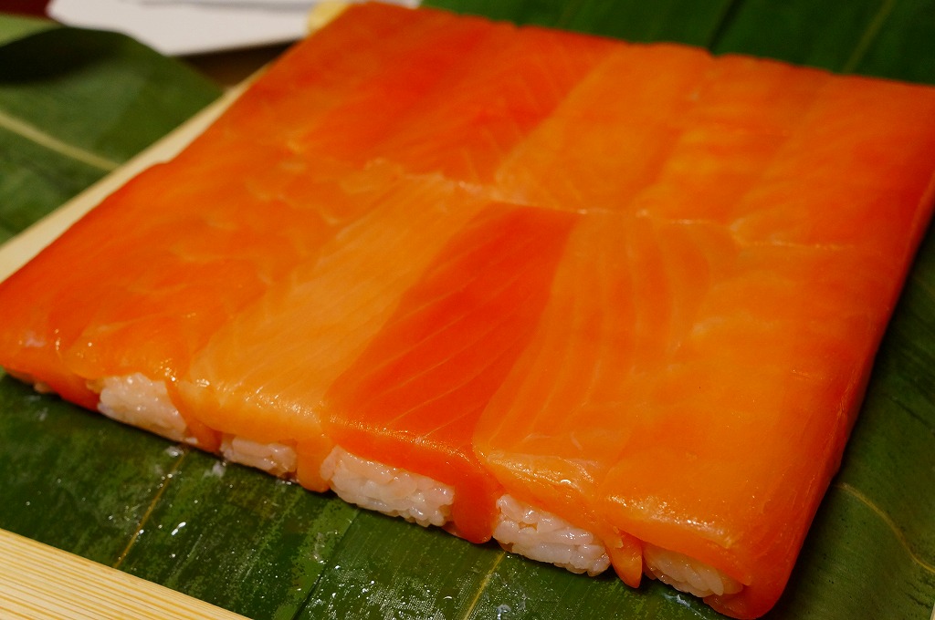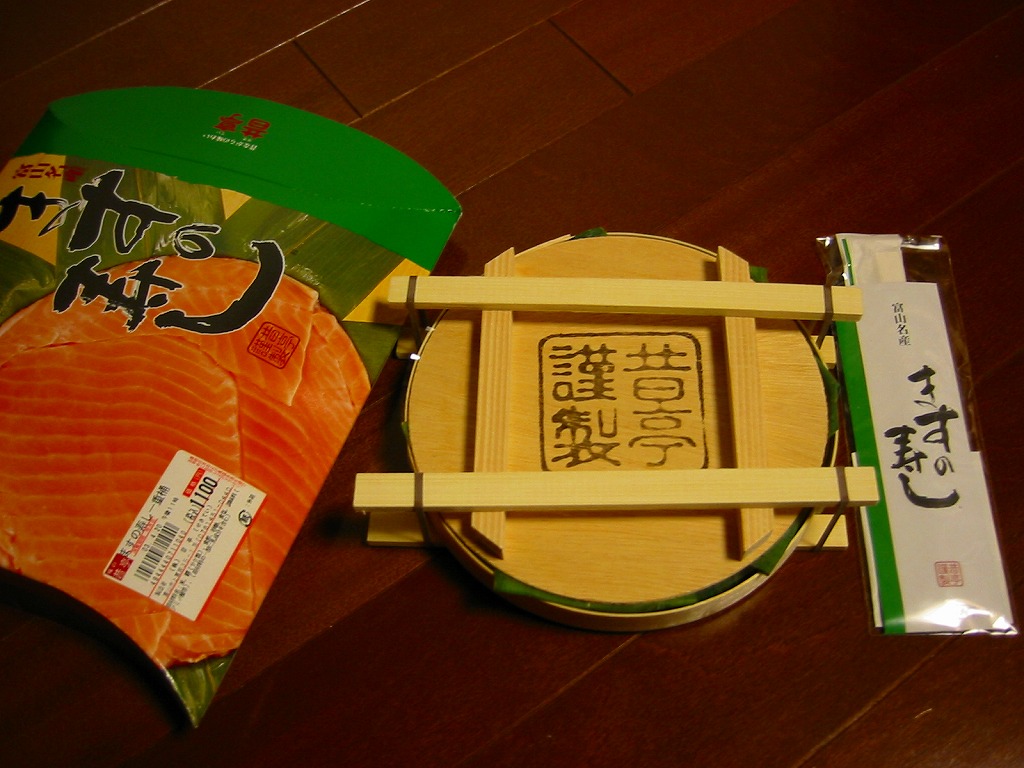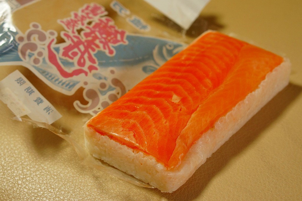 富山のマス寿司でおなじみの名前と形状のパッケージに、おなじみでない四角い木製押寿司容器が収まる。中身は単に四角いマス寿司に見えて、棒状の酢飯に身の厚いマスを180度巻いたものが、ぴったり整然と列べられていた。全体の分量は少ないが、身の割合とサーモンばりのジューシーさはなかなか。価格は2013年の購入時で1,890円。