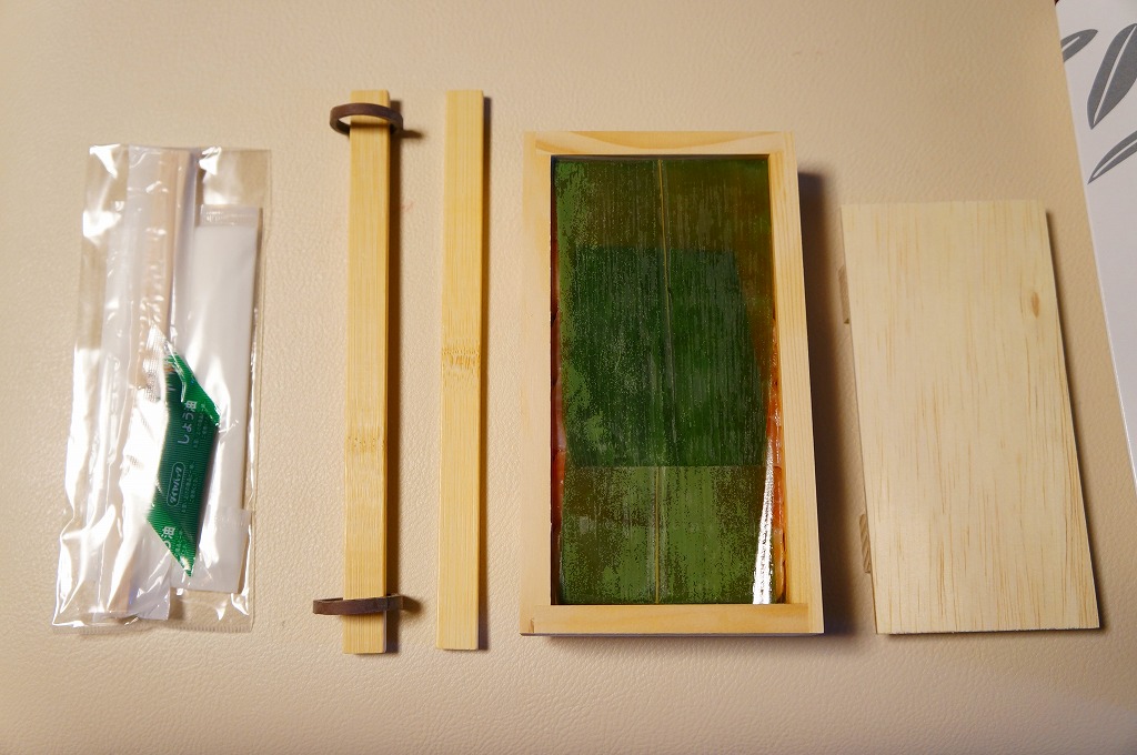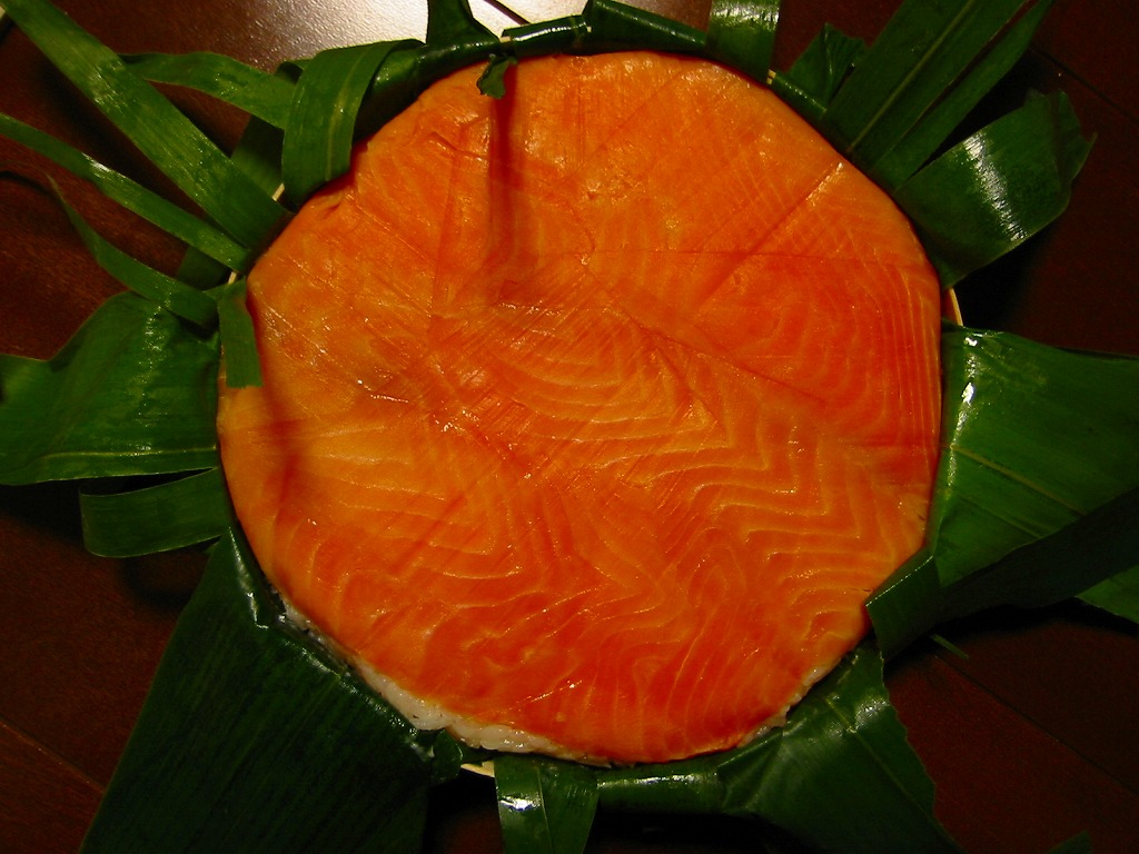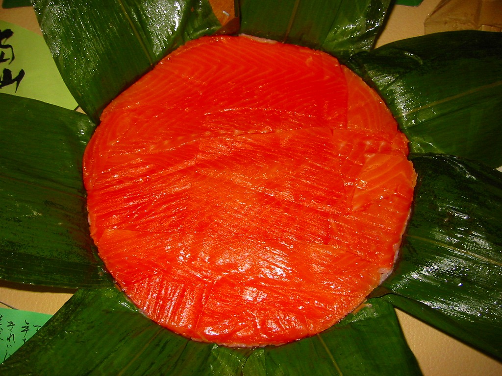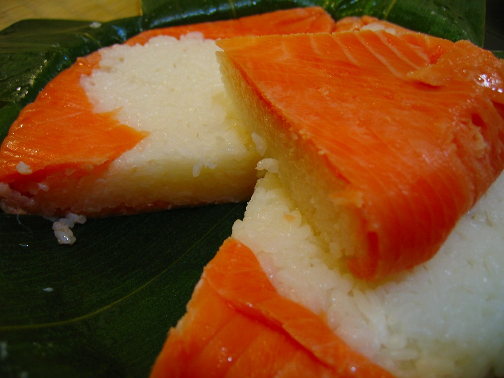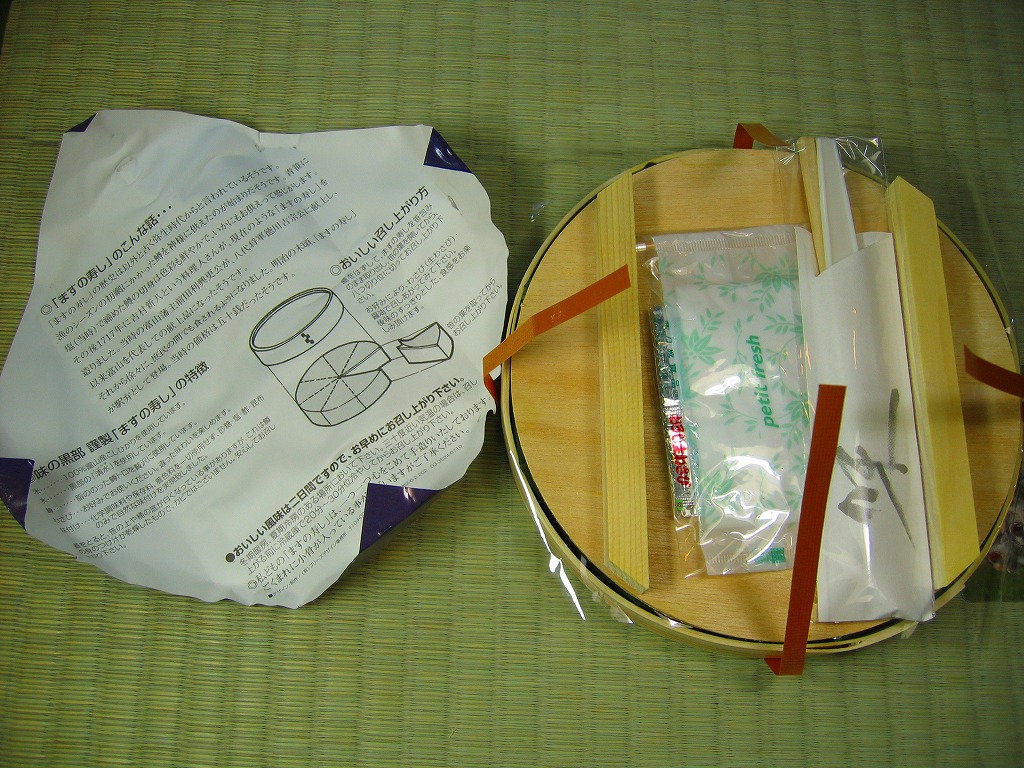 富山のマス寿司でおなじみの名前と形状のパッケージに、おなじみでない四角い木製押寿司容器が収まる。中身は単に四角いマス寿司に見えて、棒状の酢飯に身の厚いマスを180度巻いたものが、ぴったり整然と列べられていた。全体の分量は少ないが、身の割合とサーモンばりのジューシーさはなかなか。価格は2013年の購入時で1,890円。