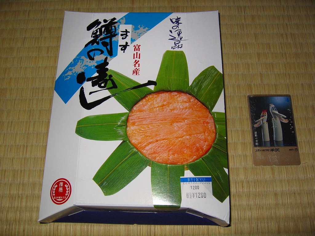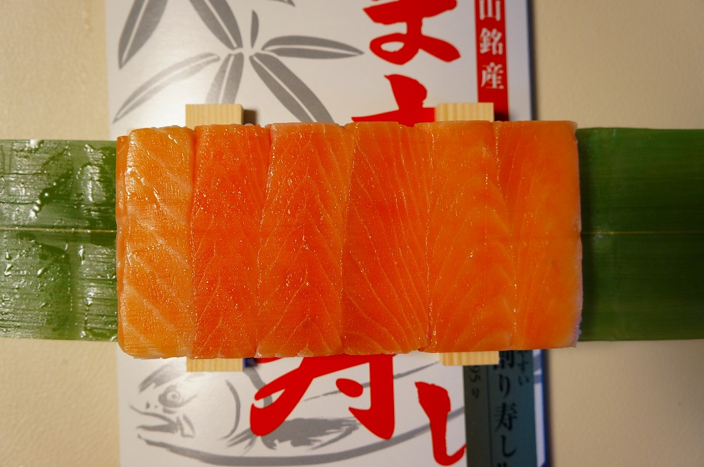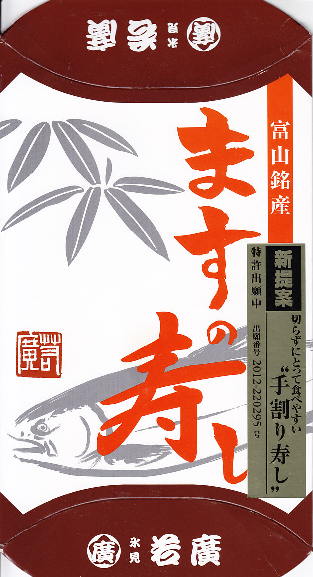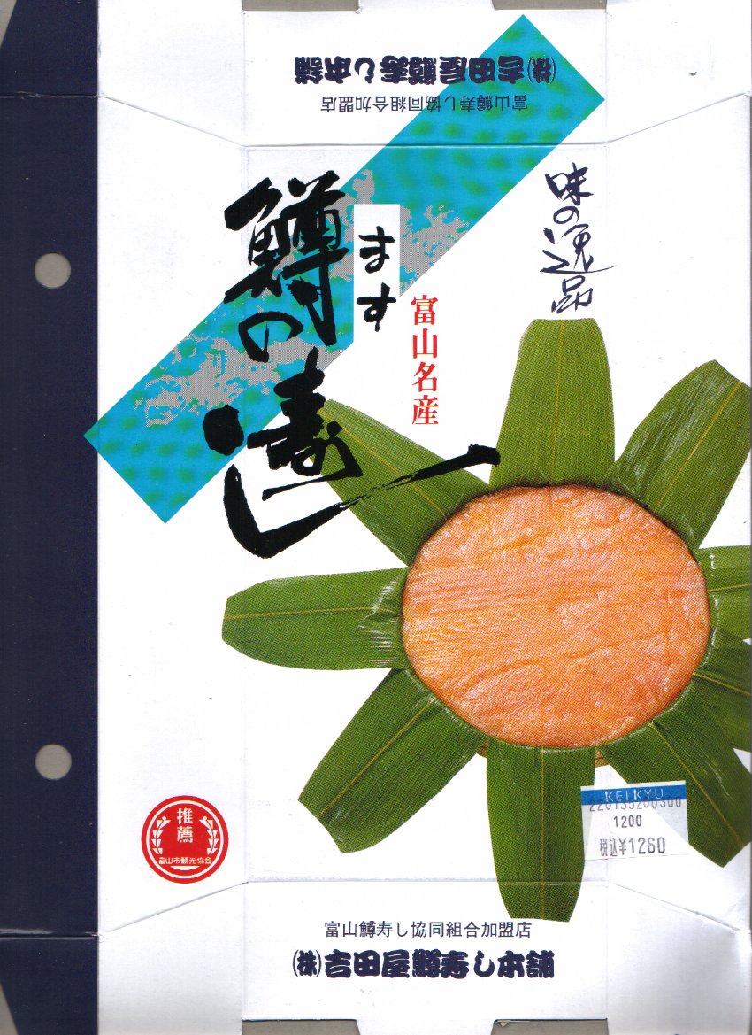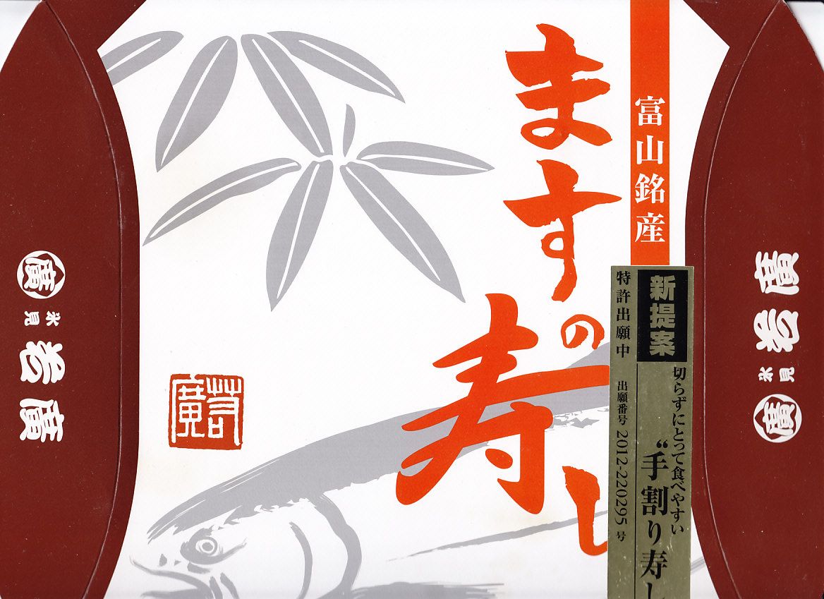 富山のマス寿司でおなじみの名前と形状のパッケージを細長くしたものに、おなじみでない四角い木製押寿司容器が収まる。中身はバッテラか押し寿司かに見えて、棒状の酢飯に身の厚いマスを180度巻いたものが、ぴったり整然と列べられていた。全体の分量はとても少なく、その割にはいい値段がするが、身の割合とサーモンばりのジューシーさはなかなか。価格は2013年の購入時で1,260円。