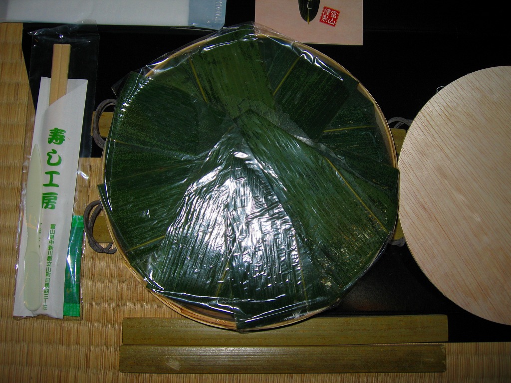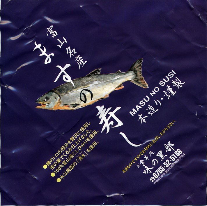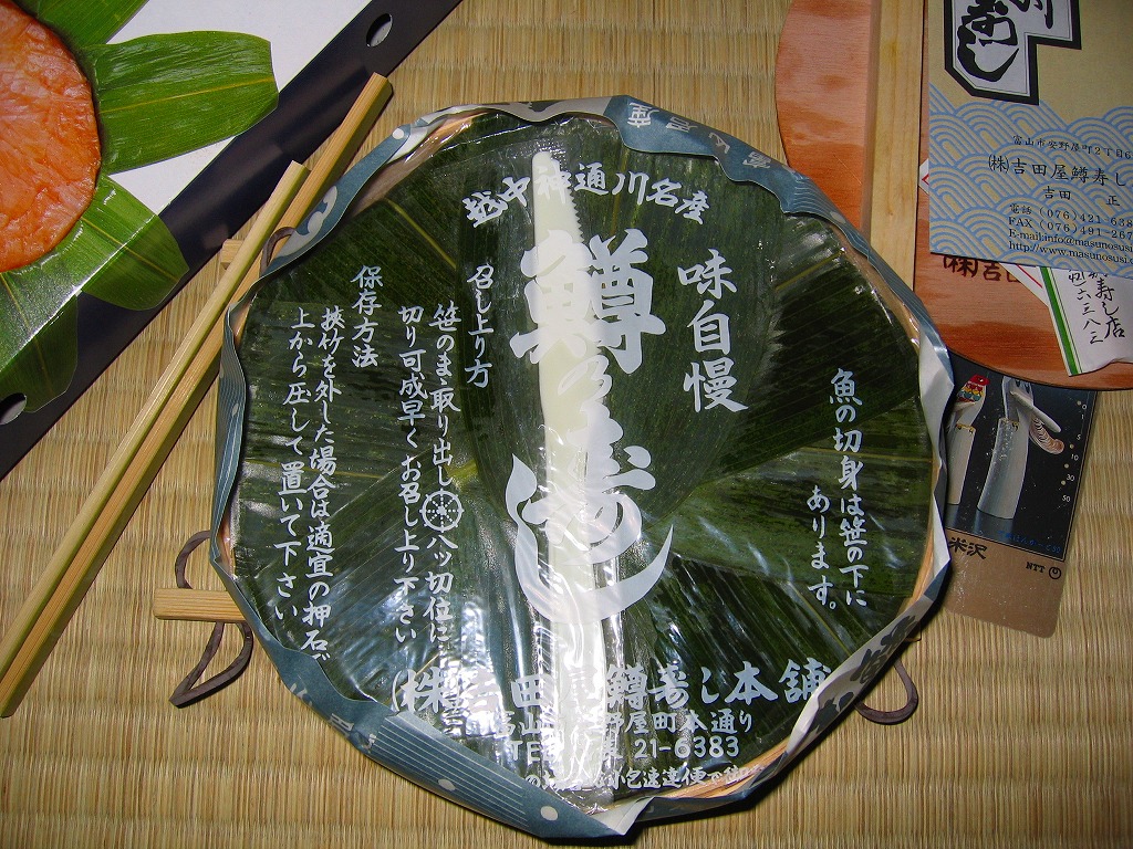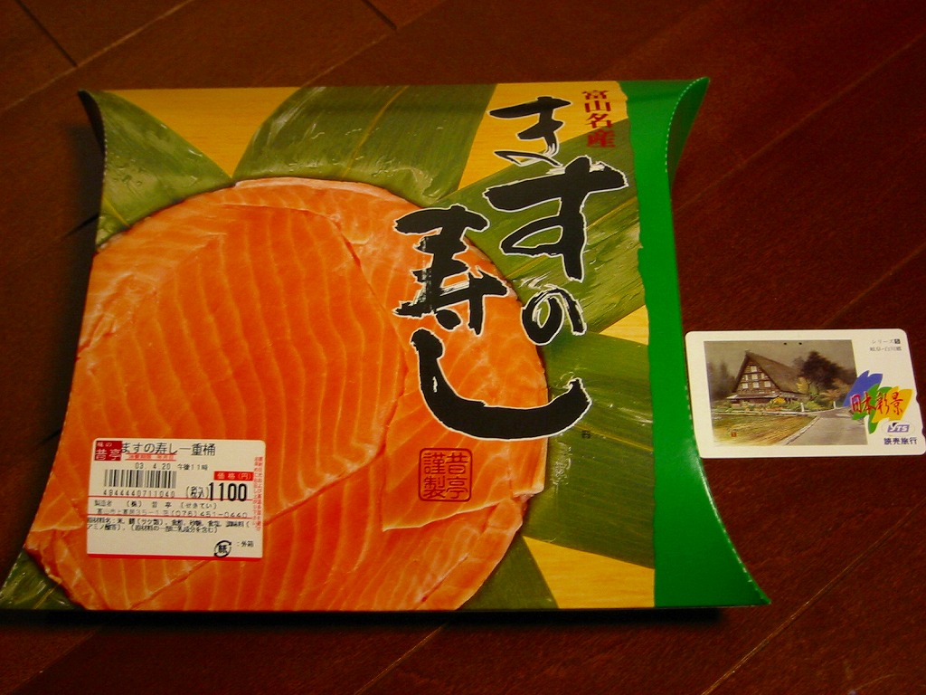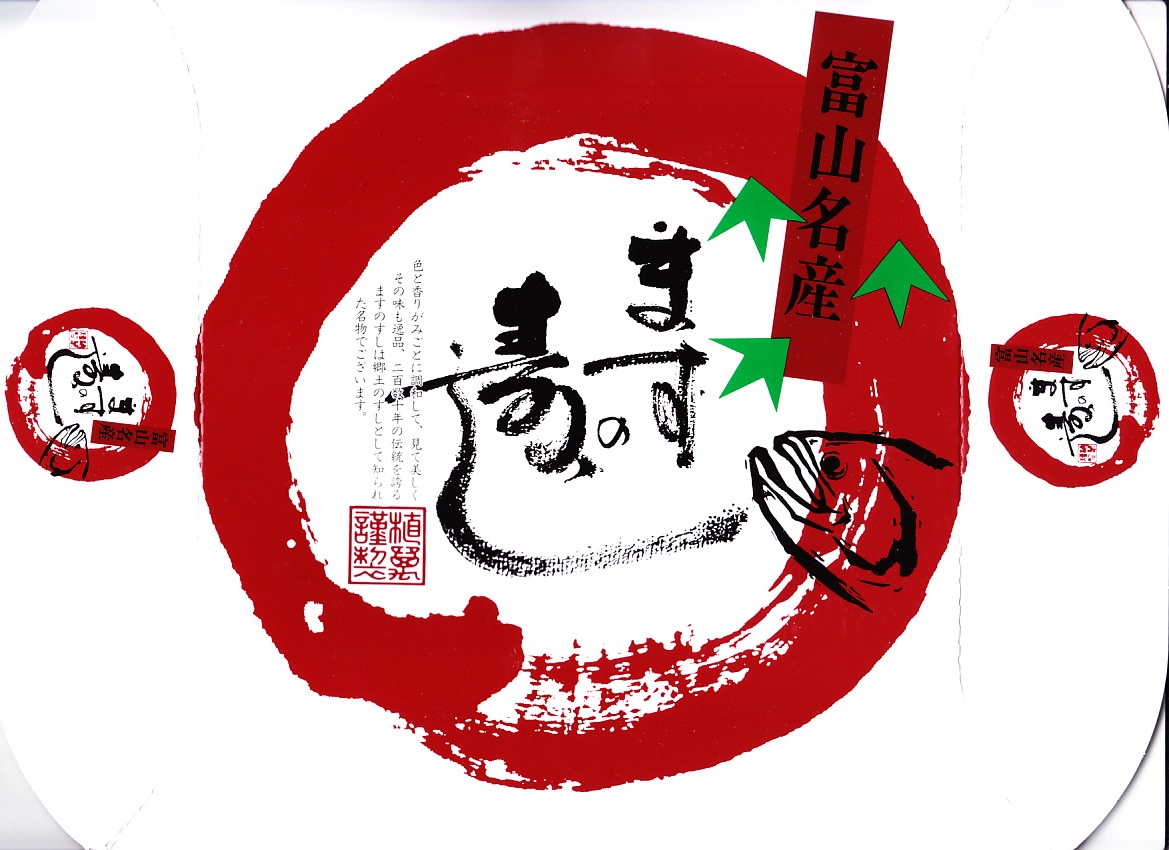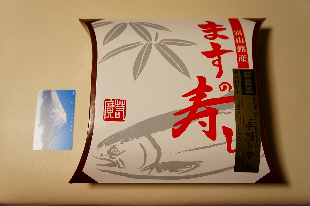 富山のマス寿司でおなじみの名前と形状のパッケージを細長くしたものに、おなじみでない四角い木製押寿司容器が収まる。中身はバッテラか押し寿司かに見えて、棒状の酢飯に身の厚いマスを180度巻いたものが、ぴったり整然と列べられていた。全体の分量はとても少なく、その割にはいい値段がするが、身の割合とサーモンばりのジューシーさはなかなか。価格は2013年の購入時で1,260円。