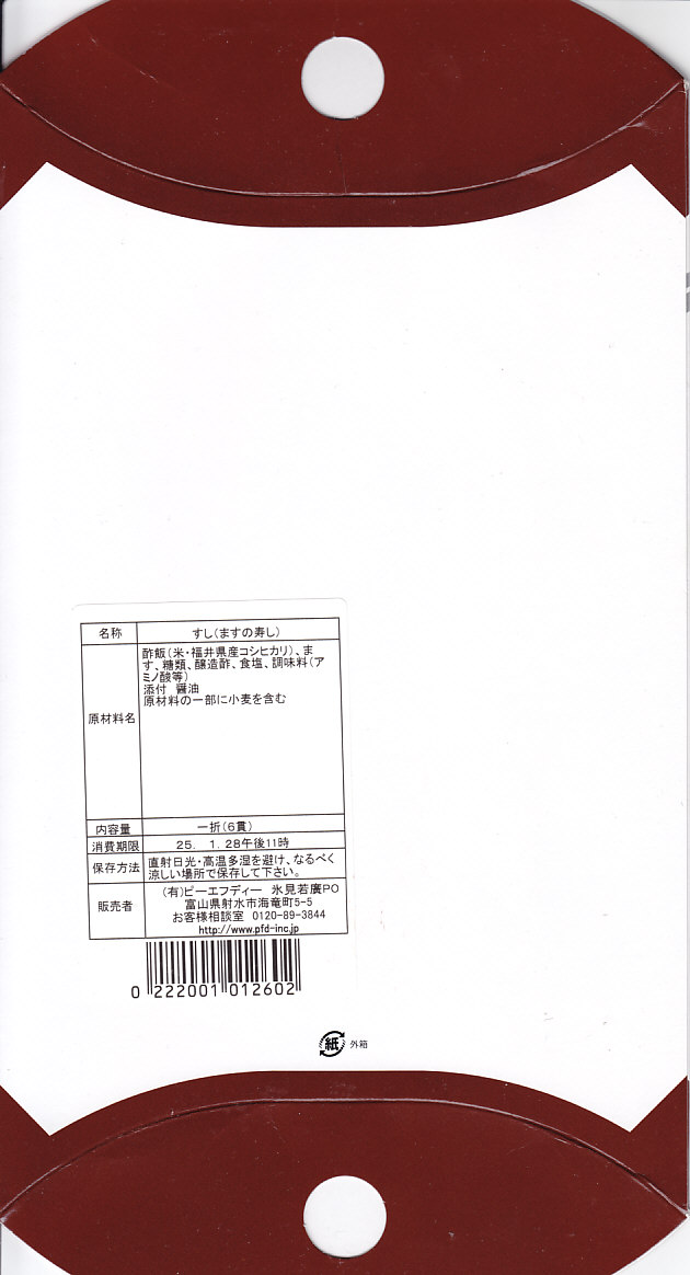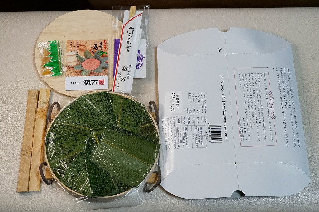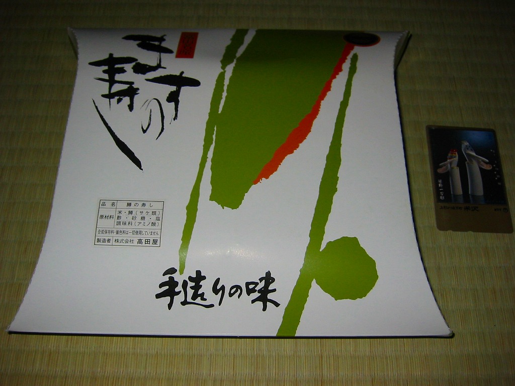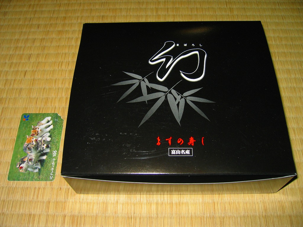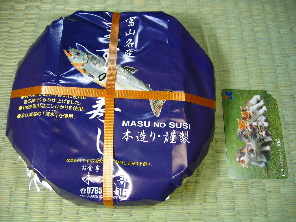 富山のマス寿司でおなじみの名前と形状のパッケージを細長くしたものに、おなじみでない四角い木製押寿司容器が収まる。中身はバッテラか押し寿司かに見えて、棒状の酢飯に身の厚いマスを180度巻いたものが、ぴったり整然と列べられていた。全体の分量はとても少なく、その割にはいい値段がするが、身の割合とサーモンばりのジューシーさはなかなか。価格は2013年の購入時で1,260円。