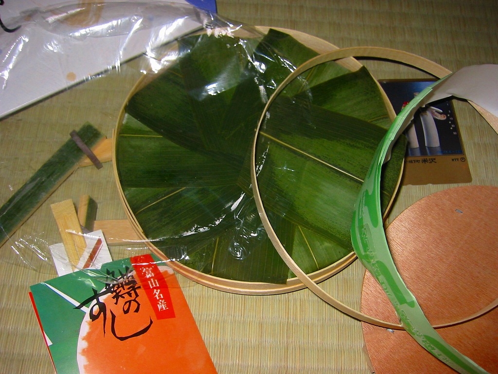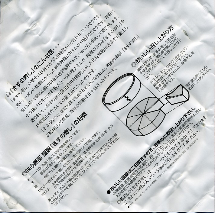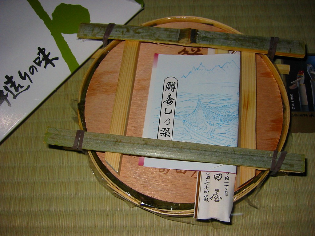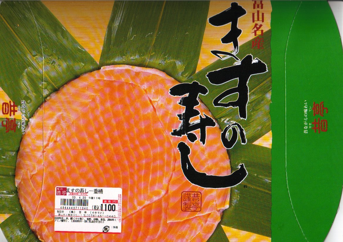 駅弁屋でない業者さんが作る、富山名物ますのすし。パッケージは他と異なり上方だけが開く縦型、細めの竹が輪ゴムでふたを押す容器の基本構造は他と同じで、中身は鱒が底に敷かれる反転型。味はかなり脂豊かな、または脂っぽい感じで、価格は珍しく横一線でない、2004年の購入時で1,260円。添付のしおりと笹の上のビニールで食べ方を念押しする。