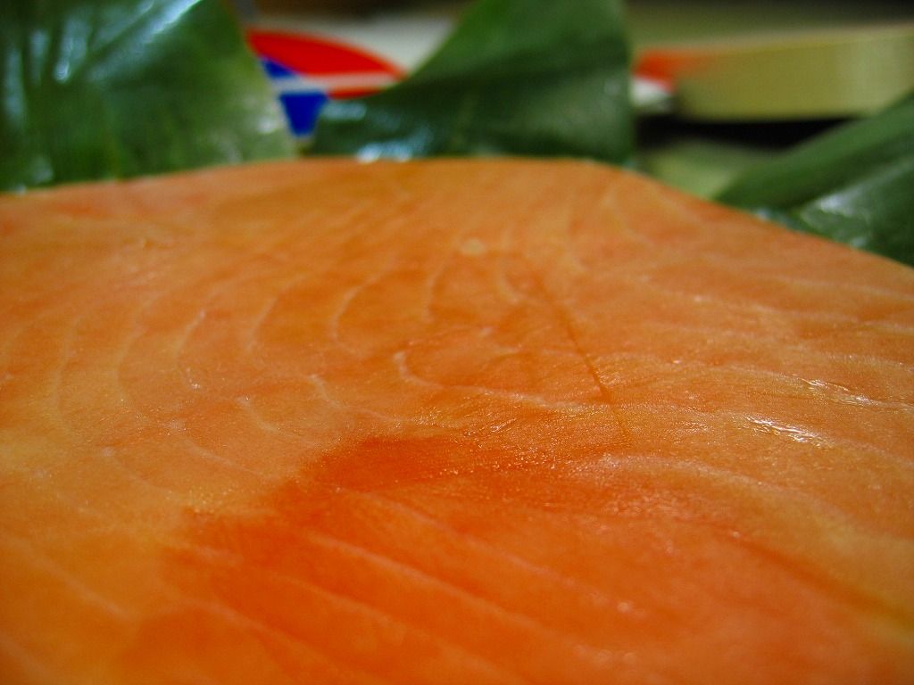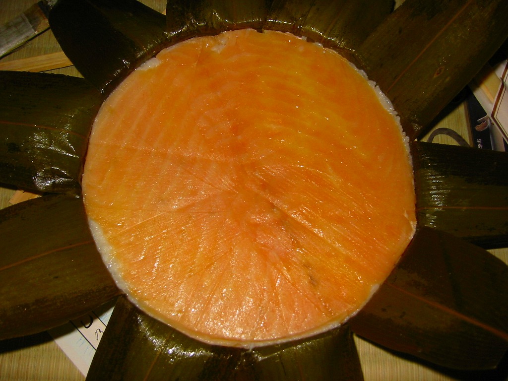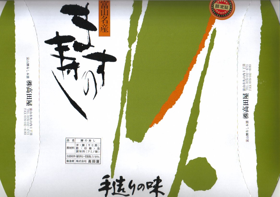 駅弁屋でない業者さんが作る、富山名物ますのすし。高島屋横浜店での北陸物産展で入手した。価格から判断して駅弁の「特選ますのすし」に該当する商品のようで、ピンク色というより朱色に近い鮮やかなノルウェー産サーモントラウトの身が印象的だった。味も駅弁と同等。笹色単色のパッケージに金色のシールという容姿も映える。価格は2003年の購入時で1,500円。