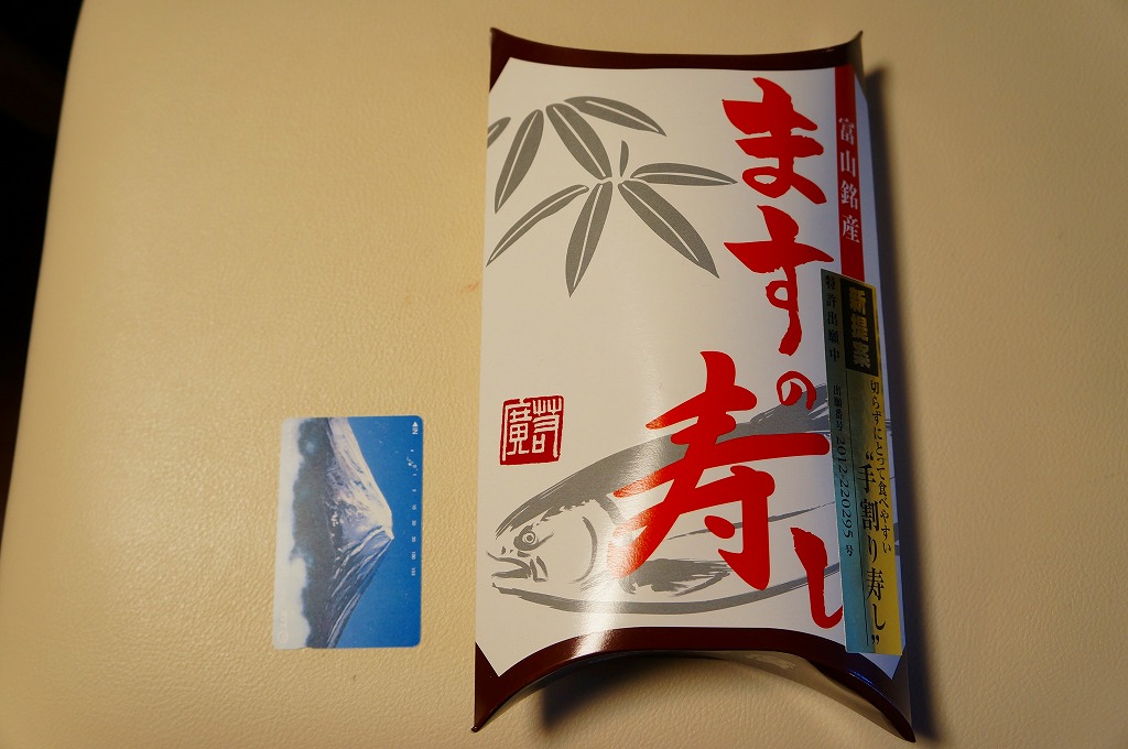 駅弁屋でない業者さんが作り、東海道新幹線のジェイアール東海パッセンジャーズが販売する、富山名物ますのすし。パッケージのデザインを除いて駅弁のますのすしと価格も中身も同一であるが、こちらは鱒寿司を包む笹の葉がとても薄く、きれいにはがすのが困難であるため、付属のナイフで笹の葉ごとざっくり刻む正しい食べ方しかできない。味は駅弁と比較して身が柔らかく飯がしゃきっとした感じがした。価格は2003年の購入時で1,100円。