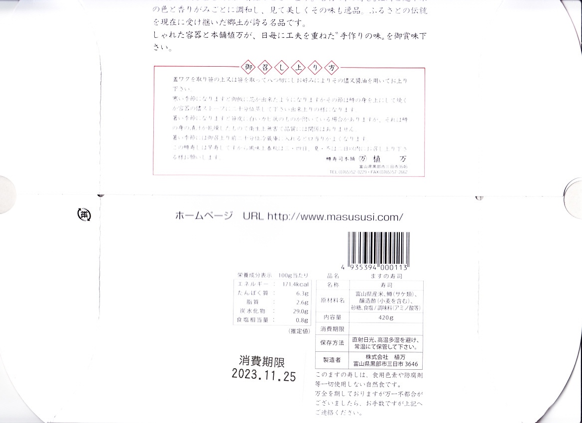 上記の商品「富山名産鱒寿し」の、2015(平成27)年時点での姿。価格と食品表示を除き、上記の2025年のものと変わらない。当時のほうがマスの身に脂が乗り、味がジューシーに思えた。