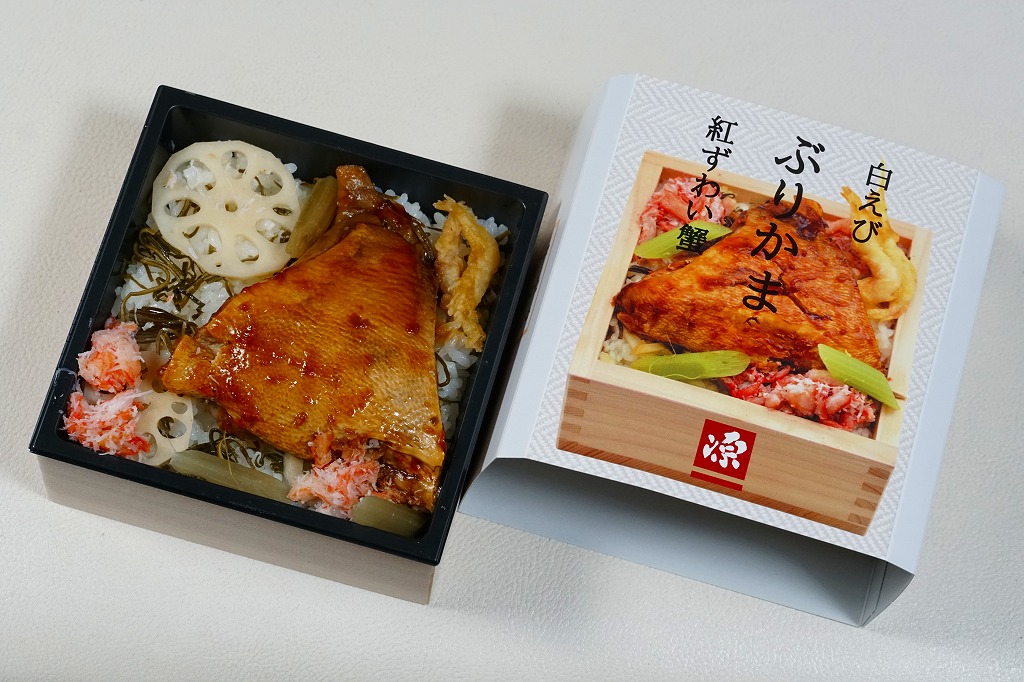 上記の駅弁「ぶりかま紅ずわい蟹白えび」の、2017(平成29)年時点での姿。当時は正方形の容器を黒い紙で包んで掛紙を載せており、そこに「源の旅めし」の表記があった。中身は変わらない。