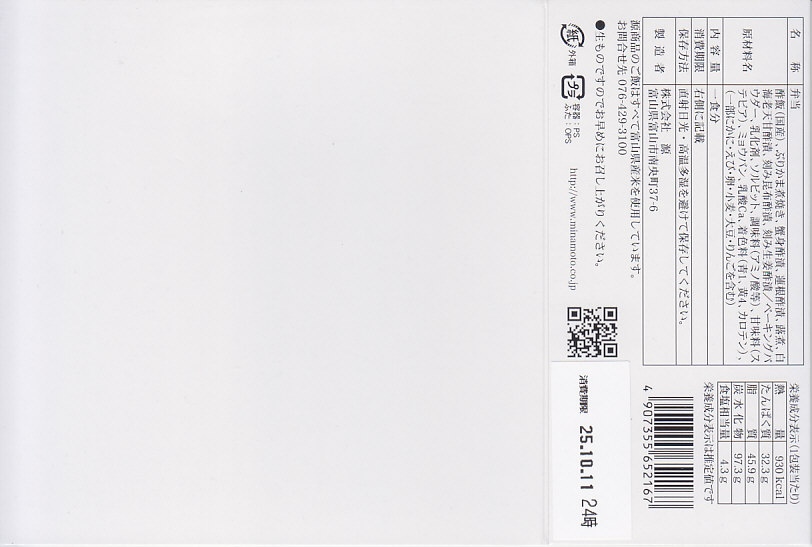 正方形のプラ容器に酢飯を敷き、刻み昆布をまぶし、ぶりかまの煮焼きを置き、カニとフキとレンコンと白海老天で彩り、そんな中身を枡に詰めた写真のスリーブに収める。つまり、冬に人気の富山駅弁「ぶりかまめし」の変型。この味は何度でもいける。値段は2017年時点で1,380円、2018年時点で1,300円。2022年時点で11月から3月まで1,550円で販売する季節の駅弁になった模様。