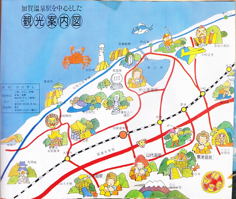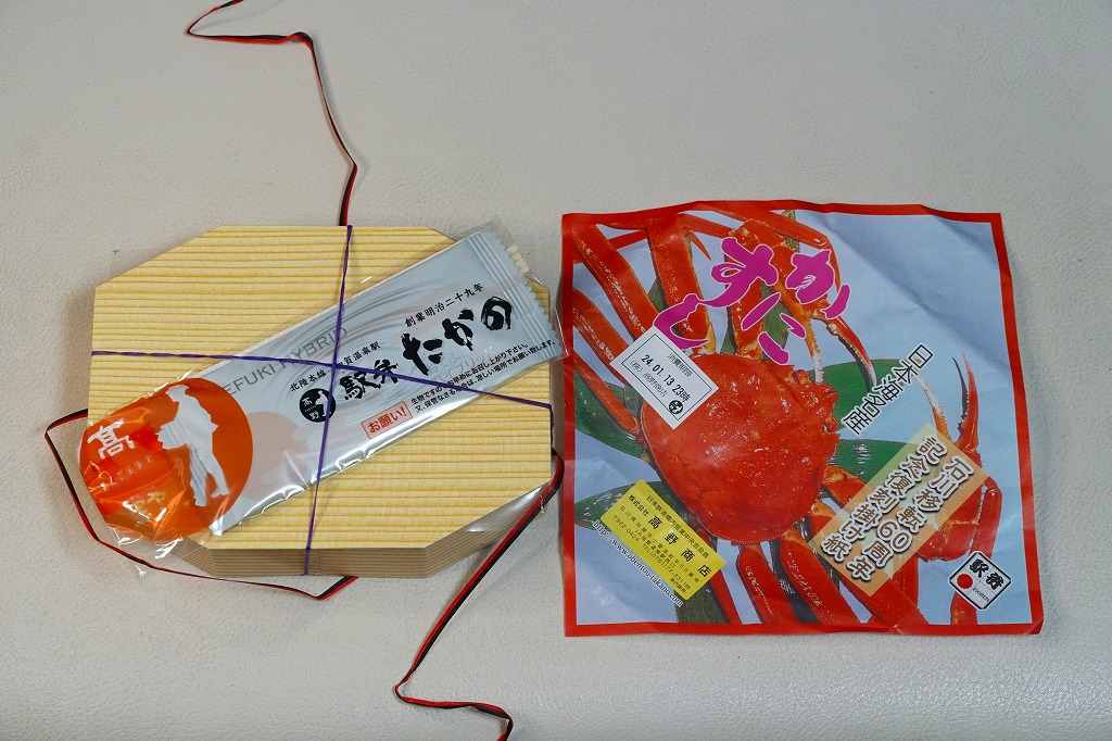 2024(令和6)年1月の京王百貨店の駅弁大会で輸送販売。この催事で、掛紙を復刻した駅弁「昭和レトロな掛け紙弁当」のひとつとして売られた。加賀温泉駅の名物駅弁「日本海名産かにすし」について、「石川移転60周年記念復刻掛け紙」と銘打ち、八角形の容器に普段のボール紙箱でなく掛紙をかけて販売した。絵柄は上記のとおり、現行のものと同じ。容器と中身と価格も同じ。「石川移転60周年」とは、調製元が福井県の今庄駅から石川県の大聖寺駅へ移転した1962(昭和37)年から起算したのだろうが、60年を一年半くらい過ぎており、その時に作った掛紙だろうか。