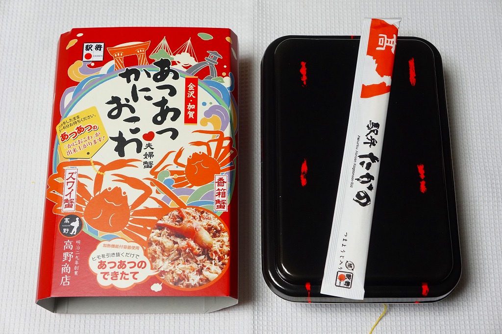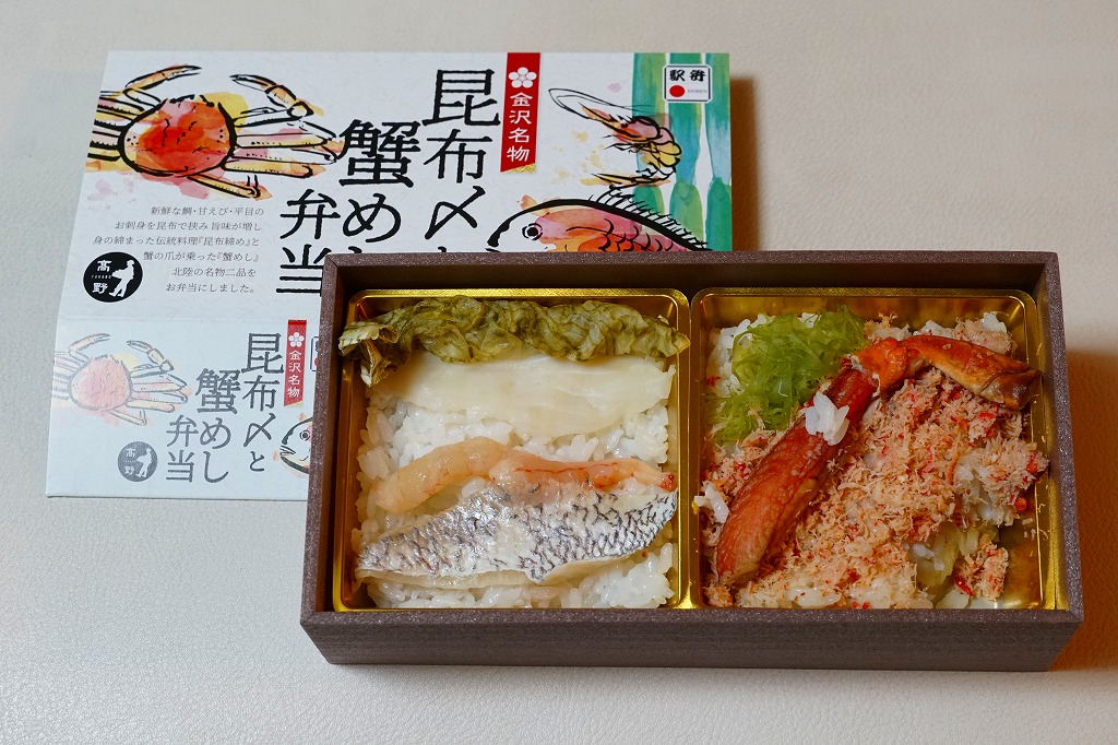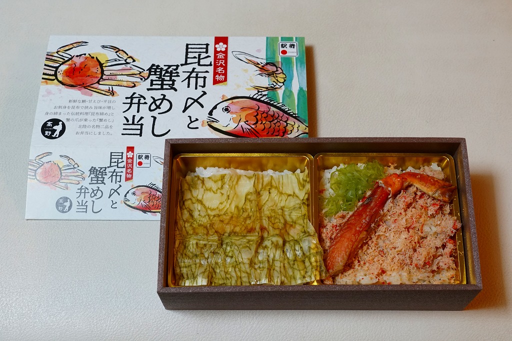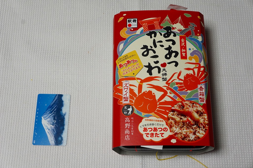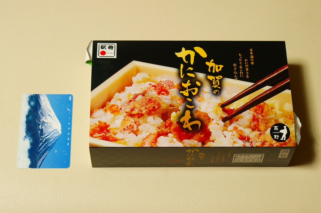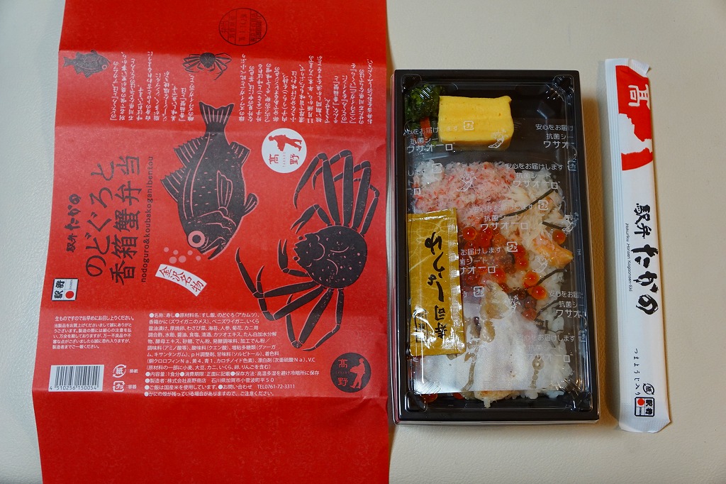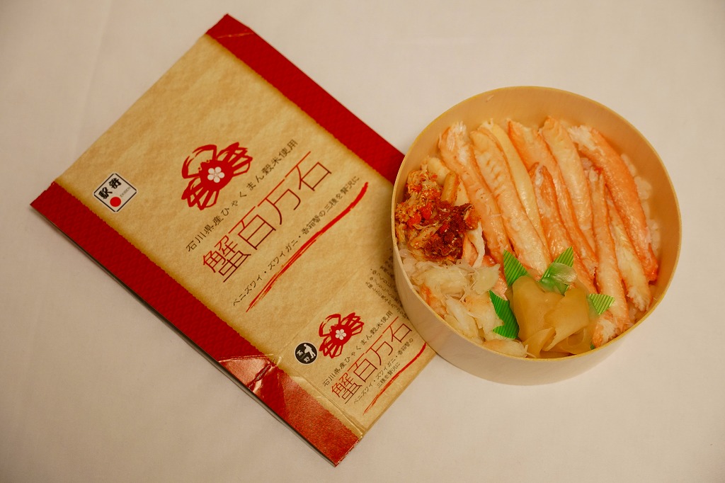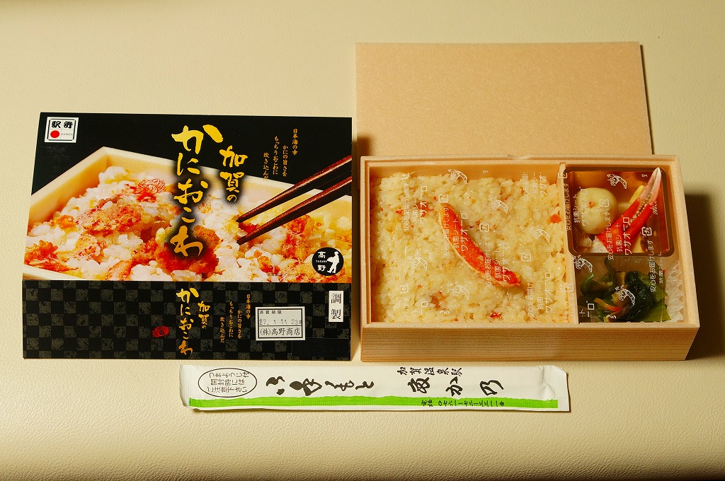 2018(平成30)年1月の京王百貨店の駅弁大会で販売。翌2月に金沢駅か加賀温泉駅で販売された模様。以後の存廃は不詳。長方形の加熱機能付き容器に茶飯を敷き、カニほぐし身で覆い、カニ爪を置き、ニンジンとサトイモと玉子焼を添える、古典的な内容のカニ駅弁。スリーブの絵柄のような派手さはなく、これも無難な安心感。値は張る。この冬限りで終売の模様。