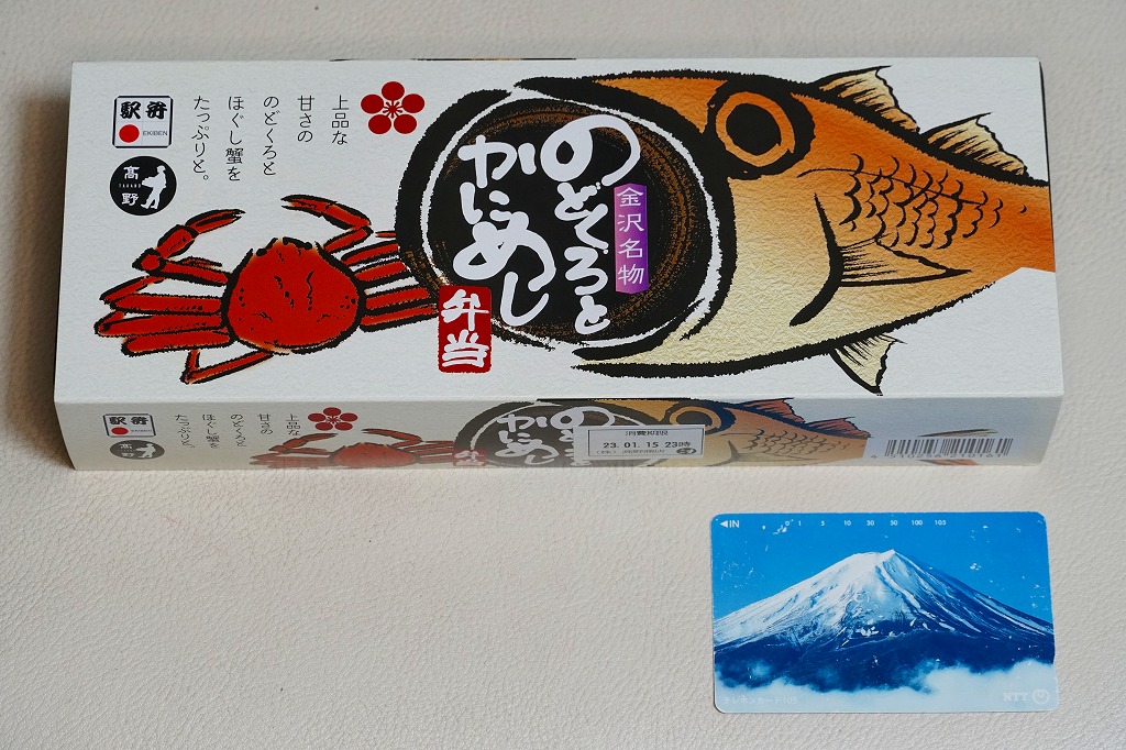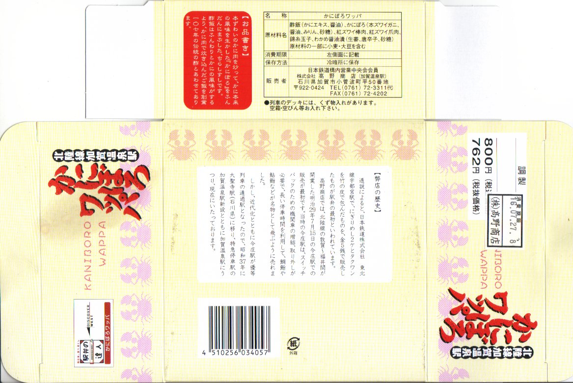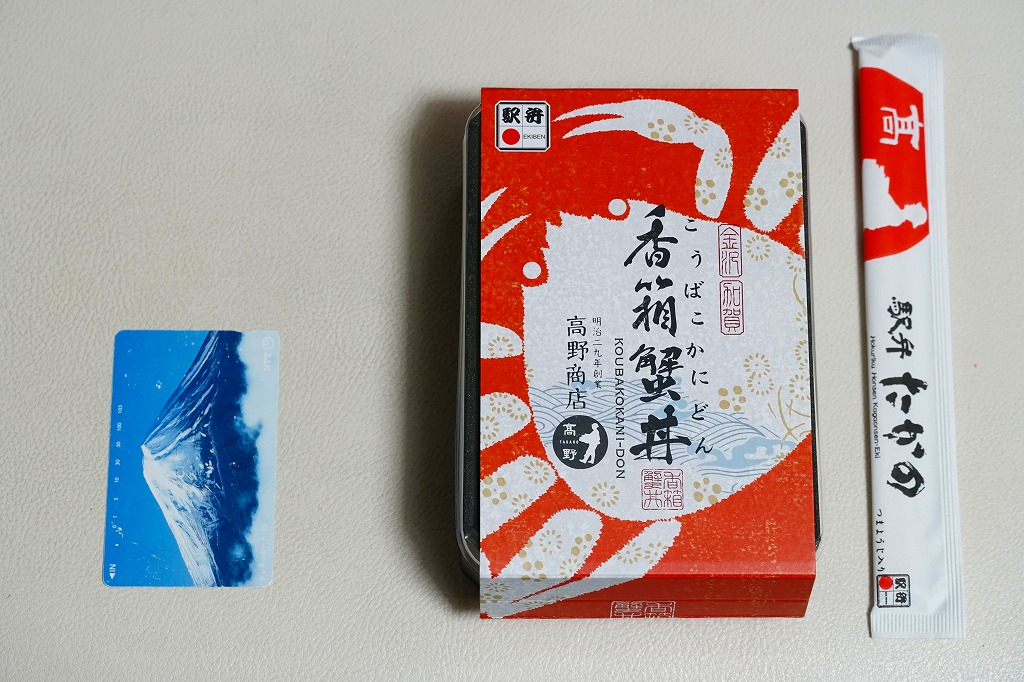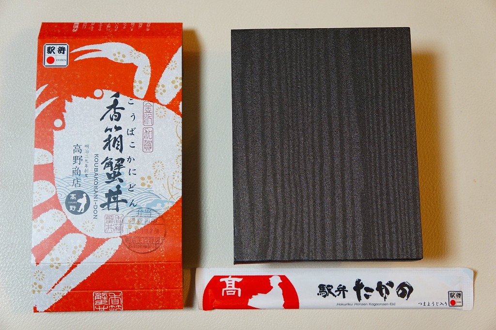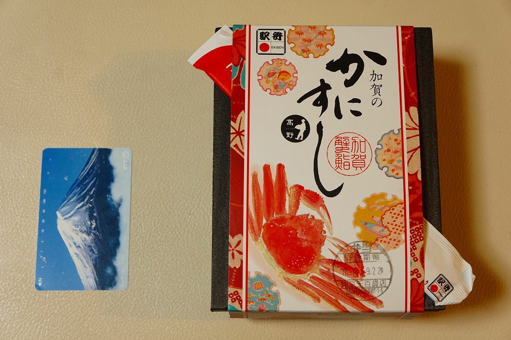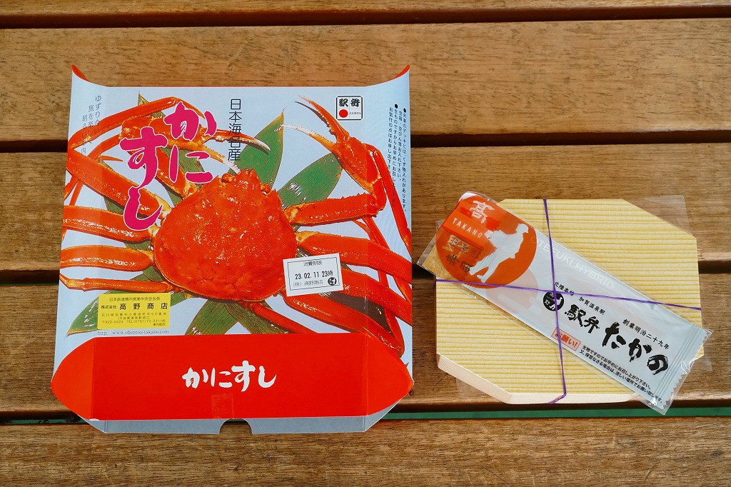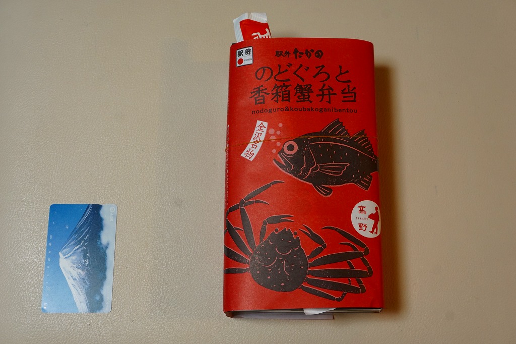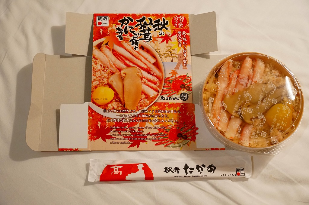 2018(平成30)年1月の京王百貨店の駅弁大会で販売。翌2月に金沢駅か加賀温泉駅で販売された模様。以後の存廃は不詳。長方形の加熱機能付き容器に茶飯を敷き、カニほぐし身で覆い、カニ爪を置き、ニンジンとサトイモと玉子焼を添える、古典的な内容のカニ駅弁。スリーブの絵柄のような派手さはなく、これも無難な安心感。値は張る。この冬限りで終売の模様。
