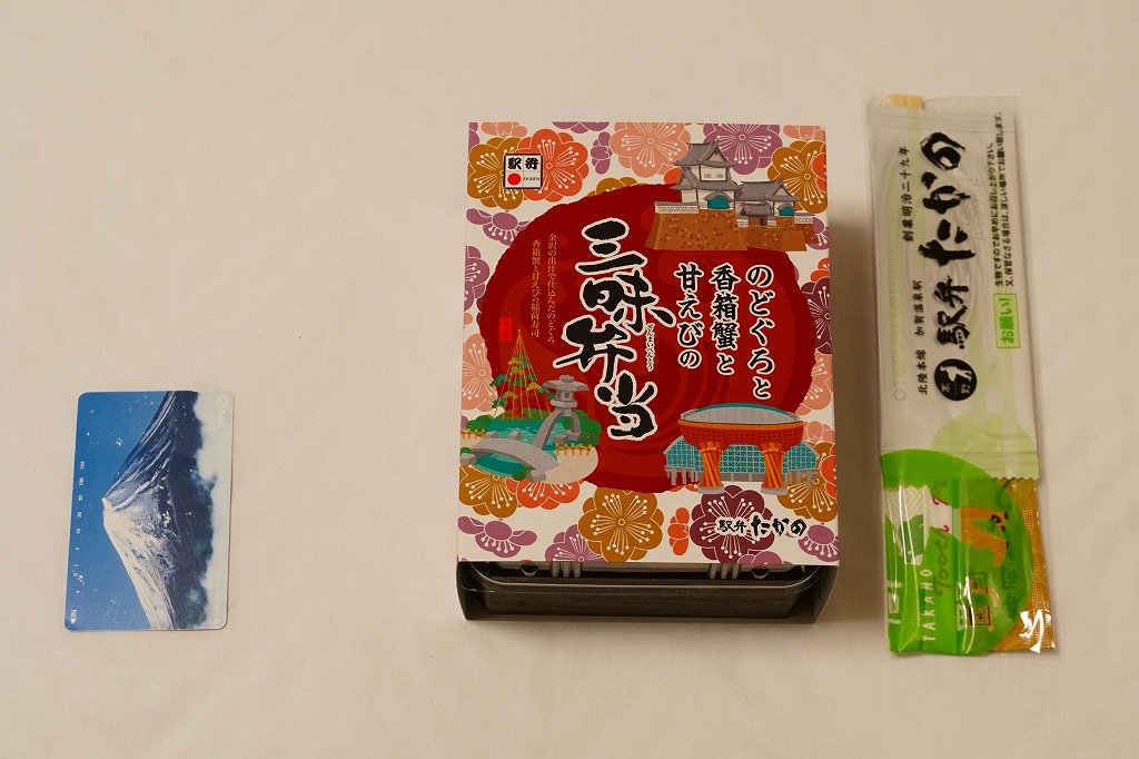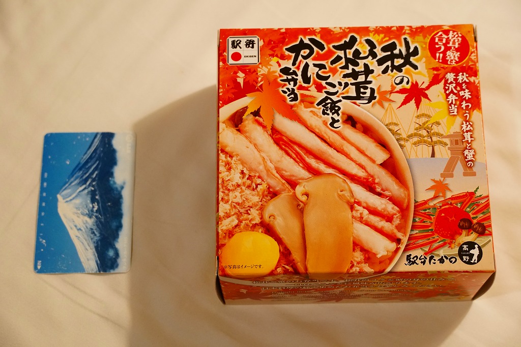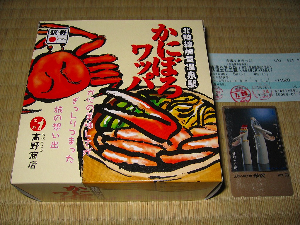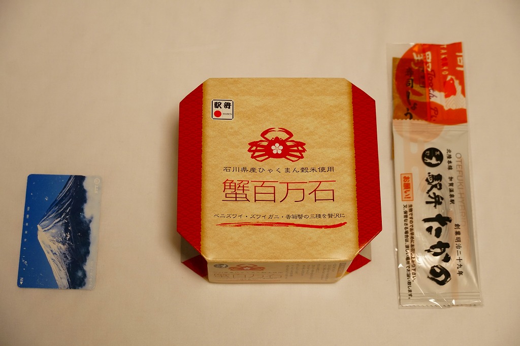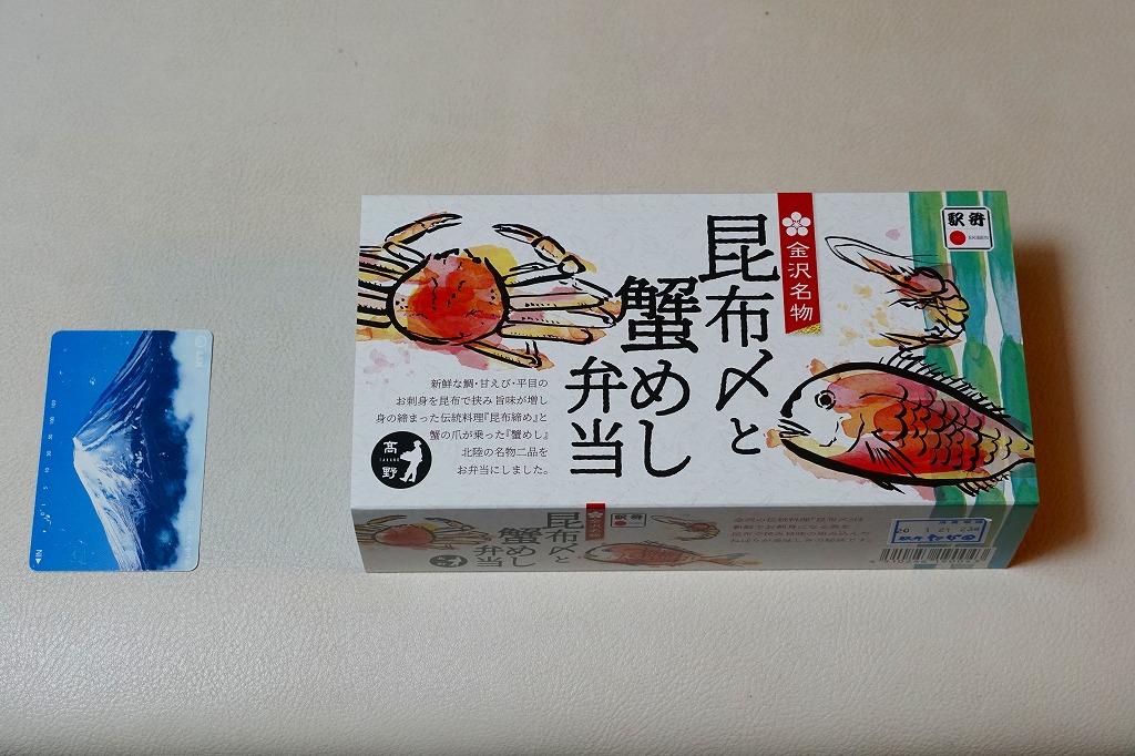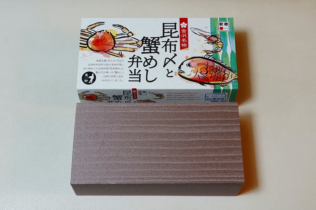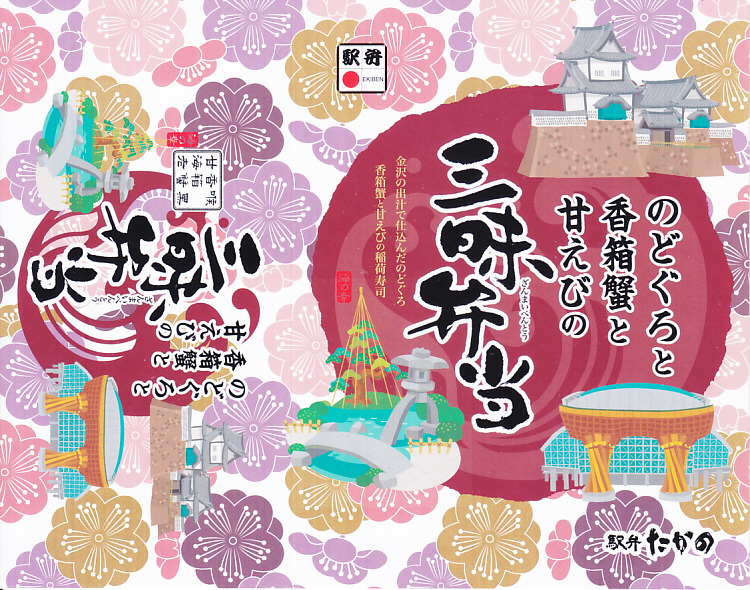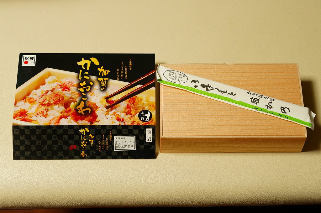 2018(平成30)年1月の京王百貨店の駅弁大会で販売。翌2月に金沢駅か加賀温泉駅で販売された模様。以後の存廃は不詳。長方形の加熱機能付き容器に茶飯を敷き、カニほぐし身で覆い、カニ爪を置き、ニンジンとサトイモと玉子焼を添える、古典的な内容のカニ駅弁。スリーブの絵柄のような派手さはなく、これも無難な安心感。値は張る。この冬限りで終売の模様。