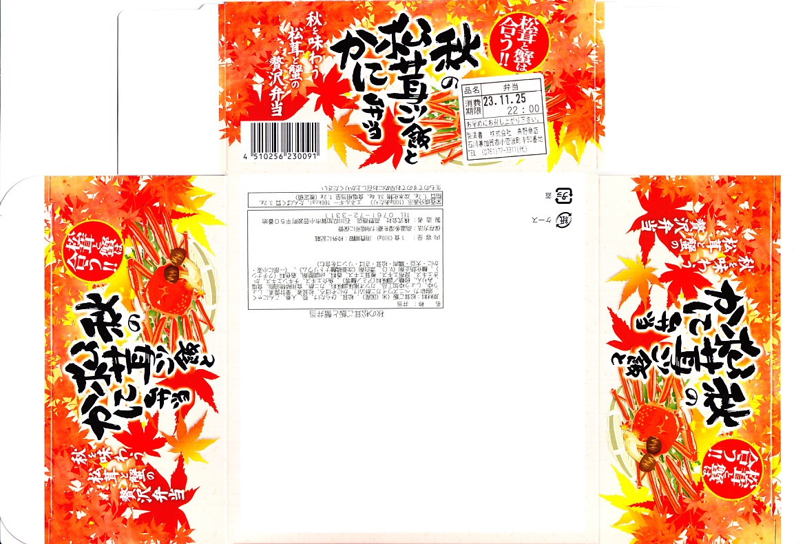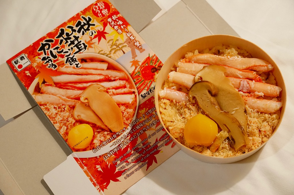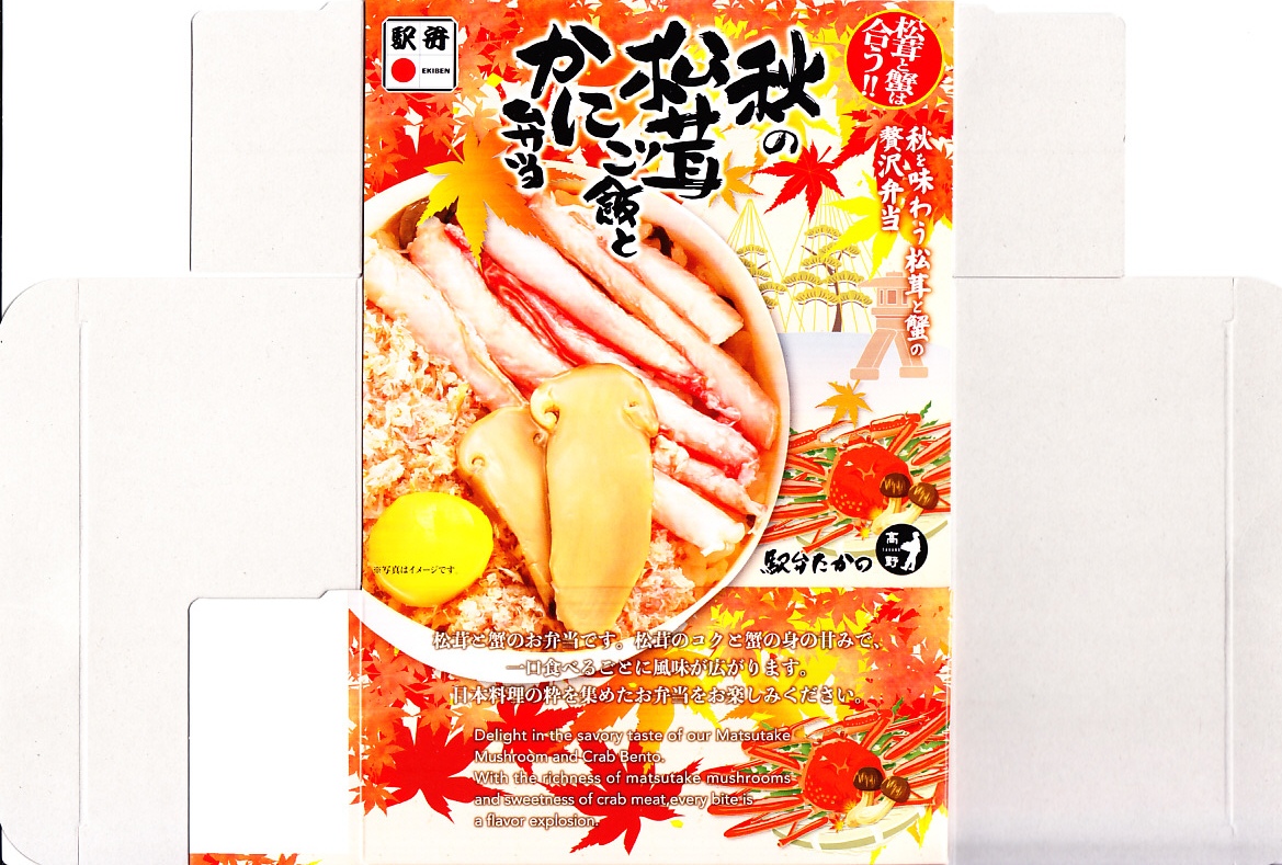 2023(令和5)年10月に金沢駅などで発売か。その名から秋の季節の駅弁だと思われる。中身の写真を紅葉とカニの赤で彩った絵柄の紙箱に収めた、丸いプラ容器に松茸ご飯を詰め、松茸煮のスライス、ベニズワイガニの棒肉の酢漬け、カニほぐし身、錦糸卵、栗甘露煮を載せて、透明なふたをする。クリはともかくカニと松茸と御飯が同じような味を持つように感じた丼もの。金沢駅の駅弁売り場に華を添える。