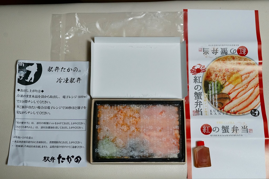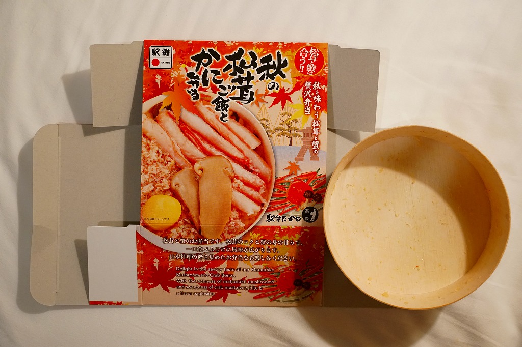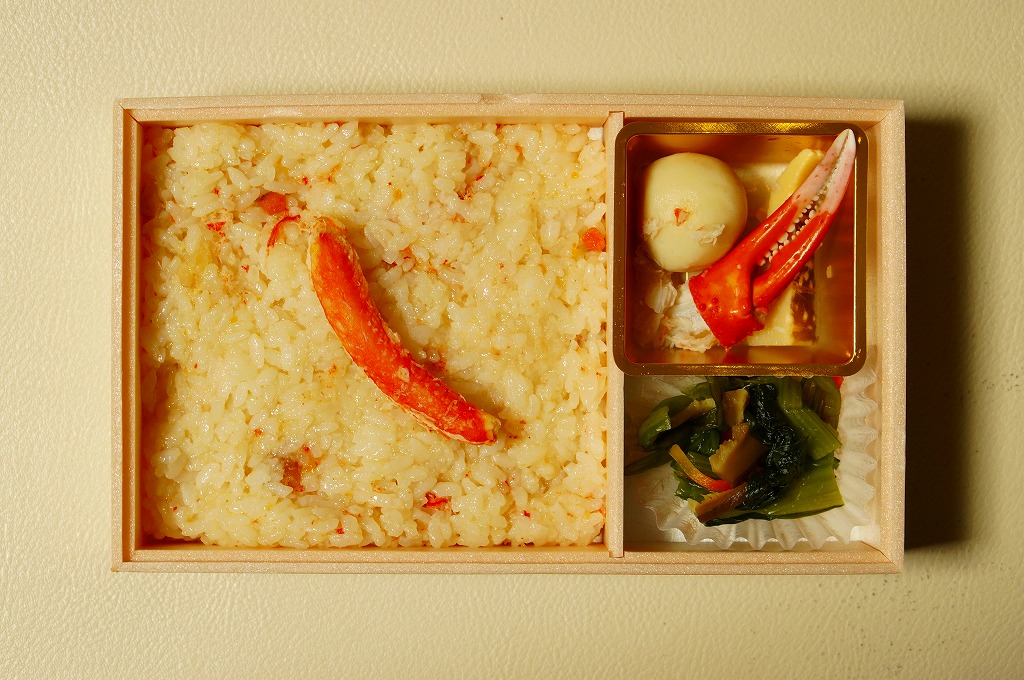 2014(平成26)年1月の京王百貨店の駅弁大会でデビューか。京王百貨店駅弁大会以外で売られたことはあるのだろうか。カニほぐし身を混ぜたおこわに、カニ脚肉を1本置いて、カニ爪、サトイモ、タケノコ、小松菜などを添える。見た目でも風味でもカニが控えめ過ぎる印象だが、これだけ水気豊かな柔らかさがあるおこわは、常温の弁当では初めての体験だった。翌2015年の京王百貨店の駅弁大会でも輸送販売されたが、何らかの理由で購入の翌日から来なくなってしまった。この時までの販売か。