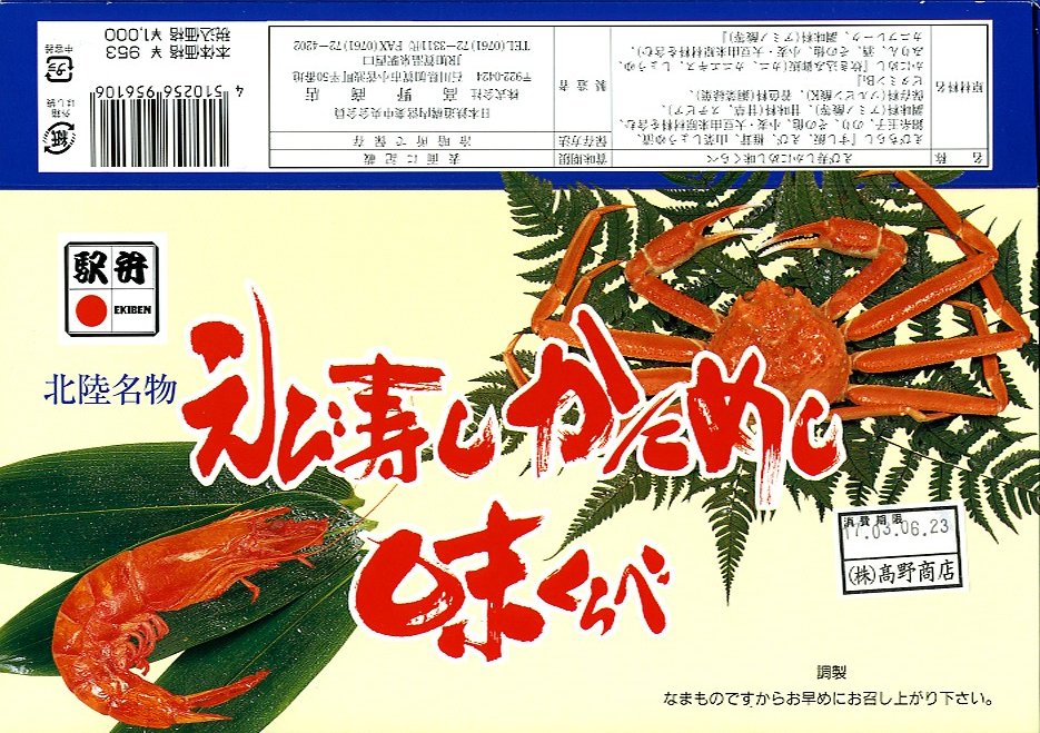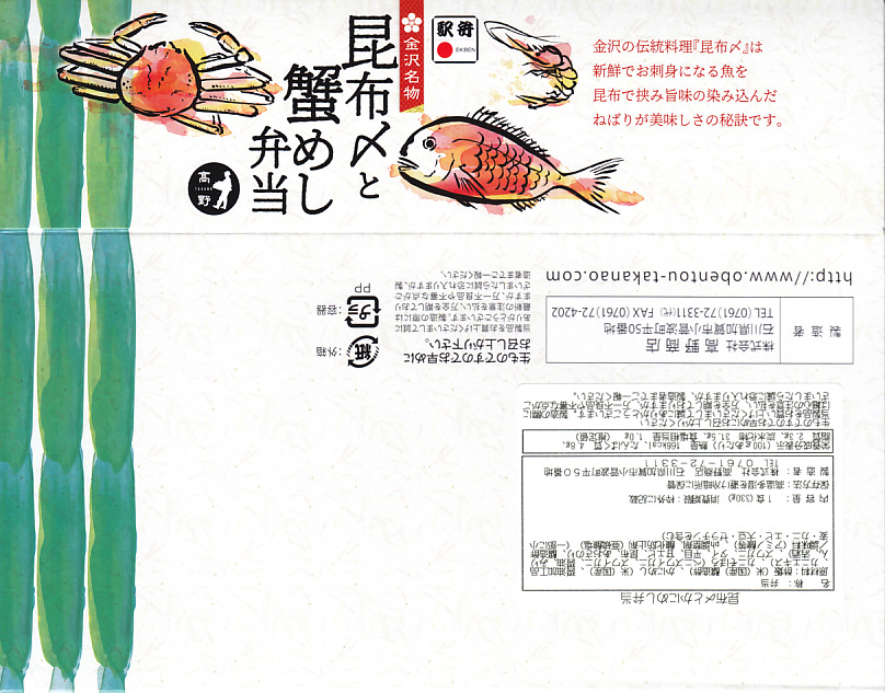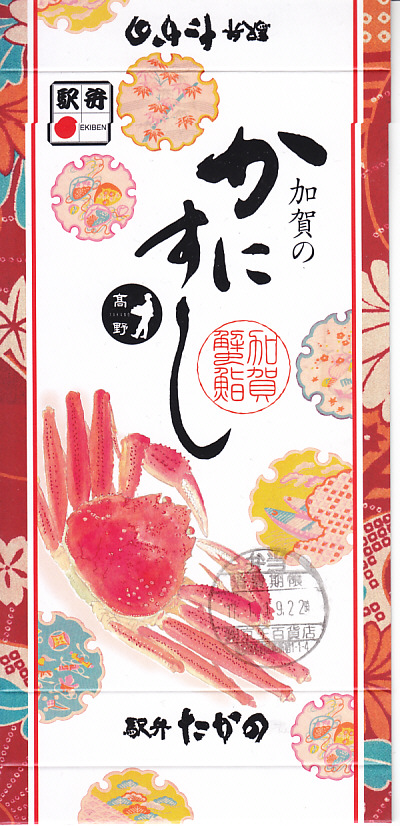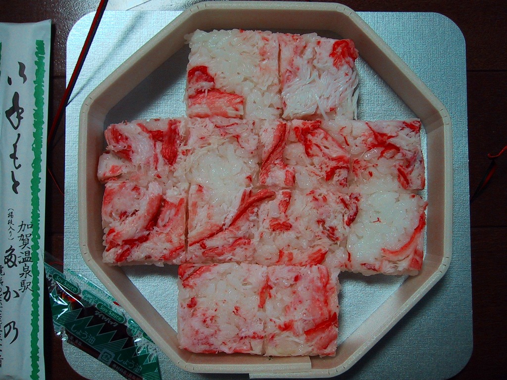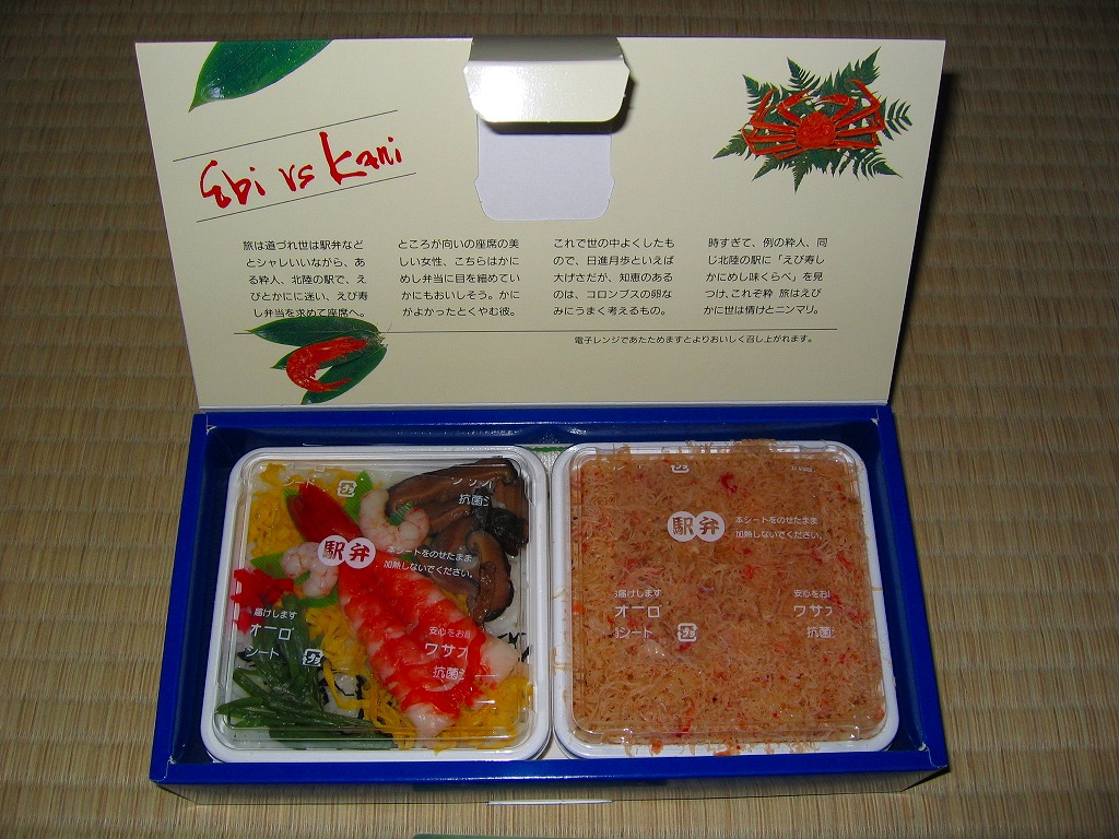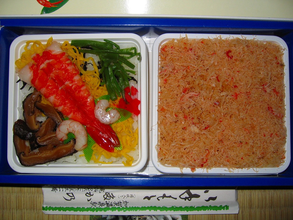 エビとカニを描いた正方形ふたつぶんのボール紙製容器を使用、ふたを開けると裏側に簡単なコラムが載る。その中にレンジ対応のプラ製食品トレーがふたつ入り、片方には酢飯の上に海老や山菜や椎茸が、もう片方には御飯の上に細かいカニほぐし身が、それぞれ載っている。いずれもしっかり硬く押されているのは加賀の伝統か。これに加えてプラ容器の形状により、中身の品質にかかわらず少々の味気なさを覚える。裏ぶたのコラムともども、何らかの強化策が欲しい感じ。2005年までの販売か。