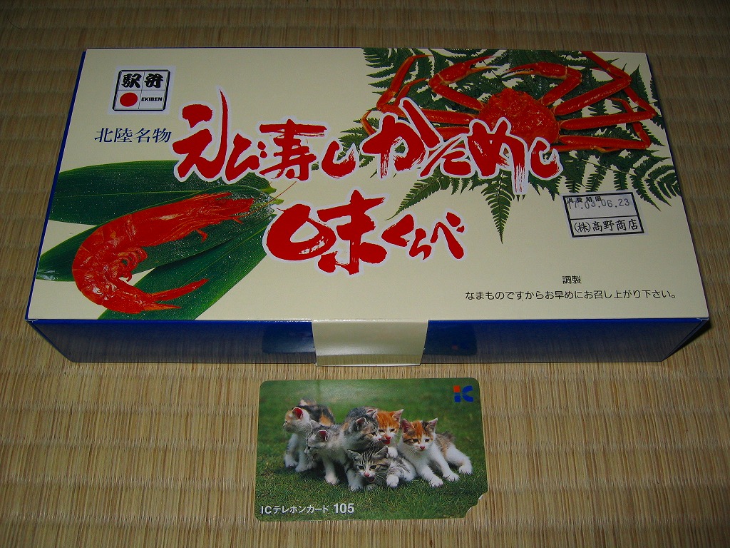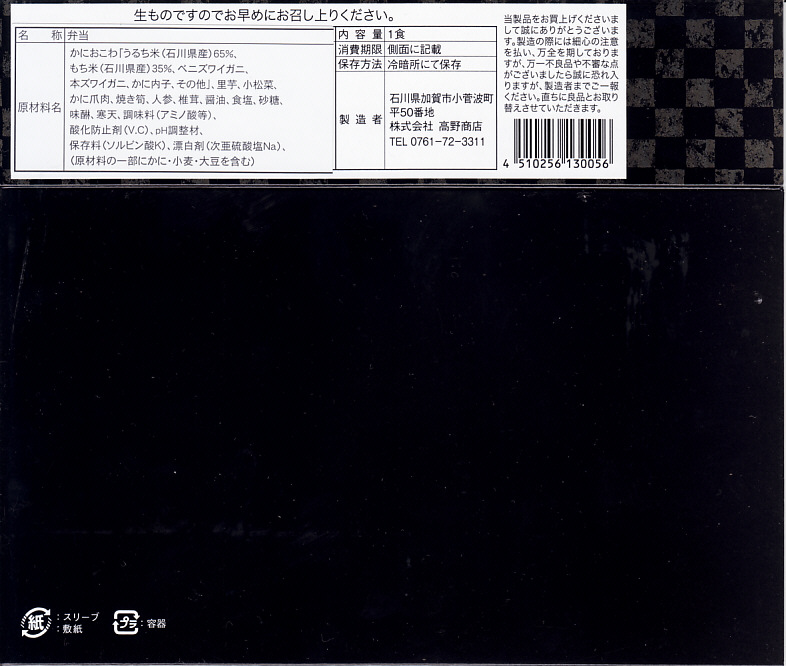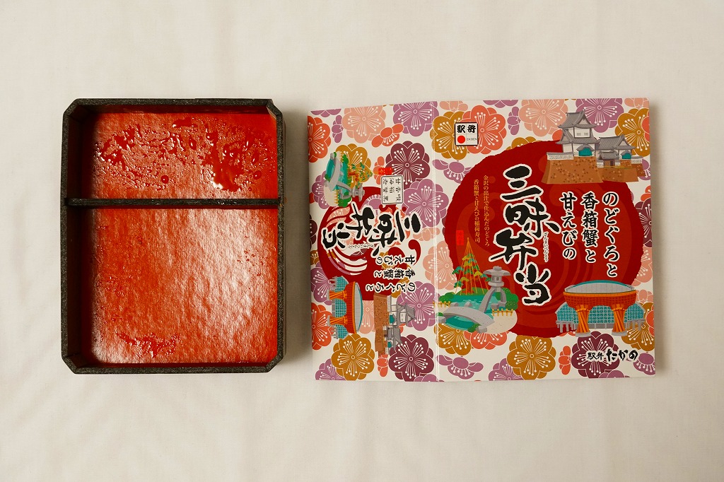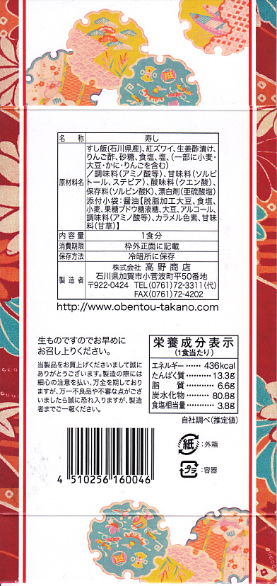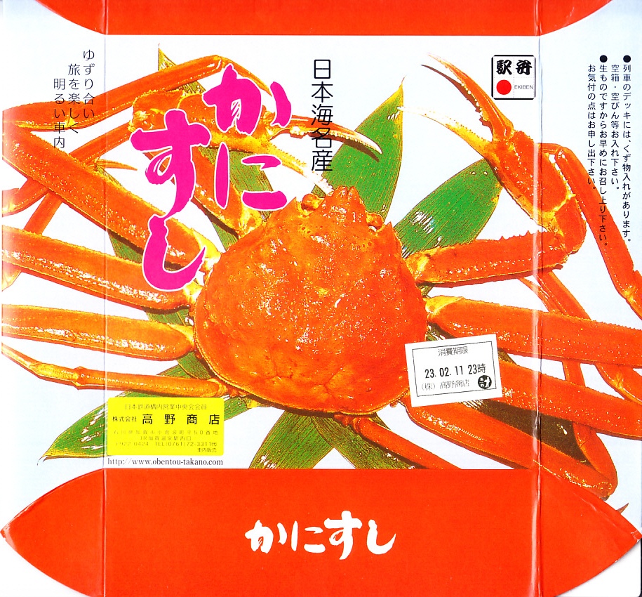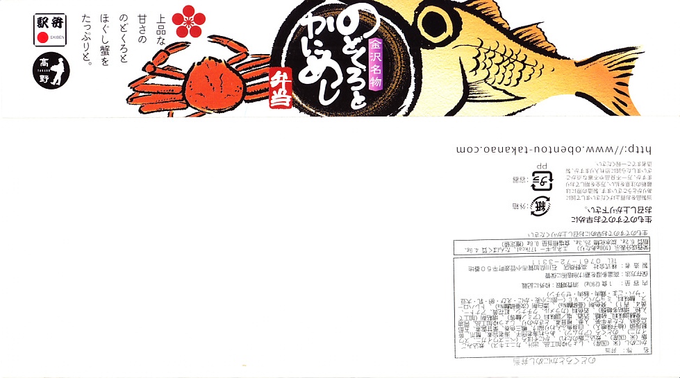 エビとカニを描いた正方形ふたつぶんのボール紙製容器を使用、ふたを開けると裏側に簡単なコラムが載る。その中にレンジ対応のプラ製食品トレーがふたつ入り、片方には酢飯の上に海老や山菜や椎茸が、もう片方には御飯の上に細かいカニほぐし身が、それぞれ載っている。いずれもしっかり硬く押されているのは加賀の伝統か。これに加えてプラ容器の形状により、中身の品質にかかわらず少々の味気なさを覚える。裏ぶたのコラムともども、何らかの強化策が欲しい感じ。2005年までの販売か。
