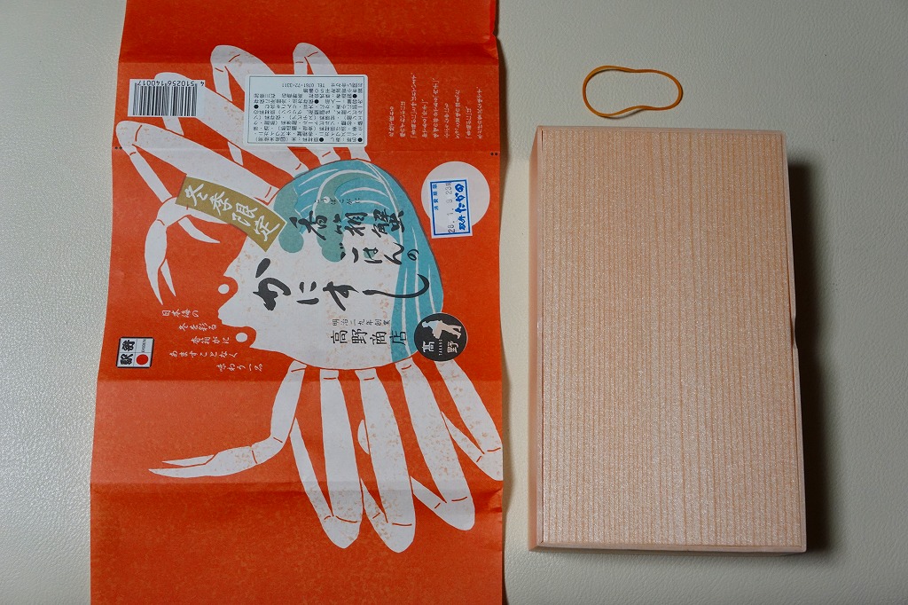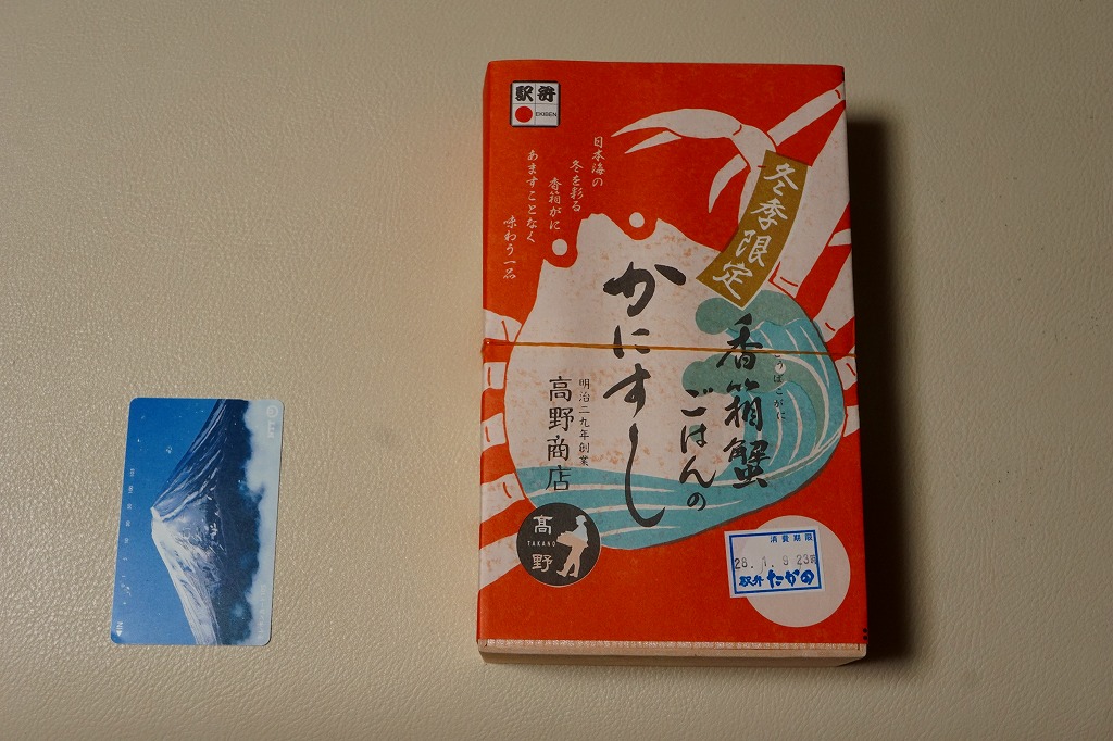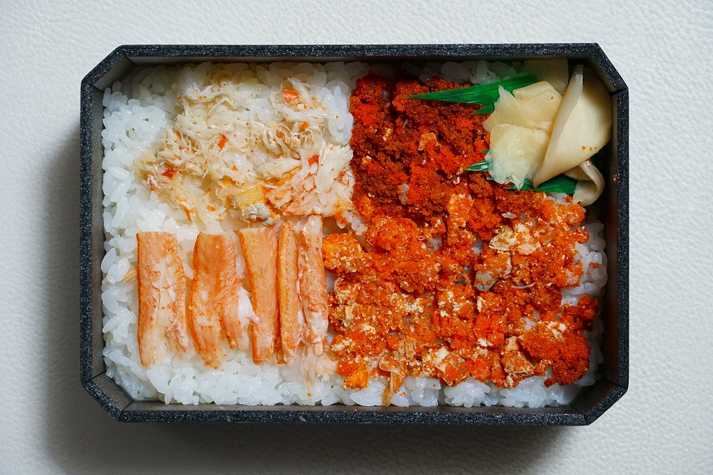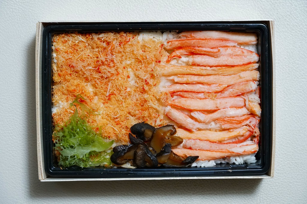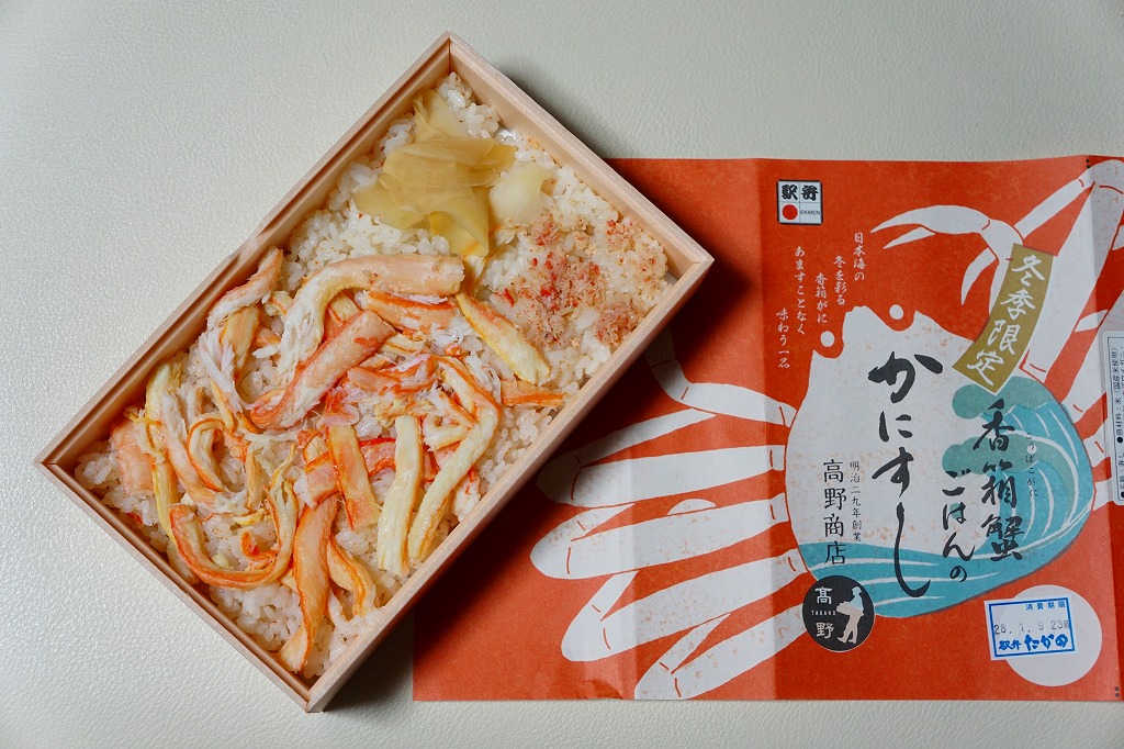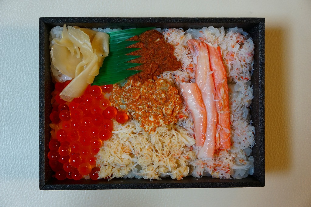 2017(平成29)年1月の京王百貨店の駅弁大会でデビューか。四角い容器に酢飯を詰め、ベニズワイガニの脚肉とほぐし身、香箱蟹の内子と外子のペースト、いくら、ガリで覆う。珍味の味と香りが自然に生きている感じを受け、落ち着きのある良い駅弁だと思った。ただ、めったに売られない商品であるかもしれない。この冬限りで終売か。2021年に中身と値段を変えて再発売か。
