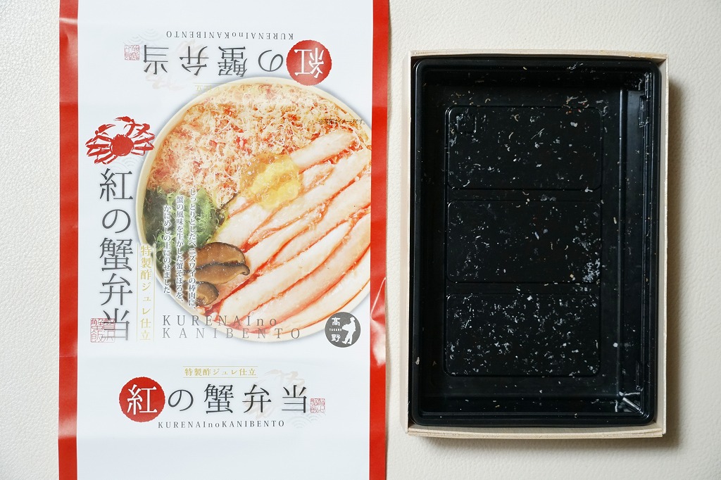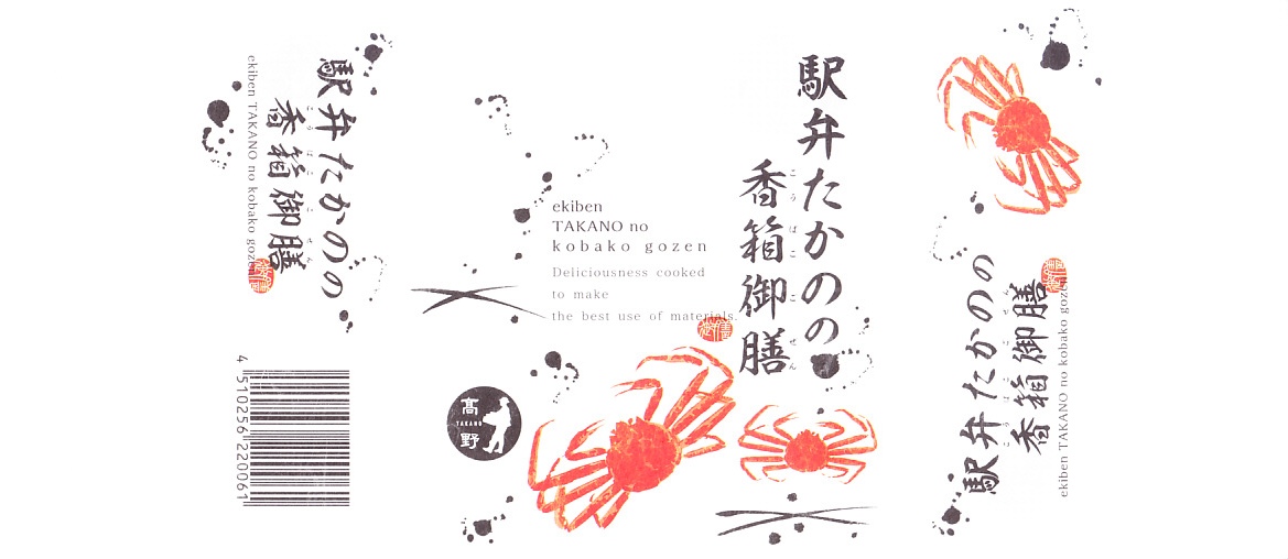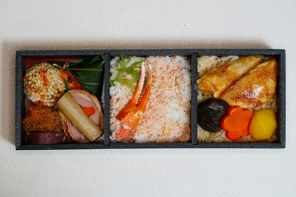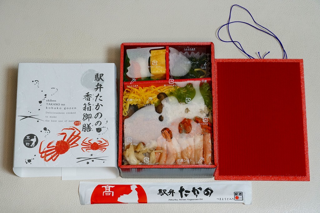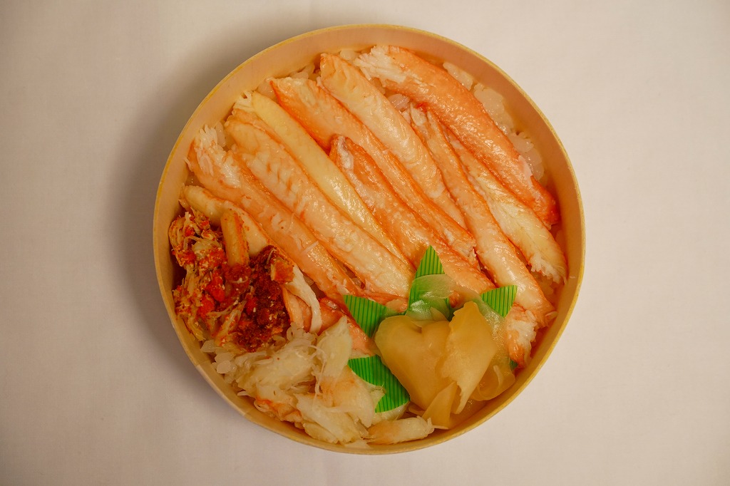 2023(令和5)年1月の京王百貨店の駅弁大会で実演販売。小柄で四角い容器に飯を詰め、蟹の脚肉、腹肉、ほぐし、内子を「ふんだんに」載せ、バイ貝と椎茸と海藻と錦糸卵で補い、玉子焼と煮物と青菜を添える。見た目でも詰め方でも、催事場のカニ弁当らしからぬ上品さを感じるが、香箱蟹やその内子が高価なのだろう、3000円以上の高額商品となり、催事場で苦戦していたようにみえた。
