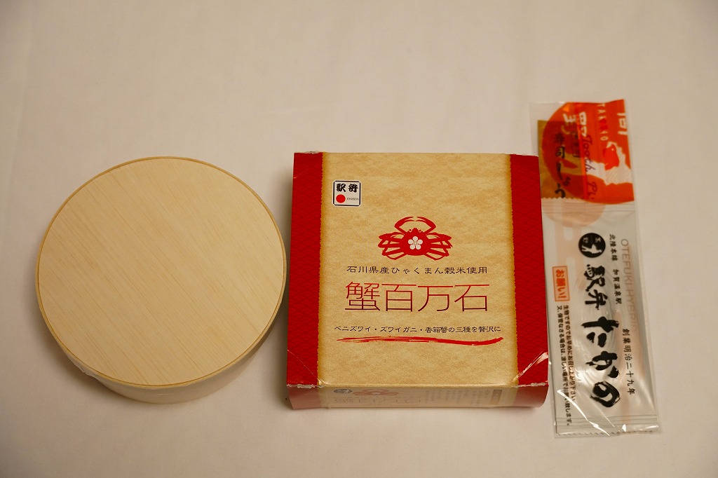 2019(平成31)年1月1日に金沢駅と加賀温泉駅で発売。駅弁の名前は江戸時代の加賀版の石高に由来する加賀百万石から来ているのではないかと思ったら、2017(平成29)年発売の石川県産米「ひゃくまん穀」の宣伝文がスリーブにあり、こちらのほうが由来かもしれない。中身は円形の容器に酢飯を敷き、ベニズワイガニの棒肉、ズワイガニのほぐし身、香箱蟹(ズワイガニのメス)の内子や外子などの和え物で覆うもの。つやつやのカニ脚と蟹ほぐし身に、濃厚な香箱蟹で、柔らかくてきれいなカニ丼。