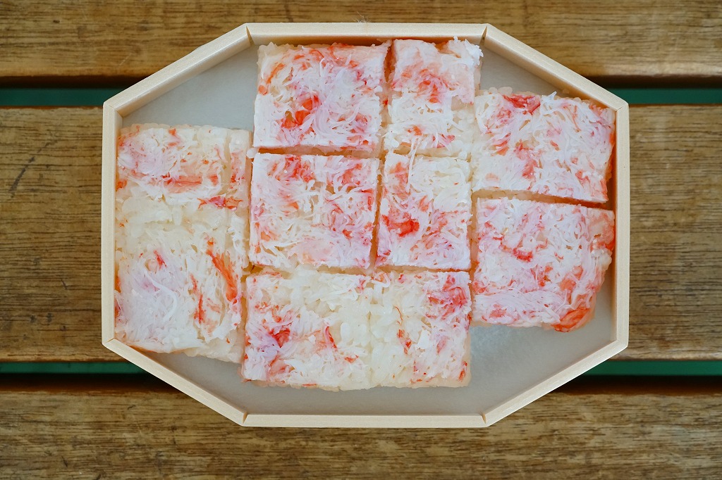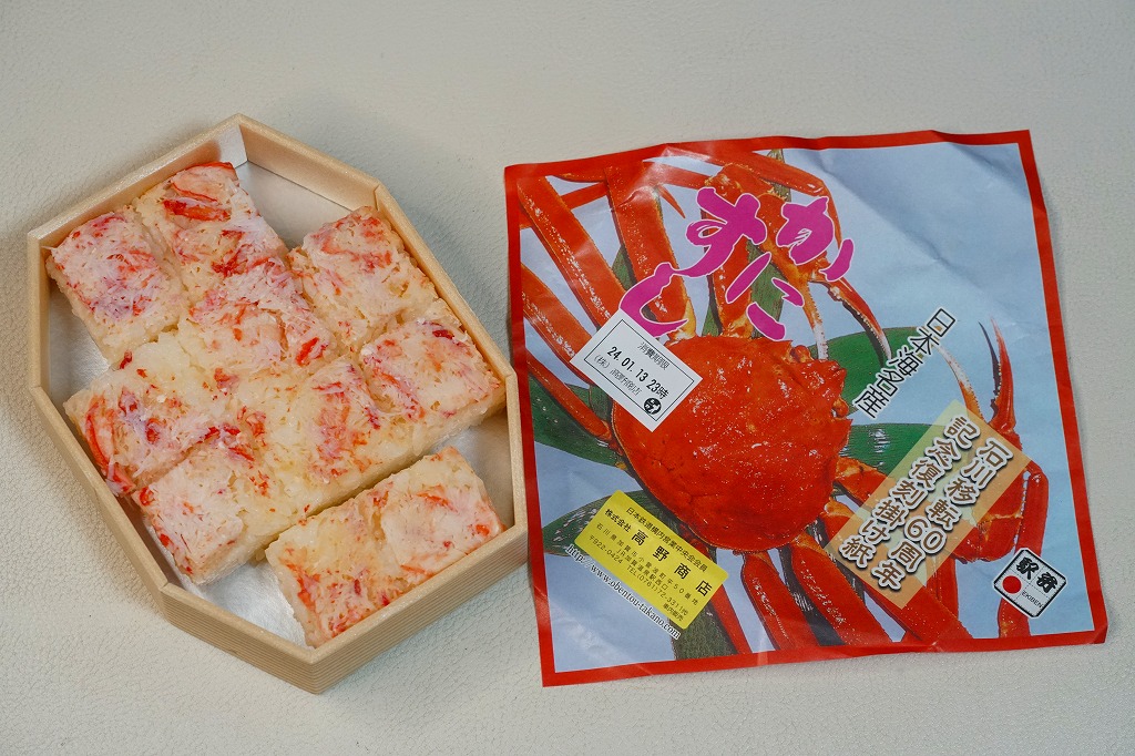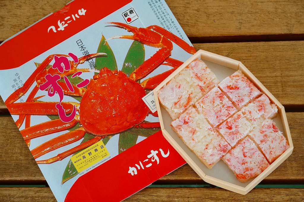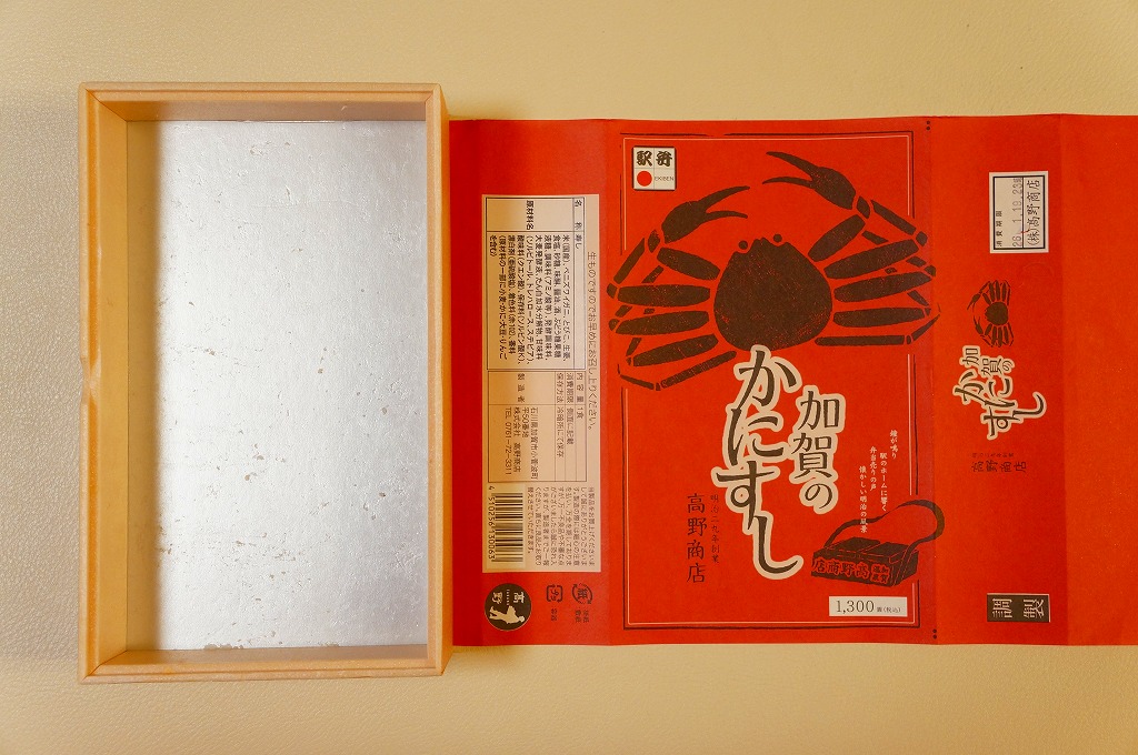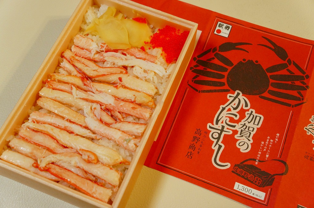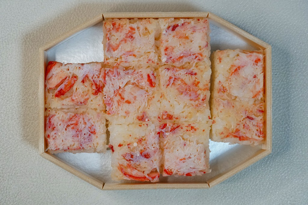 1970(昭和45)年頃の発売、10月から6月までの販売。八角形の小箱を、真っ赤なカニを大きく描いた箱に収め、その裏面は「加賀温泉駅を中心とした観光案内図」となる。中身は酢飯にベニズワイガニのほぐし身を塗ったような押寿司が、ひとくちサイズの正方形で10個並ぶもの。この内容は加賀よりはむしろ、越前地方に独特のタイプ。価格は2003年時点で1,000円、2015年時点で1,080円、2019年時点で1,150円、2023年時点で1,350円。