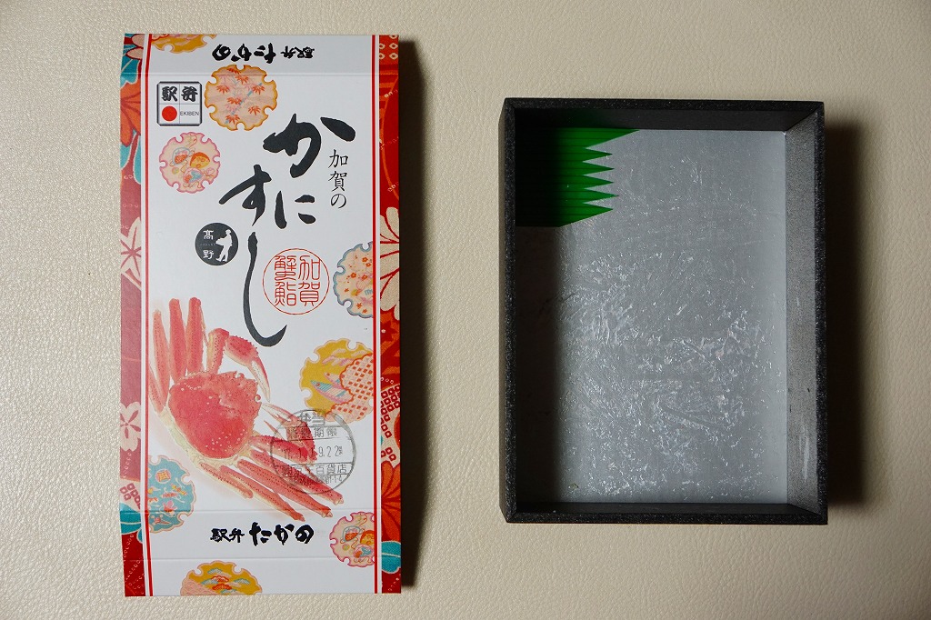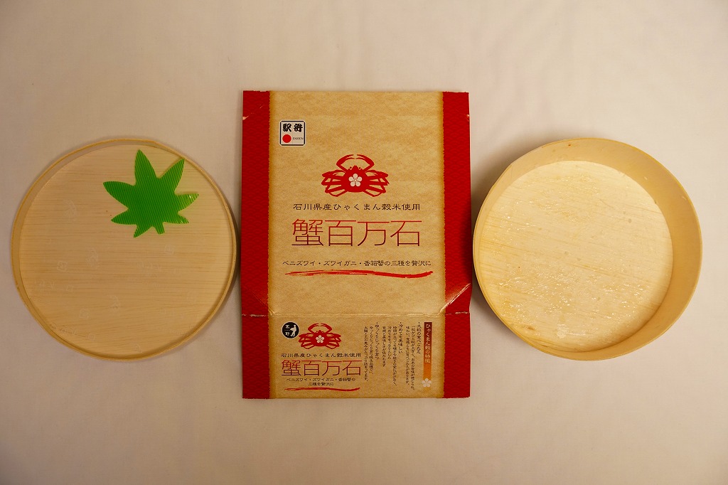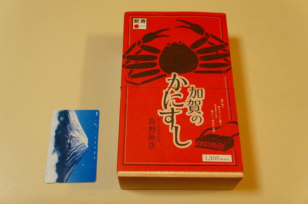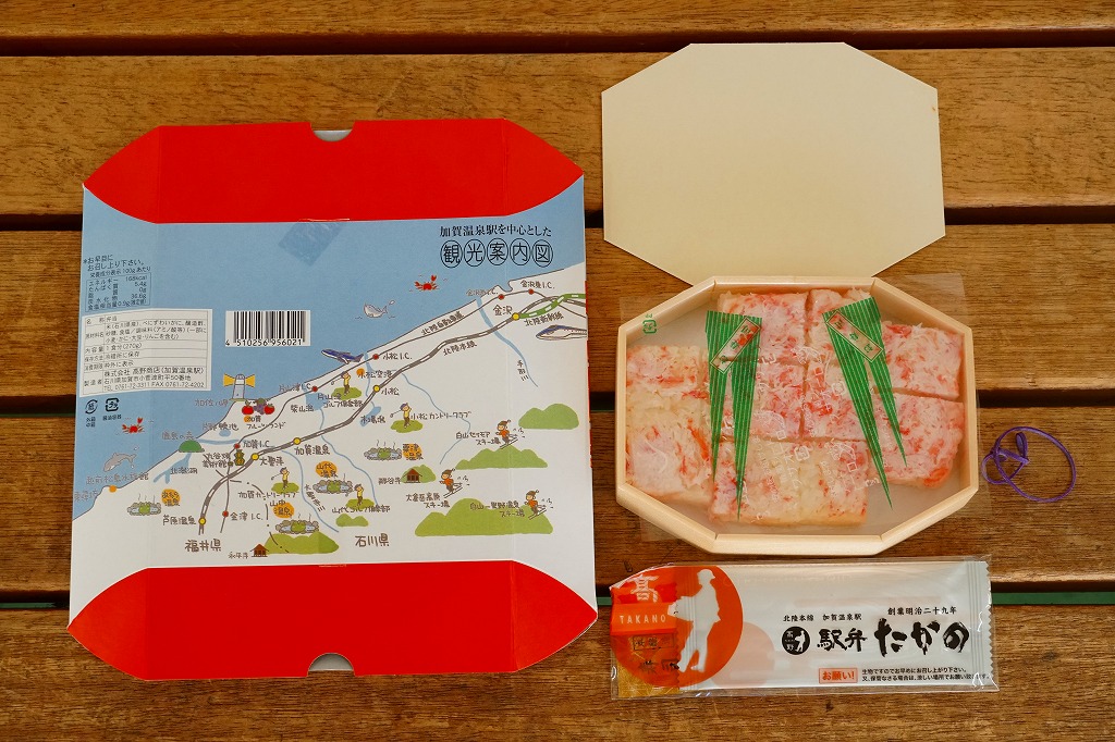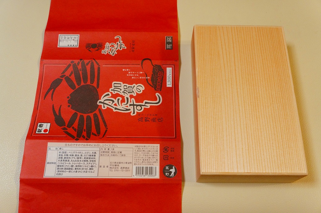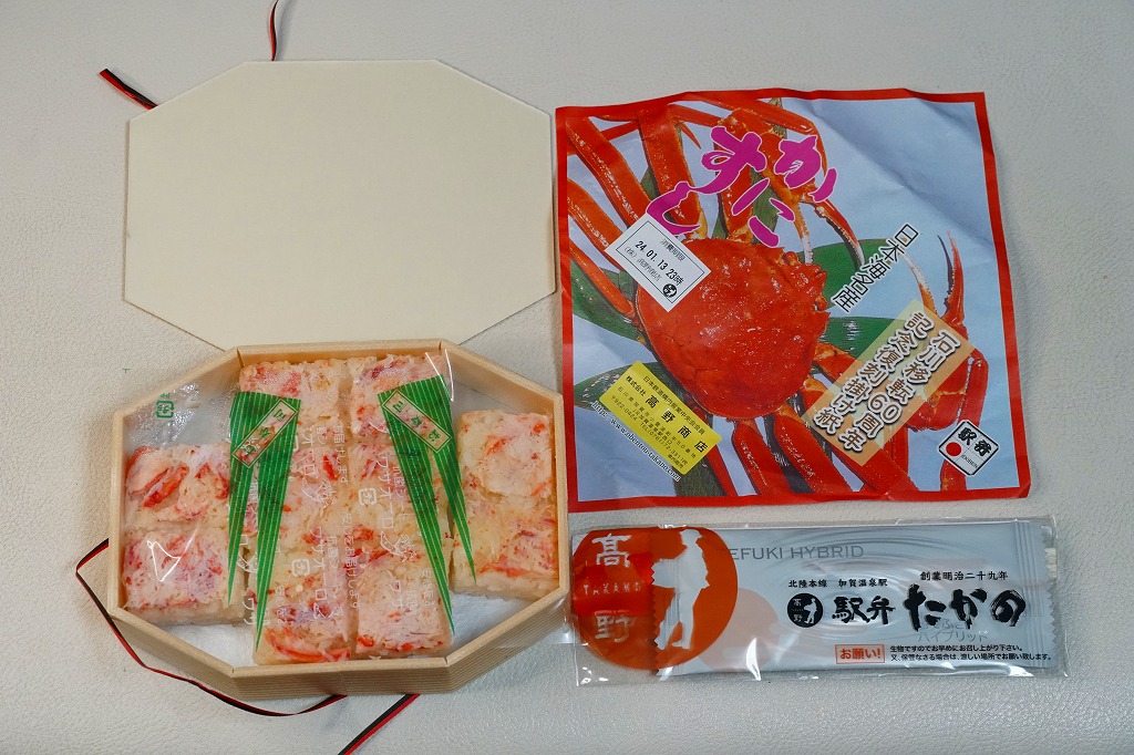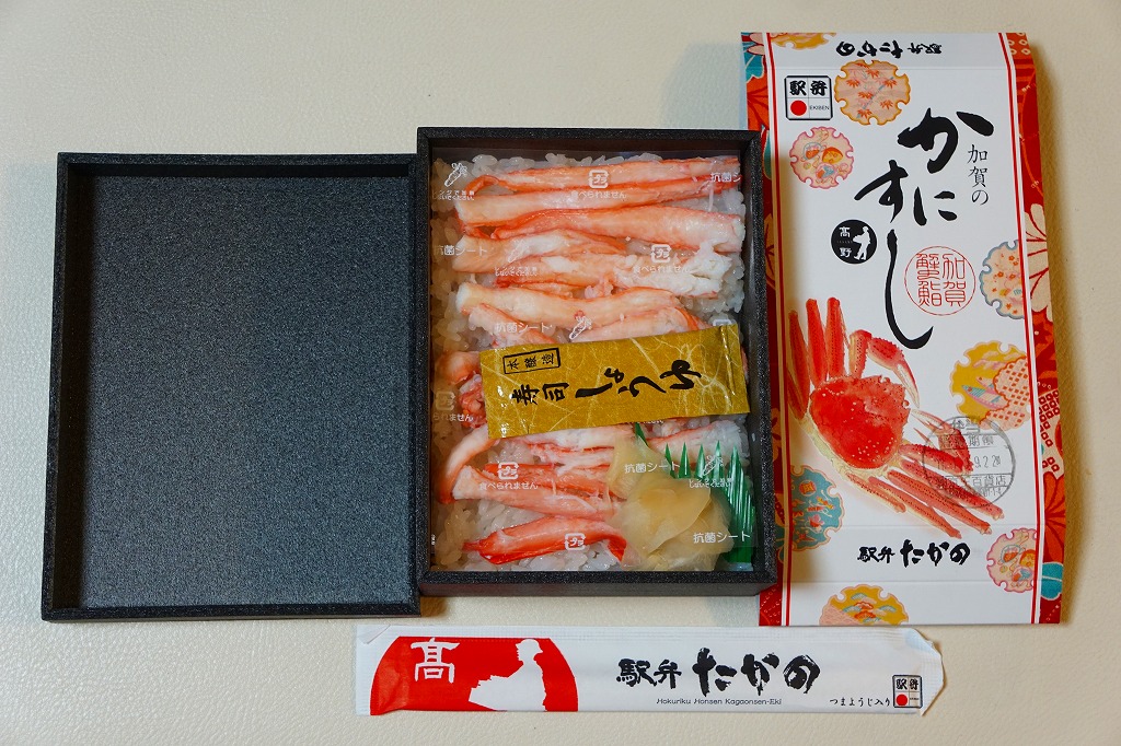1970(昭和45)年頃の発売、10月から6月までの販売。八角形の小箱を、真っ赤なカニを大きく描いた箱に収め、その裏面は「加賀温泉駅を中心とした観光案内図」となる。中身は酢飯にベニズワイガニのほぐし身を塗ったような押寿司が、ひとくちサイズの正方形で10個並ぶもの。この内容は加賀よりはむしろ、越前地方に独特のタイプ。価格は2003年時点で1,000円、2015年時点で1,080円、2019年時点で1,150円、2023年時点で1,350円。