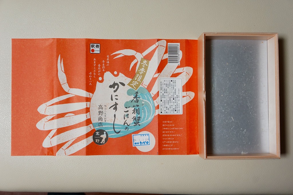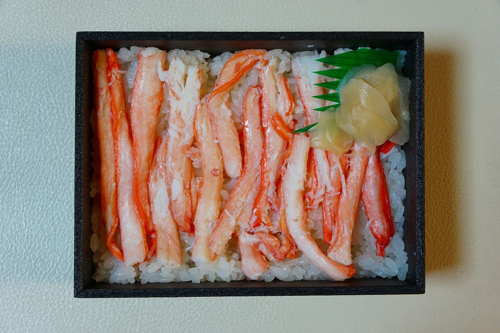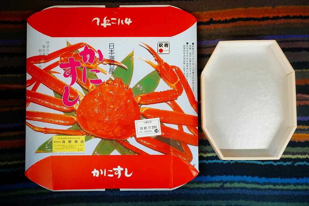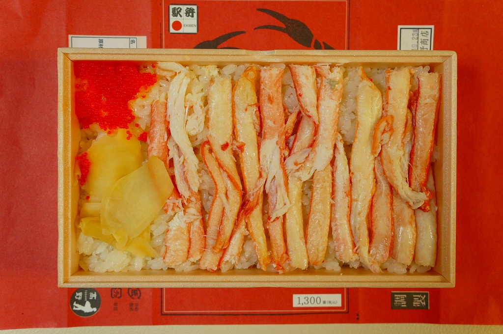 2014(平成26)年1月の京王百貨店の駅弁大会でデビューか。四角い容器いっぱいに甘い酢飯を詰め、カニ脚肉を同じ方向にとにかく並べ、甘酢生姜を添え、カニが華やかな絵柄の掛紙で包む。カニ脚は細身のベニズワイガニなので、豪華さや派手さは催事場の北海道駅弁に負けるが、そのツヤと香り、そしてカニをたくさん食べたなという満足感では負けない。カニの味と香りが自然に生きている感じを受け、落ち着きのある良い駅弁だと思った。価格は2014年の発売時で1,350円、2017年の購入時で1,200円、2019年時点で1,250円、2023年時点で1,380円。