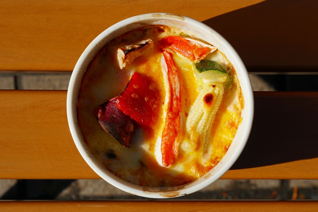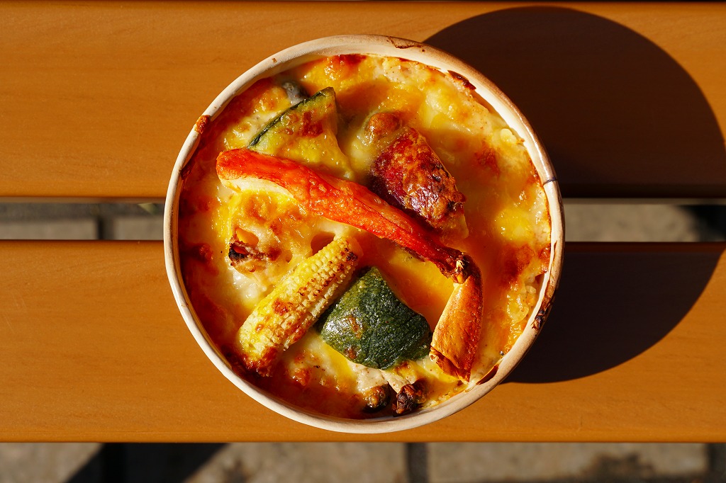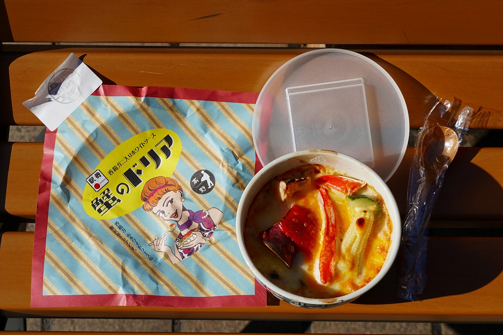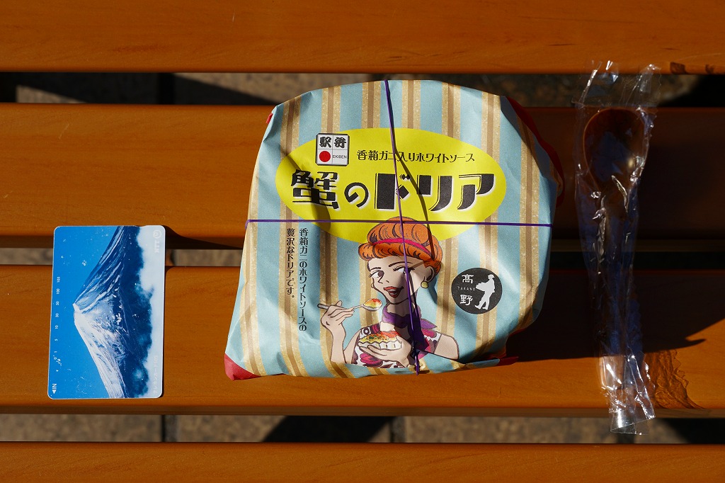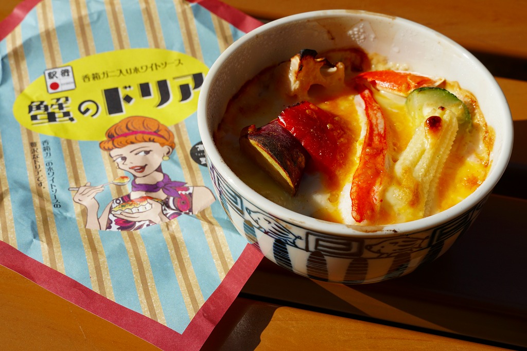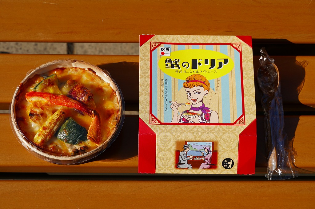 2019(平成31)年1月1日に金沢駅と加賀温泉駅で発売。同月の京王百貨店の駅弁大会での実演販売でデビュー。ドリアの駅弁など、他に聞いたことがない。ズワイガニやベニズワイガニのカニ飯に、香箱蟹(ズワイガニのメス)入りのホワイトソースをかけ、カニ脚、ズッキーニ、さつまいも、赤パプリカ、レンコン、ヤングコーン、しめじを散らし、チーズをかけてオーブンで焼く。これは冷めてもおいしいカニドリア。とてもユニークな駅弁が出てきたものだと思う。2022年までの販売か。