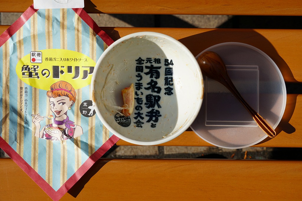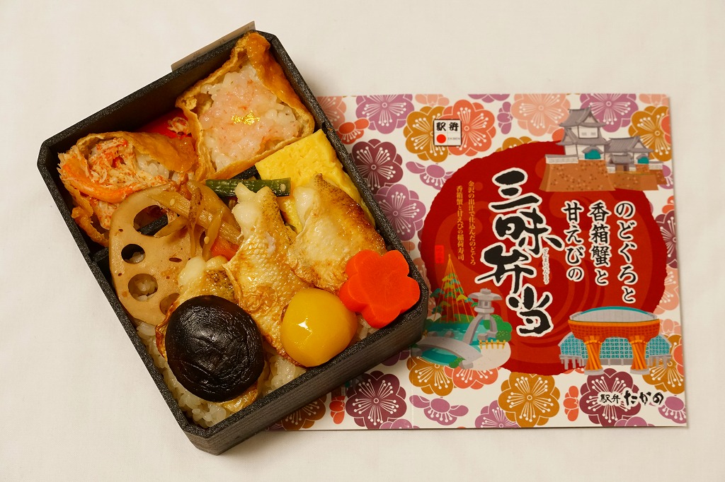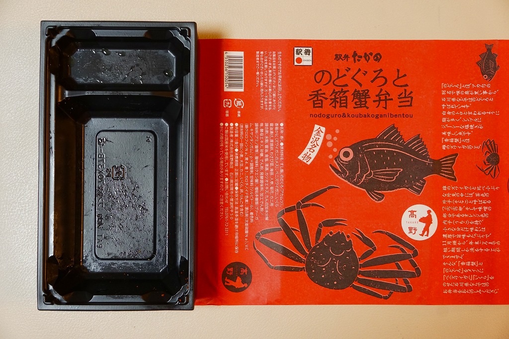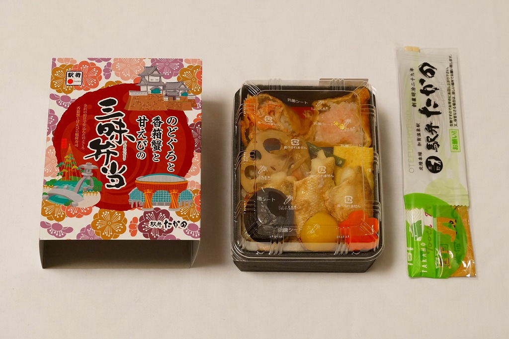この駅弁大会での駅弁の実演販売では、最も長い行列を作っていたと見える。脂がほどほどに豊かなノドグロの切り身焼きが良いおかずになり、香箱蟹の味噌と卵と身がまた良い滋味を出し、しかしいずれも単品や大量に入れると食べていて飽きが来ると思うので、百貨店の公式ブログで紹介するとおりの「ベストマッチ!」。なお、今回買った品は、新作を大量に製造していたからか、具の詰め方が雑だったと思う。価格は2016年の発売時で1,600円、2019年時点で1,700円。2020年までに終売か。