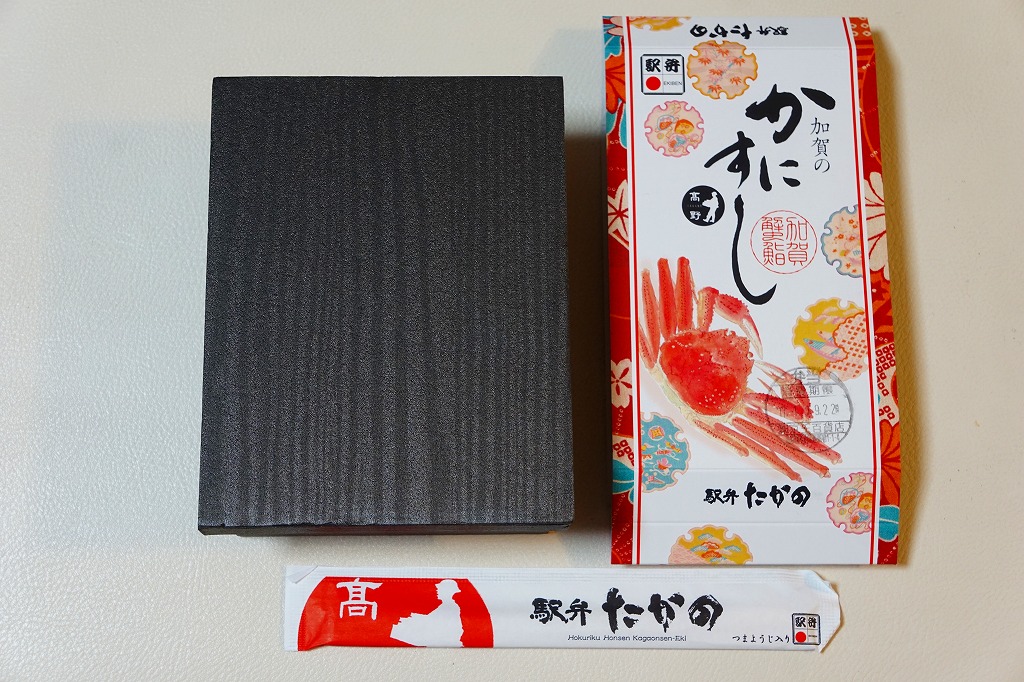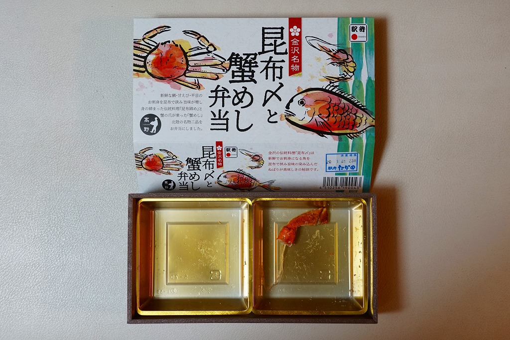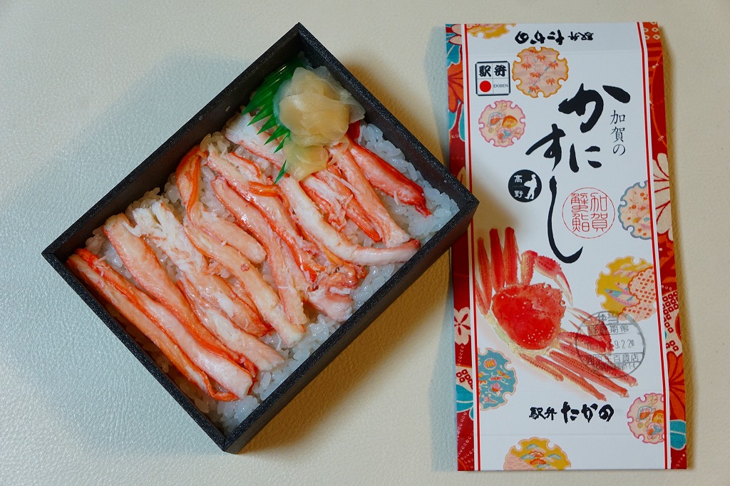 2014(平成26)年1月の阪神百貨店の駅弁大会でデビューか。掛紙にあるとおり冬季限定で、金沢駅と駅弁大会で売られる。そんな新しい駅弁らしからぬ、古風な絵柄と風合いの掛紙を使う。中身は酢飯を30本くらいのカニ脚と、少々のカニほぐし身とガリで覆うもの。同じ調製元でカニ棒肉がきれいに整列する「加賀のかにすし」より、食べた際の柔らかいカニの存在感は大きいと感じる。価格は2014年の発売時で1,360円、2015年時点で1,480円、2023年時点で1,680円。