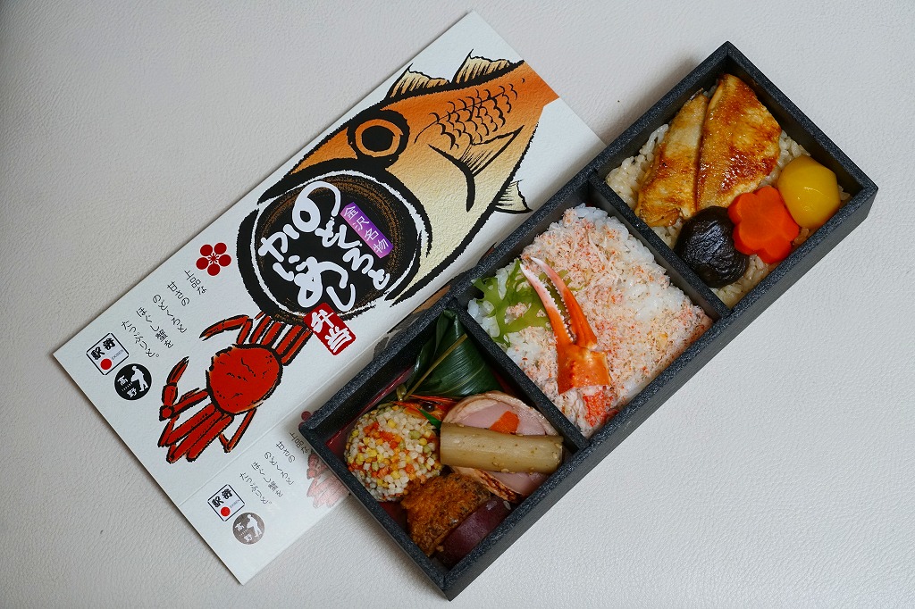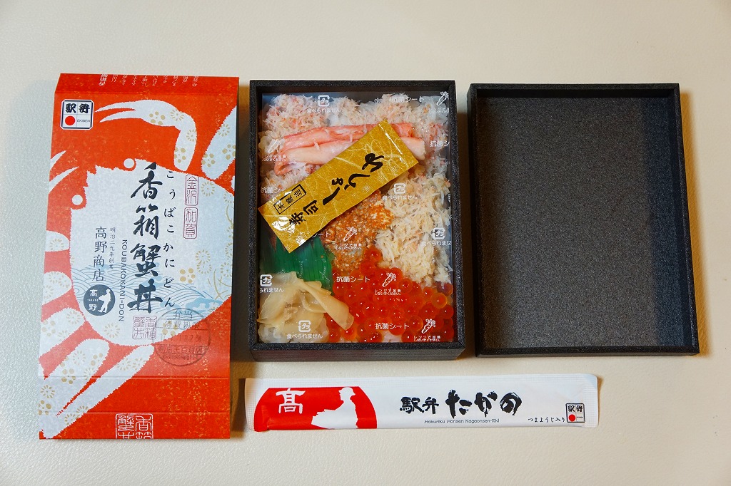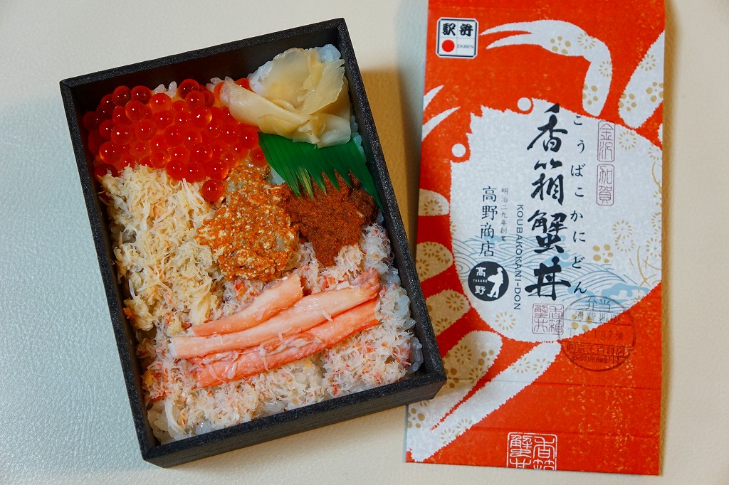 冬季限定の駅弁と表示して、2021(令和3)年以降に百貨店の催事場で実演販売されているらしい。下記の駅弁「香箱蟹丼」と同じスリーブに、ふたが透明な黒い容器をはめる。中身は酢飯を、香箱蟹(こうばこがに:石川県で水揚げされたメスのズワイガニ)の外子(腹の卵)と内子(甲羅の中の未成熟卵)、ベニズワイガニの棒肉とほぐし身で4分の1ずつ覆い、ガリを添える。カニの身より多い卵を存分に味わえる。小さいメスやベニズワイガニが安価でお徳だったり、ズワイガニと不当表示して売った時代は、もう10年以上前のこと。今では絶品グルメや高級食材として、これだけ高額な商品になった。