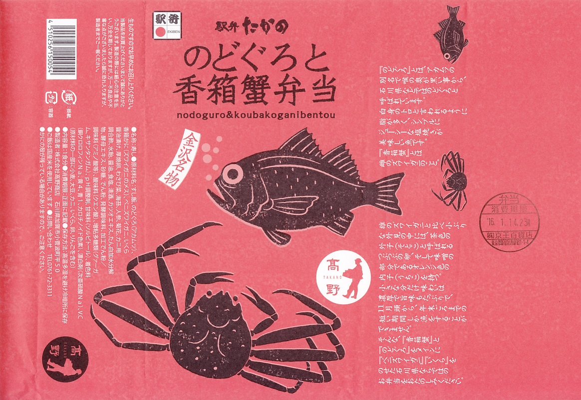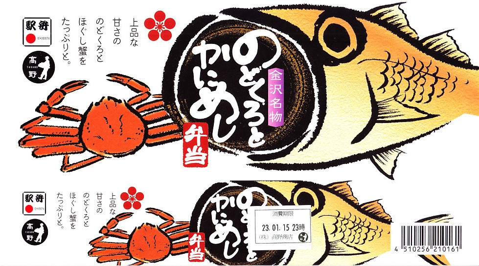 2016(平成28)年1月の京王百貨店の駅弁大会で、目玉の駅弁対決の一番手として実演販売。以後も冬季限定で販売か。駅弁の名前のとおり、白御飯をノドグロと、メスのズワイガニである香箱蟹(こうばこがに)のほぐし身を置き、イクラ、ベニズワイガニ、玉子焼、わさび菜を添える。