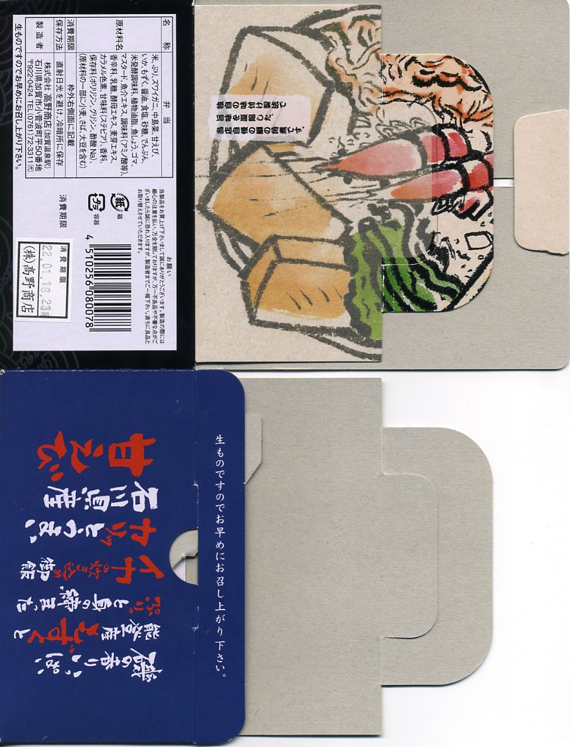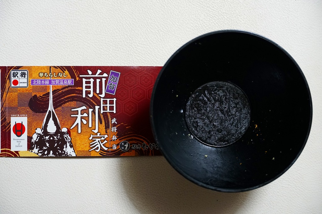 今回は黒いプラ容器が円錐状とボウル状で2種類あり、この前田利家は円錐状のもの。これに前田家の家紋を入れ、日本古窯弁当と同じ半透明のふたをして、今回のシリーズで共通のしおりを置き、それらしき絵柄のスリーブで留める。中身は酢飯をサイコロ状の玉子焼、ぶり、サーモンで覆い、イクラ、甘えび、金箔で彩るもの。戦国きっての傾奇者前田利家をイメージした海鮮ちらし寿司なのだそうだが、傾奇(かぶき)なんてとんでもない、見ても食べても美しく柔らかいお魚どんぶり。この中身を転用した、駅で売る弁当の出現を期待したい。3月までには終売か。