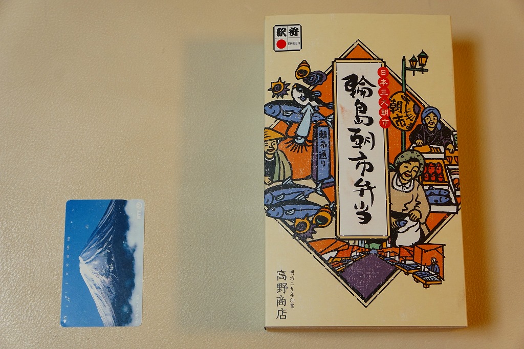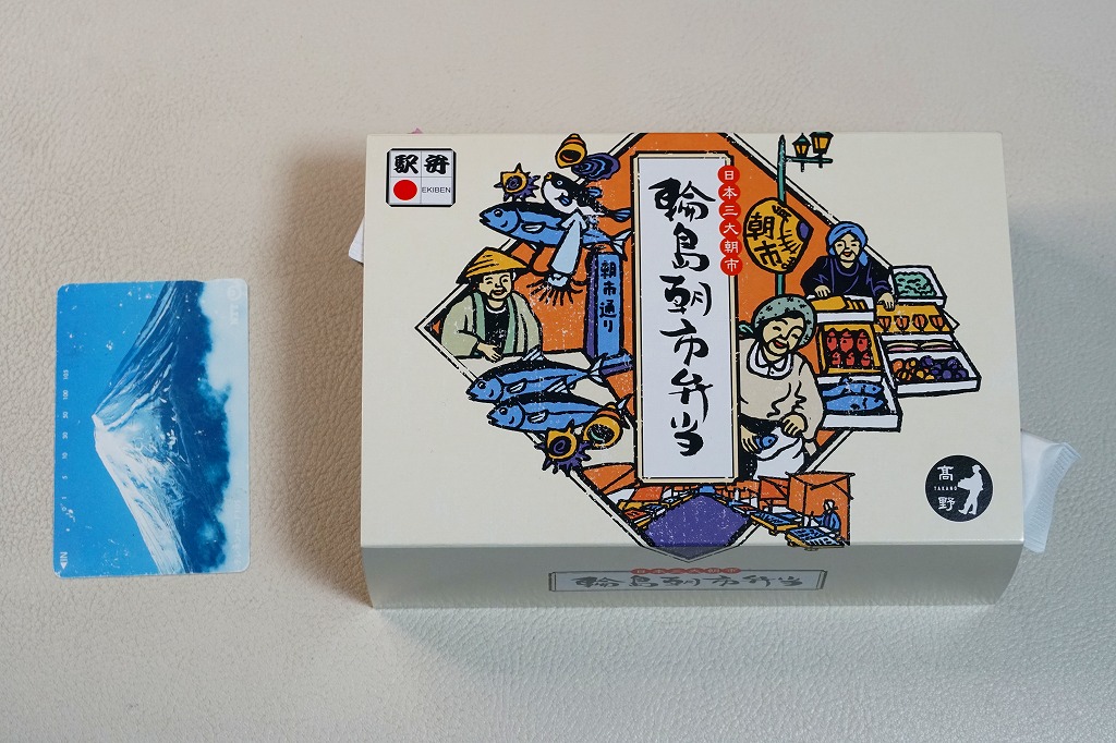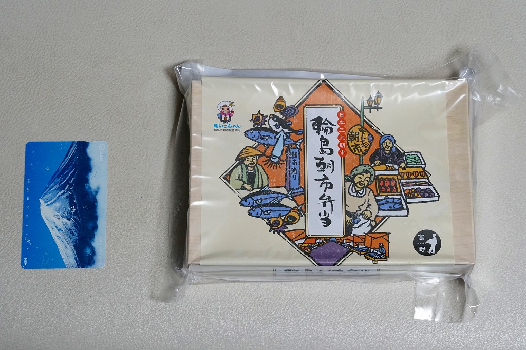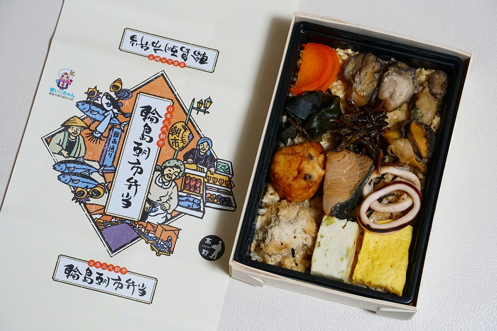 2015(平成27)年8月に金沢駅で発売、2024年9月頃にリニューアル。調製元は石川県の西端にある加賀温泉駅の駅弁屋だが、片道3時間以上離れている石川県の北端で朝市が有名な輪島の、輪島朝市組合公認のお弁当だという。スリーブには能登の朝市の雰囲気を表すイラストが描かれる。
