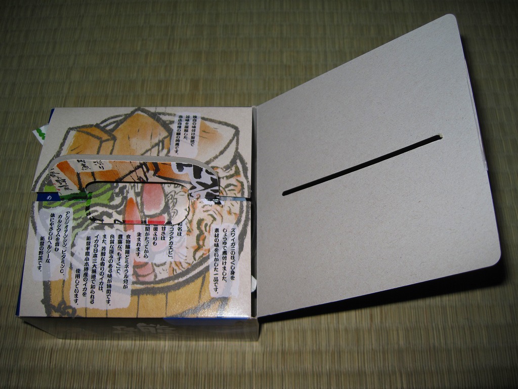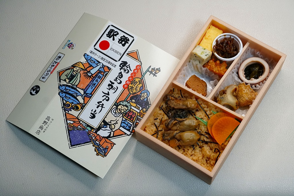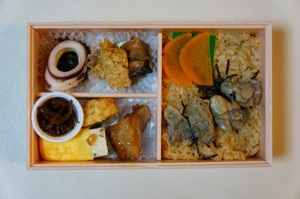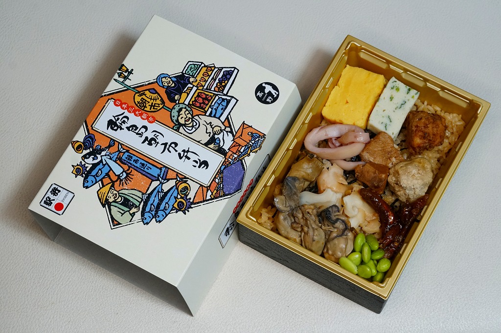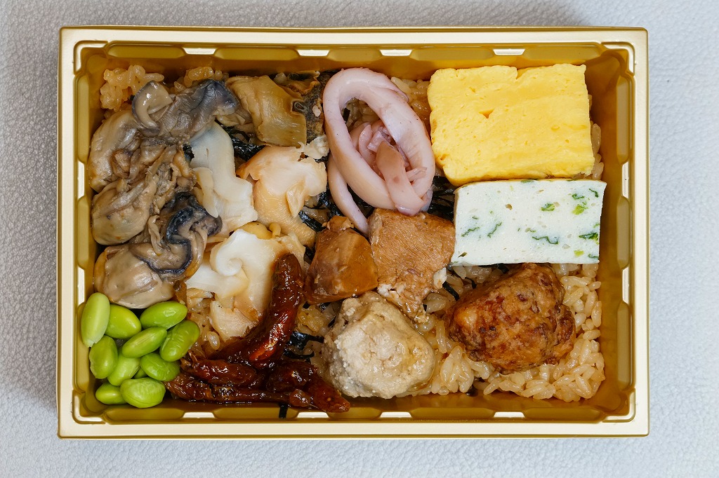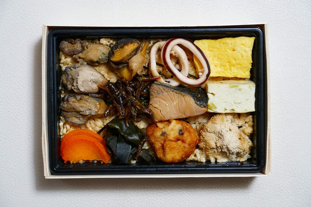 小柄になった長方形のプラ容器に、カキの出汁で炊いた御飯を敷き、刻み海苔を振り、カキいしる煮、厚焼き玉子、ミートボール、イカの酢の物、サザエいしる煮、タラコのうま煮、ブリ角煮、バイ貝うま煮、中島菜入り固豆腐、ゴリ佃煮、枝豆を折り重ねる。これは個性作なおつまみ弁当。磯の香りでなく味で、日本酒が進むのではないかと思う。価格は2015年の発売時で1,050円、2021年時点で1,100円、2023年時点で1,200円、2024年9月のリニューアルで1,300円。