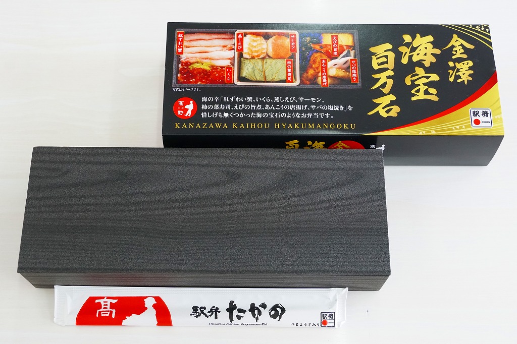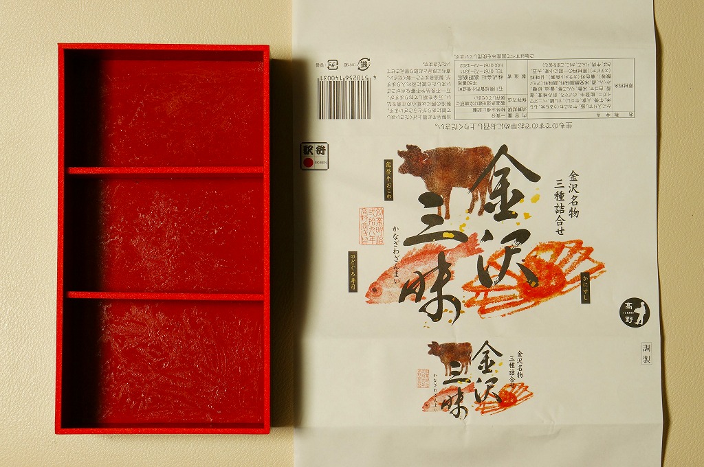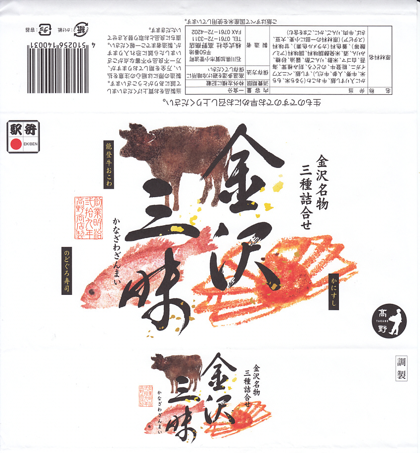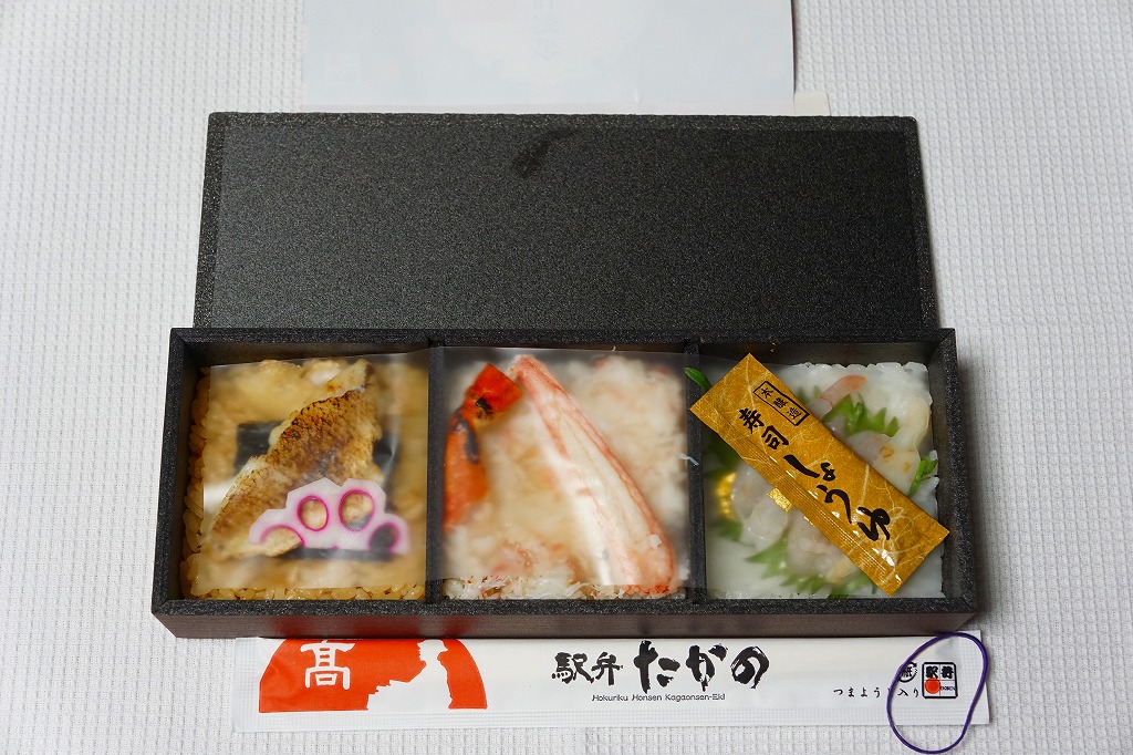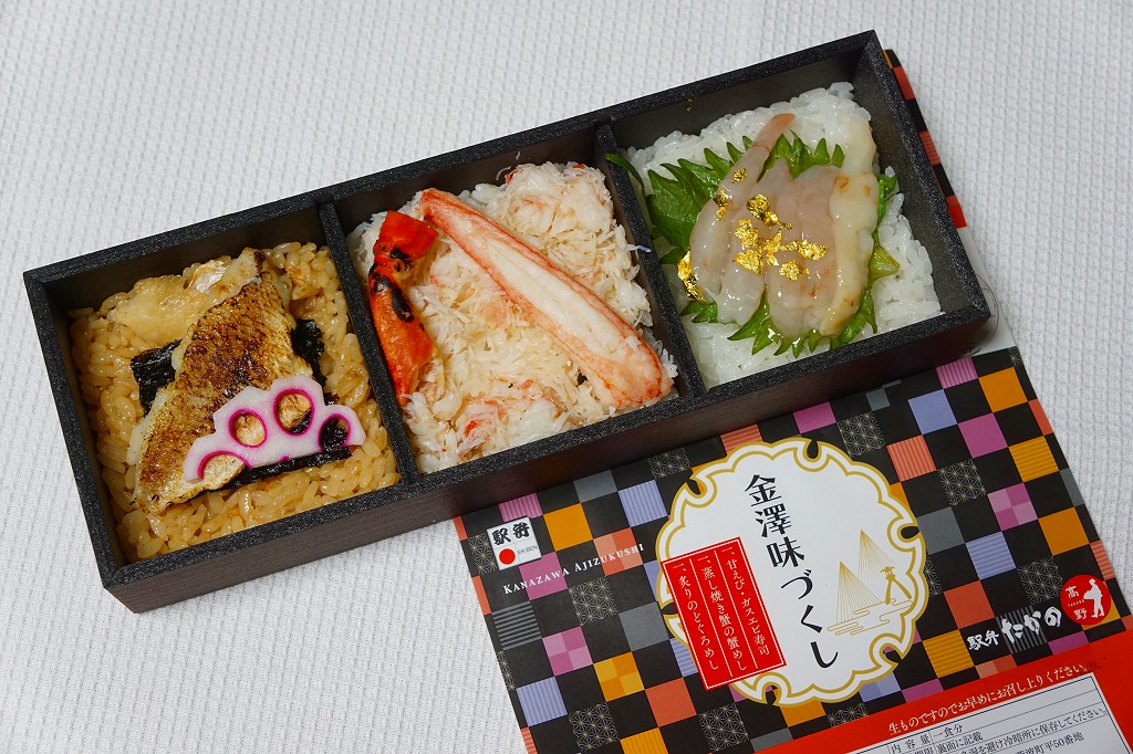 2015(平成27)年3月の北陸新幹線金沢開業に向けて、まずは同年1月の阪神百貨店の駅弁大会で実演販売。中身はかにすし、牛おこわ、のどぐろ寿司でシンプルな3区画の長方形ミニ丼の詰合せ。掛紙もシンプルに商品名と3種の食材の絵柄を描く。のどぐろの味わいがどこまで本格的か、経験が薄く分からないが、この組合せと詰合せはアリだと思う、分かりやすい見栄えと味。価格は2015年の発売時で1,200円、2023年時点で1,300円、11月時点で1,350円。