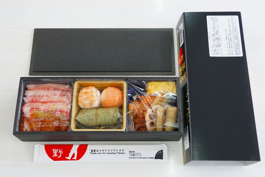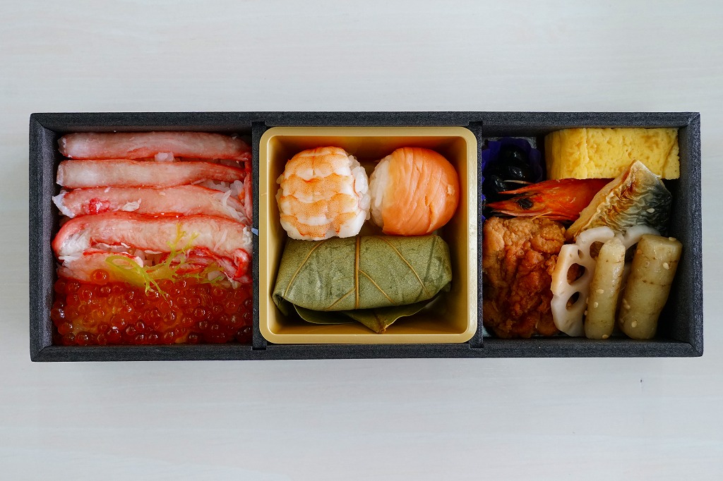 秋冬の駅弁大会シーズンに向けた、2025(令和7)年秋の新商品か。JR東日本の駅弁キャンペーン「駅弁味の陣2025」にエントリー。2022年秋冬のシーズンにも、同じ名前で容器や中身が異なる商品がスーパーで輸送販売されたらしい。横に3倍細長い容器も、商品名と中身の写真を載せたスリーブも真っ黒。中身は左側で酢飯を紅ずわい蟹といくらで覆い、中央でサーモンと蒸しえびのてまりずしと柿の葉寿司、右側でえびの甘煮、サバの塩焼き、あんこうの唐揚げ、しめさば、玉子焼、黒豆煮、酢れんこん。見た目がきれいで、内容と名前を含めて豪華さを感じる、海のもののお弁当。