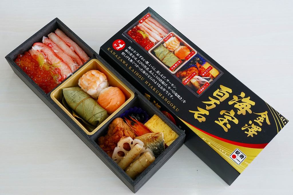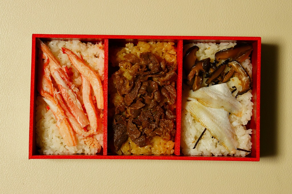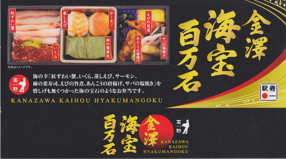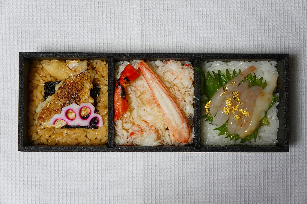 2018(平成30)年1月の京王百貨店の駅弁大会で、新作駅弁を先行販売という言い方で実演販売。正方形の3区画に「炙りのどぐろめし」「蒸し焼き蟹の蟹めし」「甘えび・ガスエビ寿司」をひとつずつ詰める。おかずや付合せや漬物を入れないシンプルさと、飯が酢飯でないことで、個人的にはかなり好みで好ましいと思うもの。しかし会場では見た目に売れていなかった。金沢駅でいつ販売したかは、現地での評判は不明。2020年時点で存在しない模様。