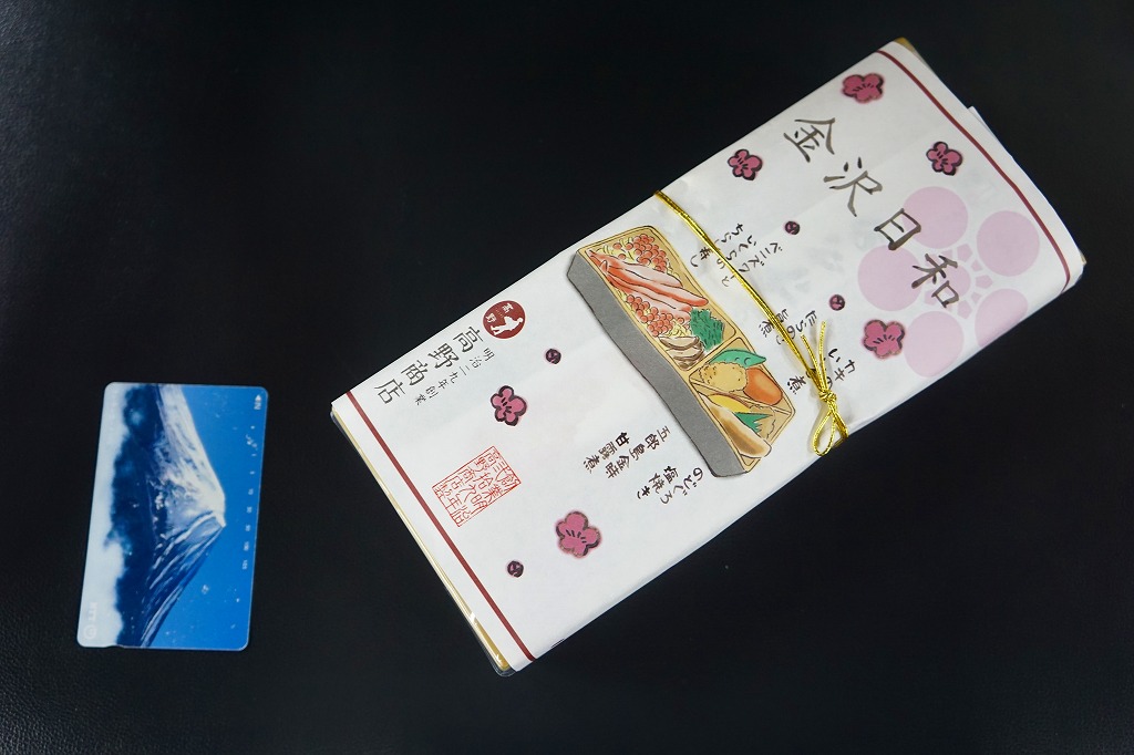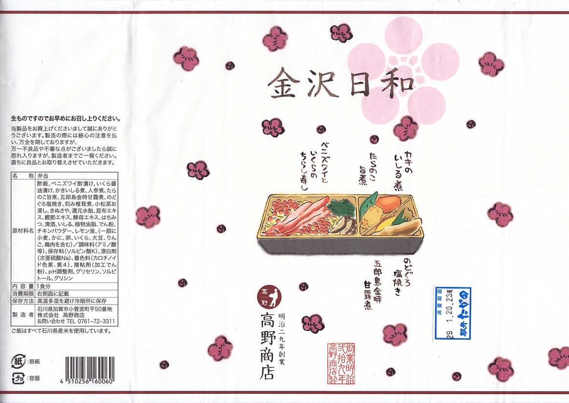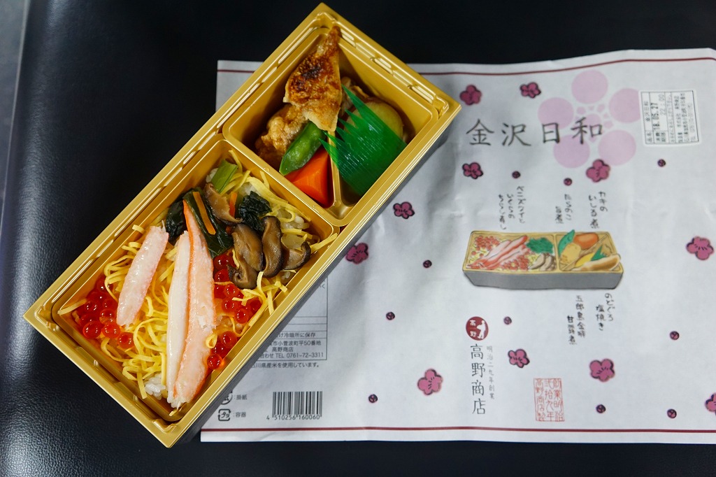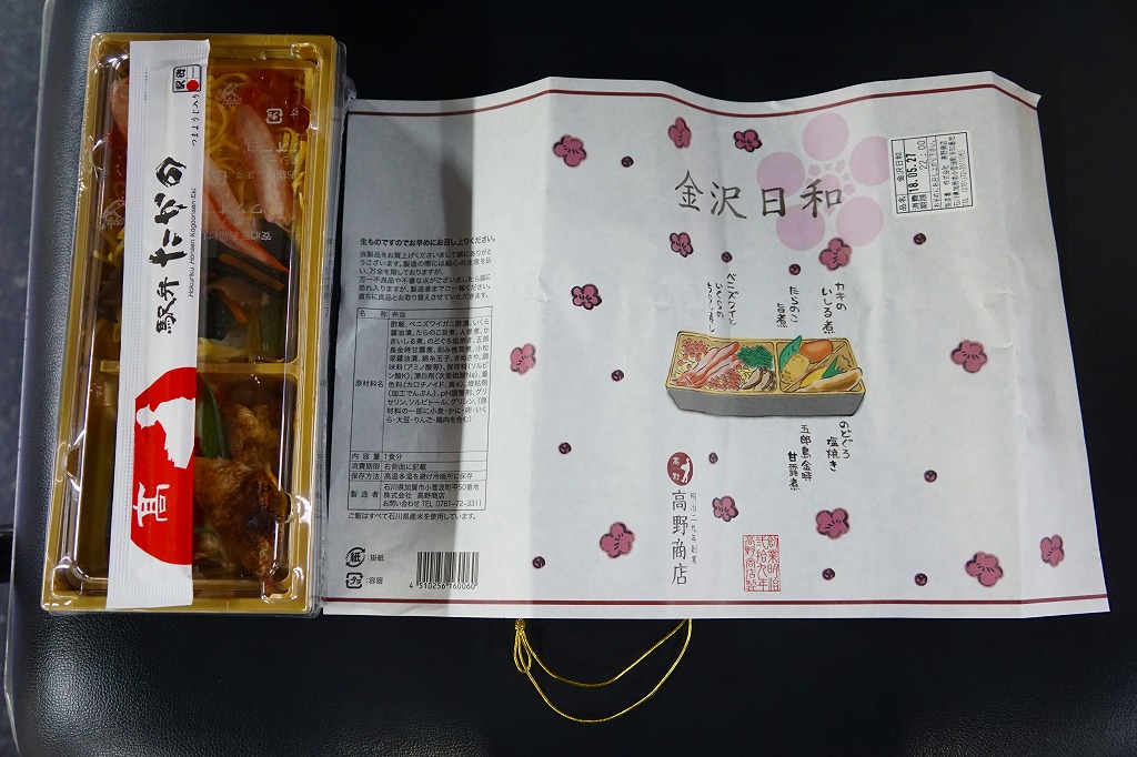 上記の駅弁「金沢日和」を、現地で買ったもの。名前も掛紙も中身も価格も同じ。カニの面積が見た目で半分になるなど、中身の見栄えに差異があり、催事場のもののほうが美しかった。価格は2018年の購入時で1,000円、2019年時点で1,100円。