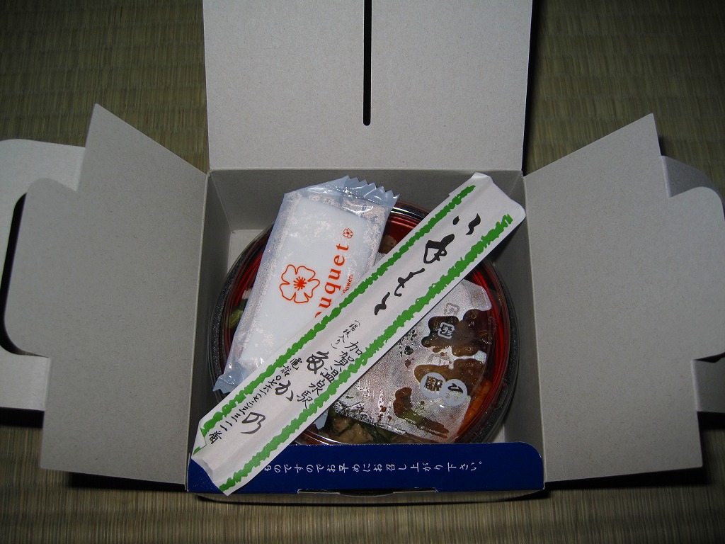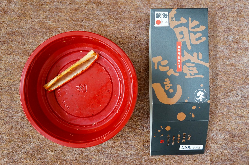 「たべまっし」とは加賀や能登つまり石川県の方言で「食べてみませんか」の意味だそうな。アマエビが香り、ブリが味を広げ、柔らかい御飯が合い、中島菜がピリッと締める、食べておいしいお弁当。なお、加賀温泉駅は能登から鉄道でも車でも2時間以上は離れている。