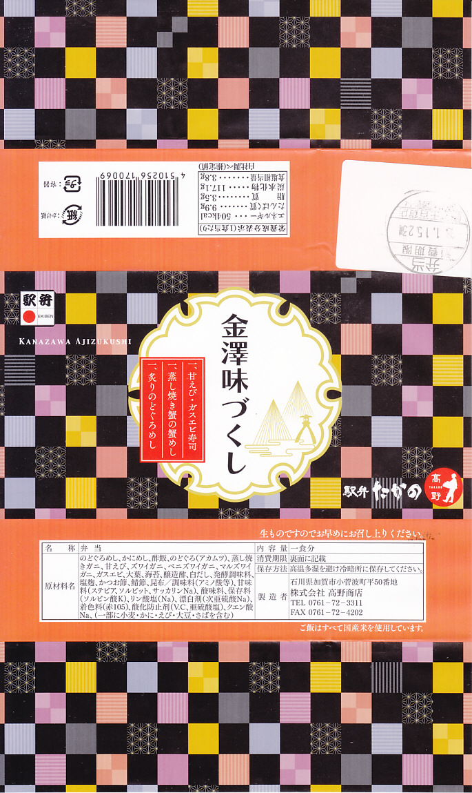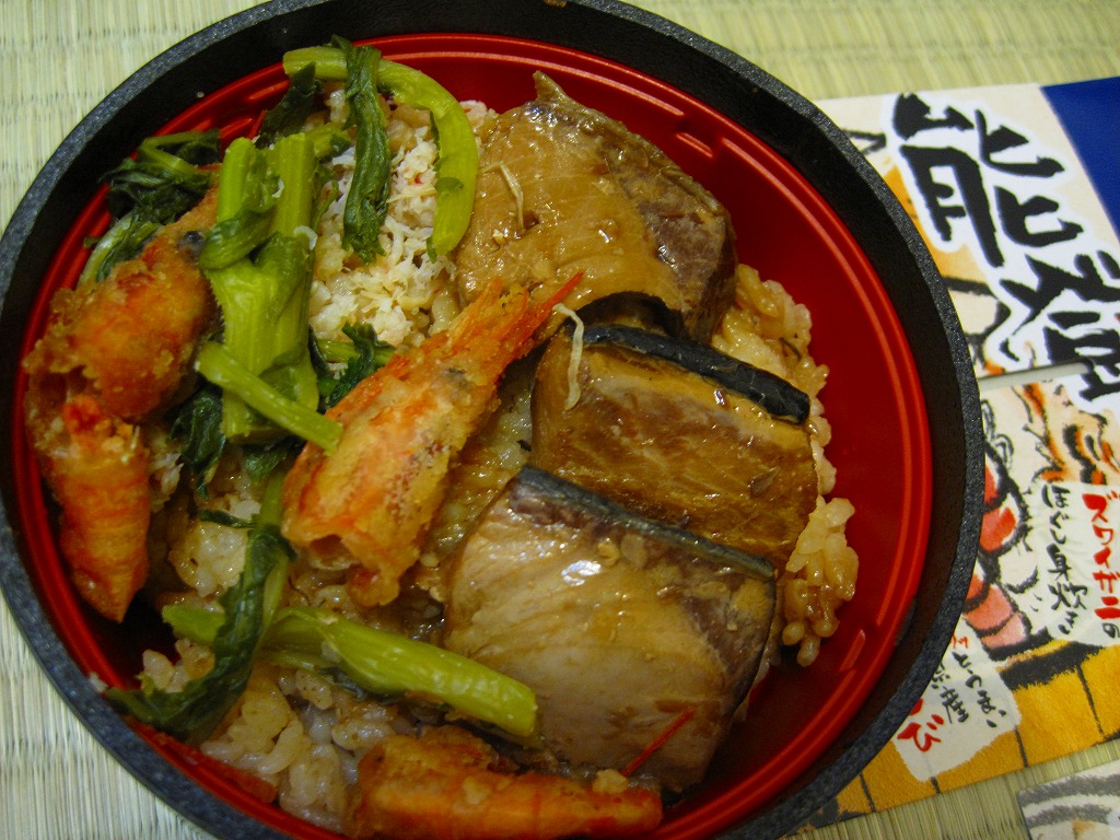 秋冬の駅弁大会シーズンに向けた、2011(平成23)年の秋に投入か。総プラスティック製の釜飯形の容器を、振りのイラストや中身の写真などを印刷したボール紙の枠にはめる。中身は茶飯の上をブリ角煮で半分、エビとエビと錦糸卵とワカメとダイコンで半分覆うもの。冷たくなった輸送駅弁なのに煮魚のうまみが生きている。この秋に一件あった加賀温泉駅弁に今シーズンの輸送で出会えたのも収穫だった。2013年までの販売か。