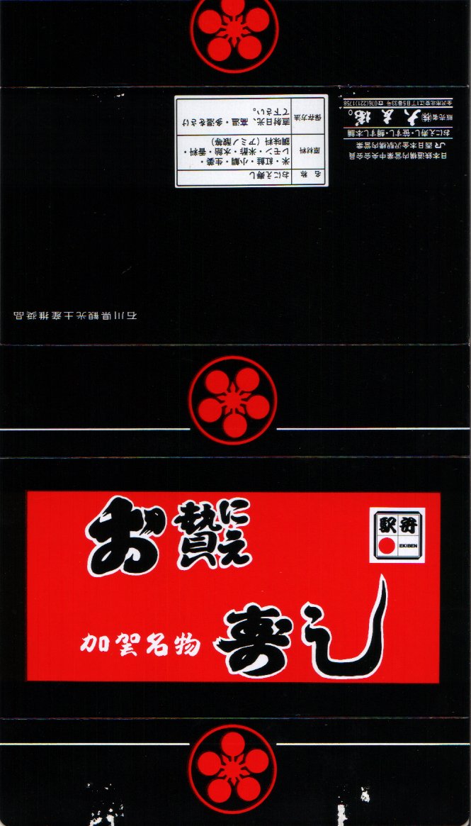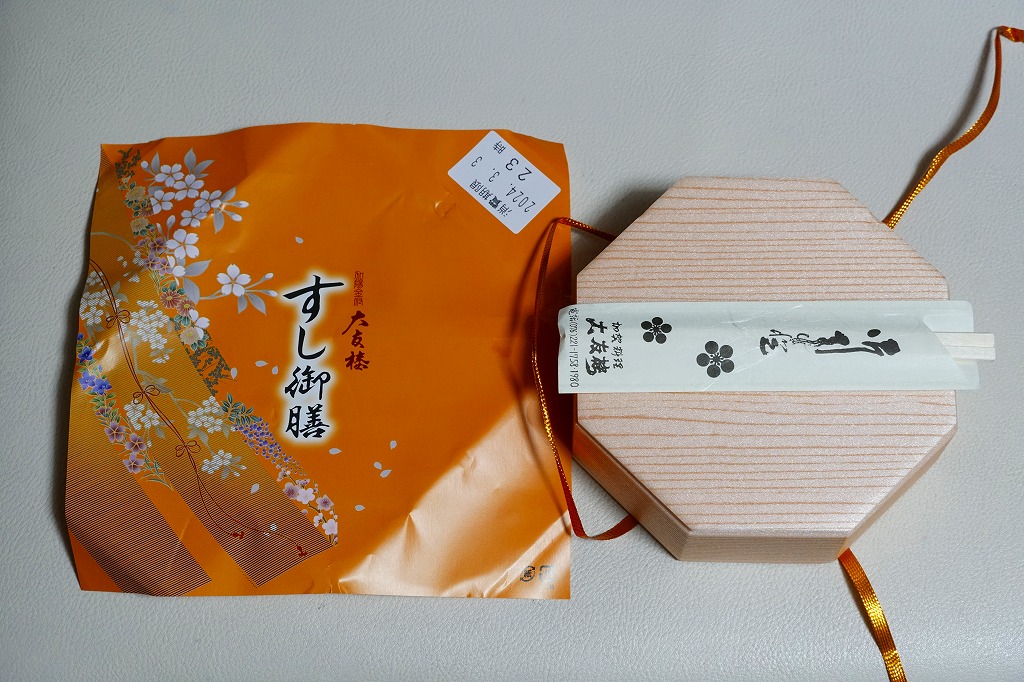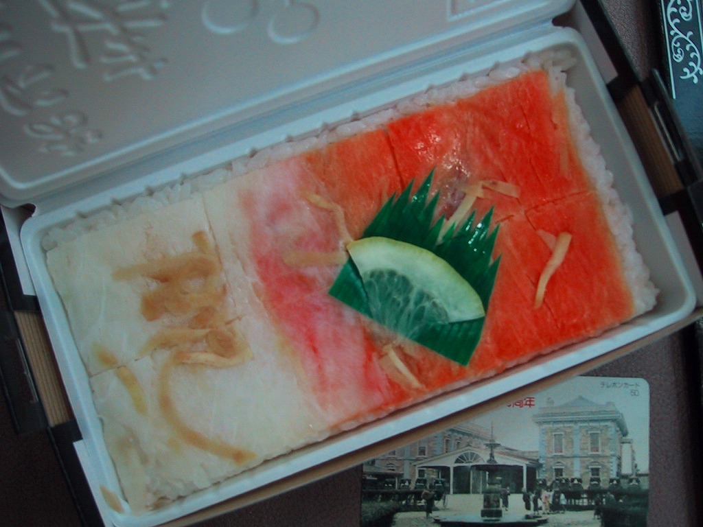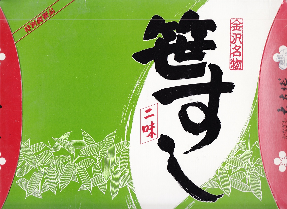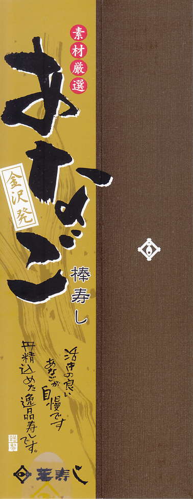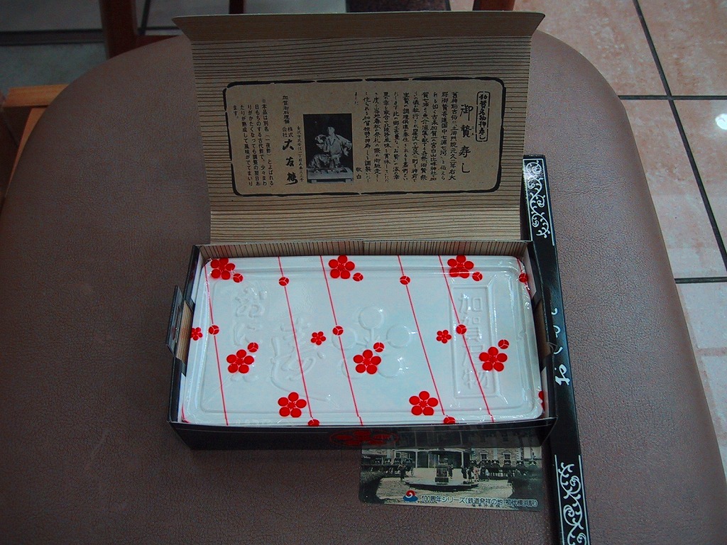長持を模した紙箱の中に、ふた付きのトレーを入れる。中身は、あと少し押せば煎餅になりそうなほど固く締まった古代酢使用の酢飯の上に、紅鮭と小鯛で紅白をあしらった身を乗せる押し寿司。レモンの小片が添えられる。春秋の祭礼の際に御馳走として作られるという、加賀の伝統料理だそうな。価格は2002年の購入時で600円、2015年時点では650円。2015年頃までの販売か。