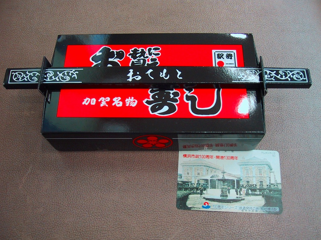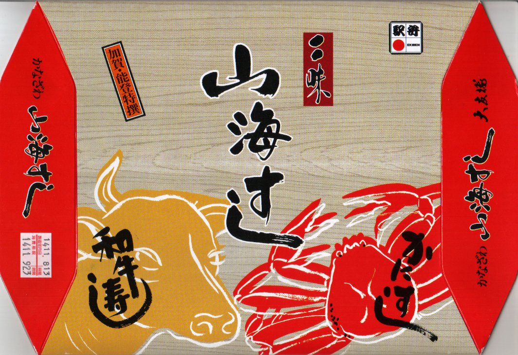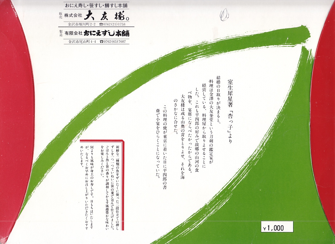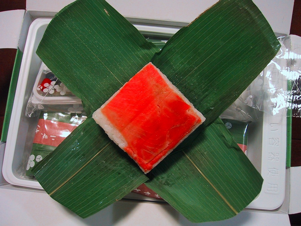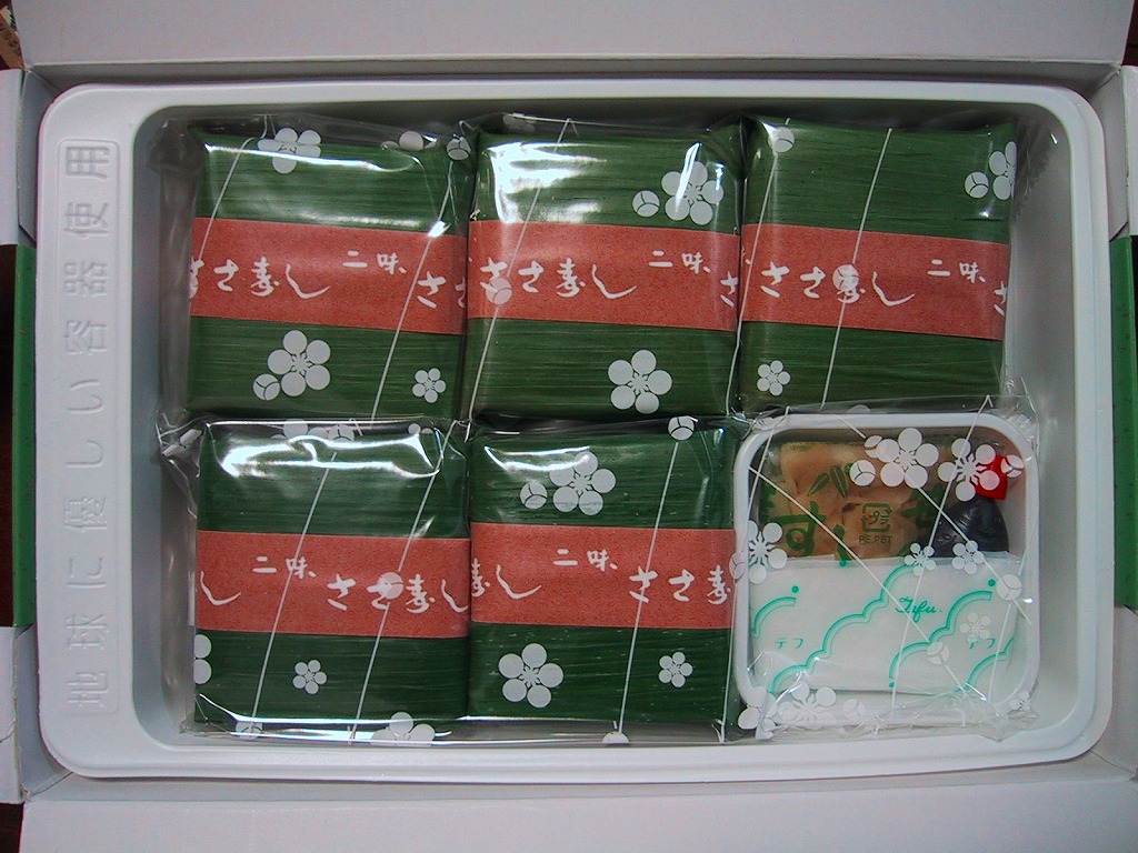 長持を模した紙箱の中に、ふた付きのトレーを入れる。中身は、あと少し押せば煎餅になりそうなほど固く締まった古代酢使用の酢飯の上に、紅鮭と小鯛で紅白をあしらった身を乗せる押し寿司。レモンの小片が添えられる。春秋の祭礼の際に御馳走として作られるという、加賀の伝統料理だそうな。価格は2002年の購入時で600円、2015年時点では650円。2015年頃までの販売か。