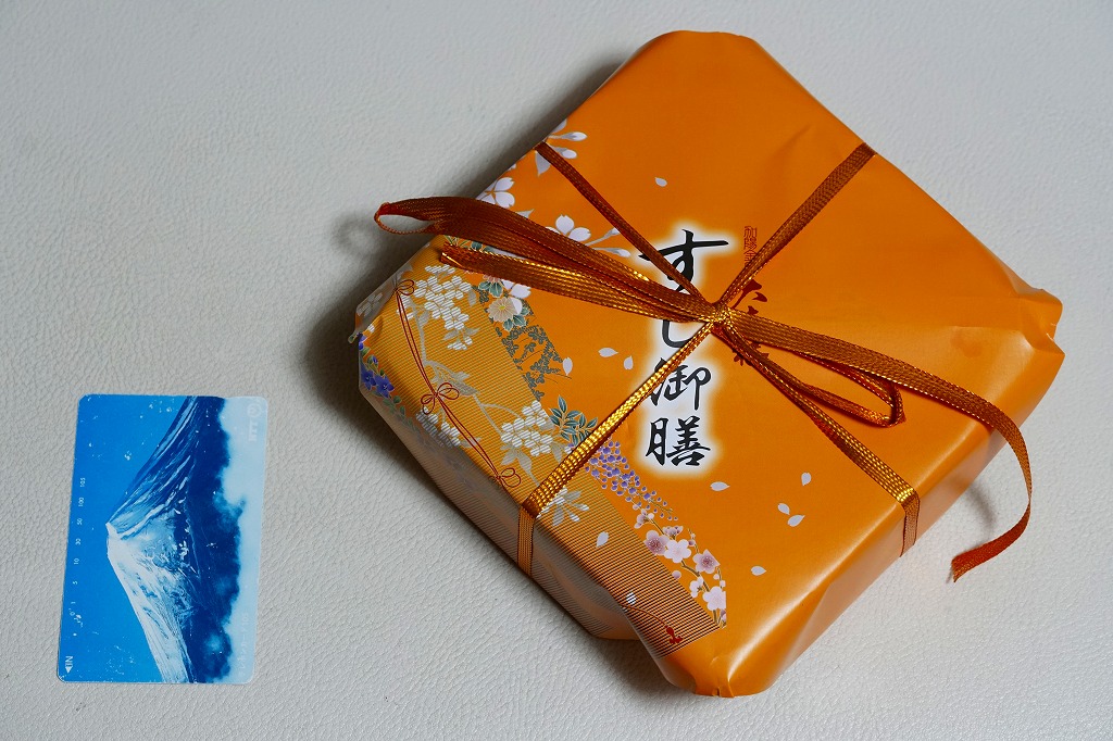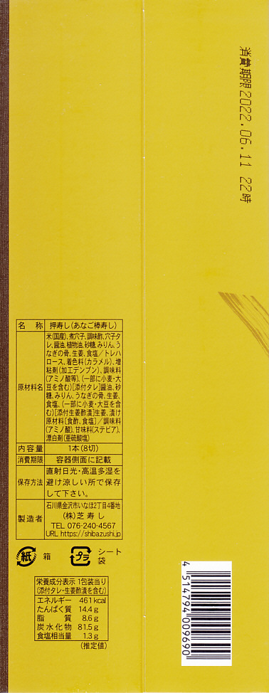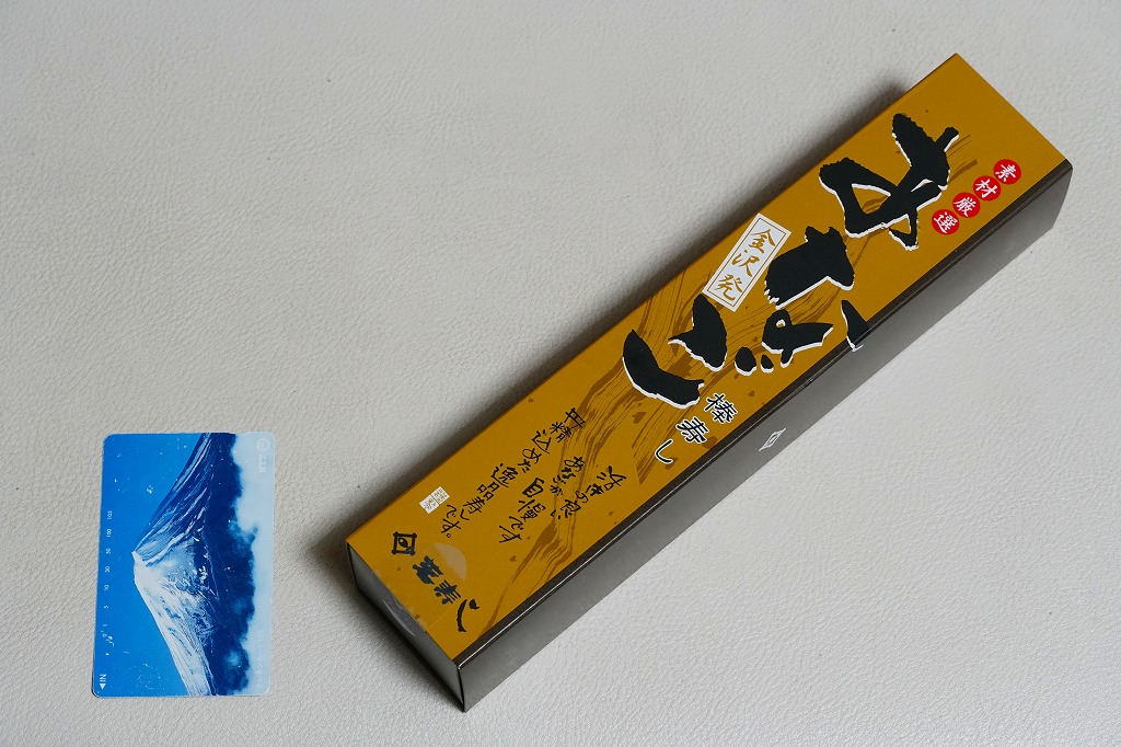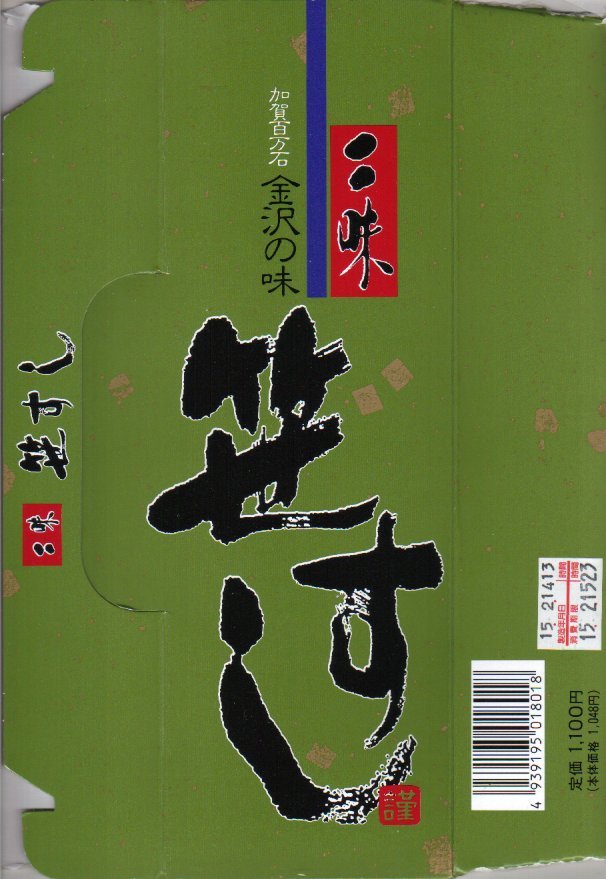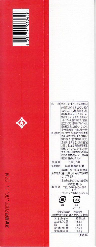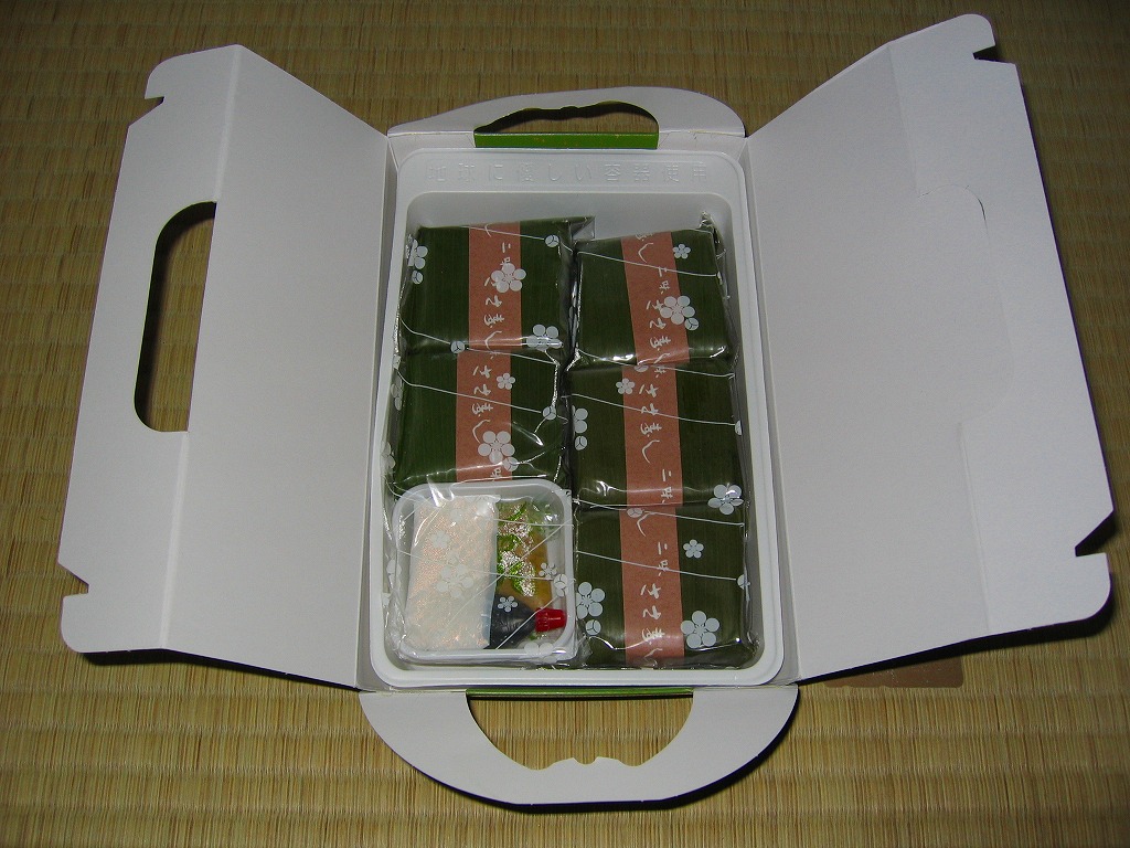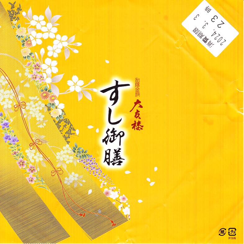 長持を模した紙箱の中に、ふた付きのトレーを入れる。中身は、あと少し押せば煎餅になりそうなほど固く締まった古代酢使用の酢飯の上に、紅鮭と小鯛で紅白をあしらった身を乗せる押し寿司。レモンの小片が添えられる。春秋の祭礼の際に御馳走として作られるという、加賀の伝統料理だそうな。価格は2002年の購入時で600円、2015年時点では650円。2015年頃までの販売か。