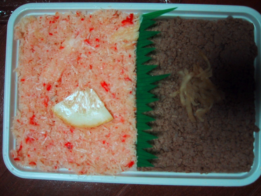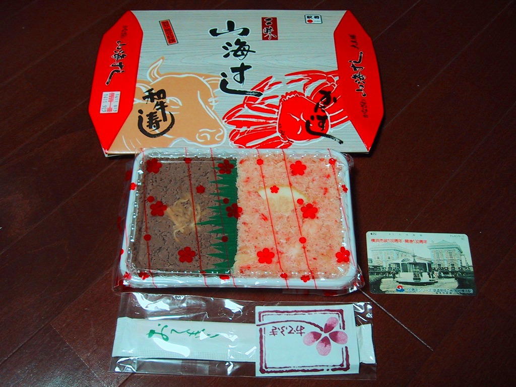 有名駅弁に多用されるボール紙の立体パッケージの中に、密封されたトレーが入る。中身は固く締まった酢飯の上に細かいカニ身と牛そぼろが載るもの。お箸でそのまま食べられるが、プラのナイフも添付する。