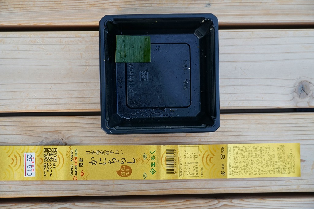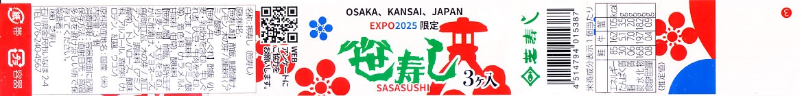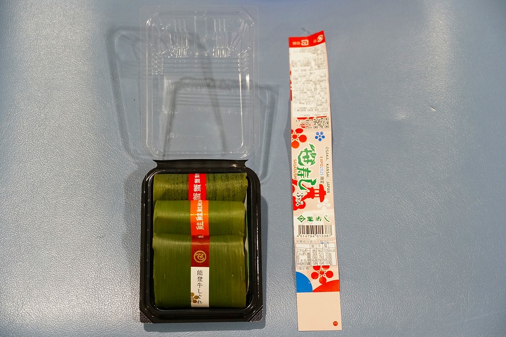 金沢で親しまれる芝寿しが、2025(令和7)年4月13日から10月13日まで開催される大阪・関西万博の土産物店「北陸お花ごっつおマルシェ」に出店、そこで買えた商品のひとつ。金沢の現地のものと同じ笹寿しを、能登牛しぐれ、鮭、紅ずわい蟹の3個セットでプラ容器に詰め、万博の名を記した紙帯を締めたもの。価格は現地の5割増という感じでも、万博会場内なのできっと気にされない。