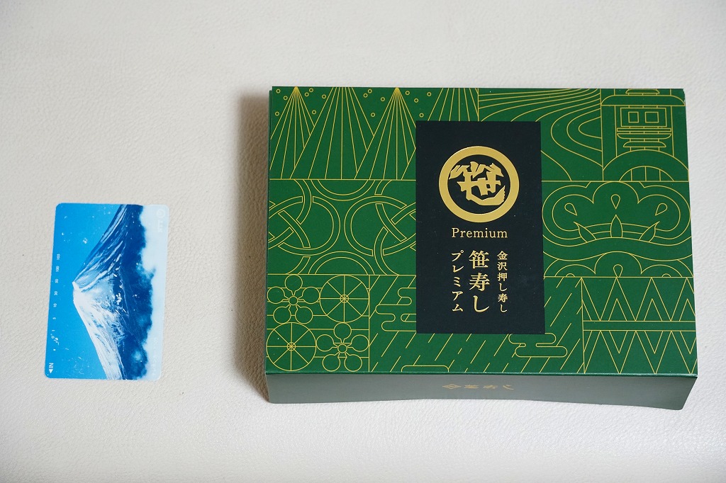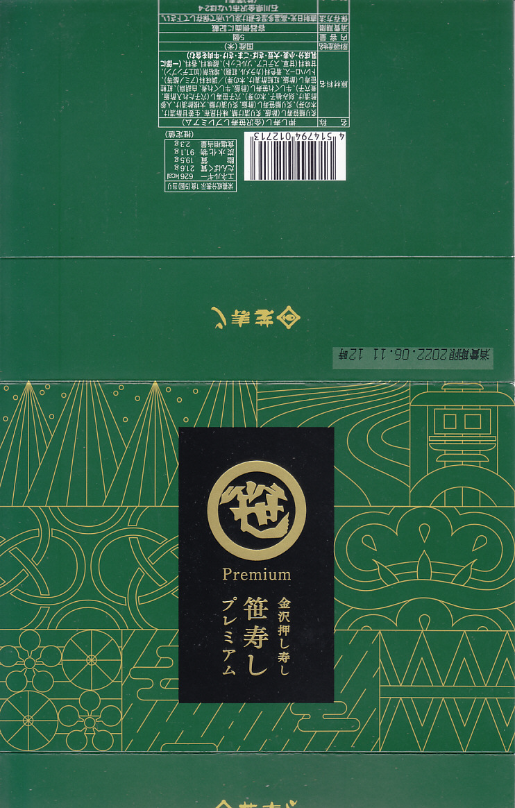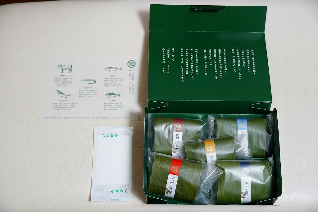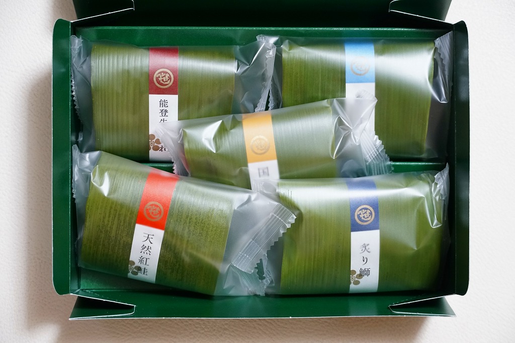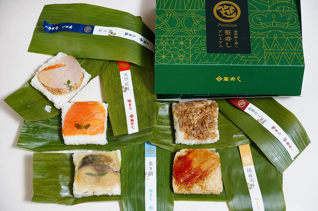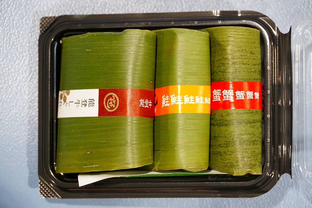 笹の葉の色をした紙箱に、本物の笹で具と飯を縦横に巻いた、北陸タイプの正方形の笹寿司を、袋詰めして5個折り重ねる。紙帯に記された中身は「炙り鰤」「天然紅鮭」「能登牛しぐれ」「炙り鯖」「国産穴子」とあり、それぞれの具が正方形の酢飯の板に貼り付いていた。手を汚さずには食べにくいので、列車内での食事には向かないかもしれないが、味も見た目もおしゃれな、お菓子か土産物のようにも見える弁当類。