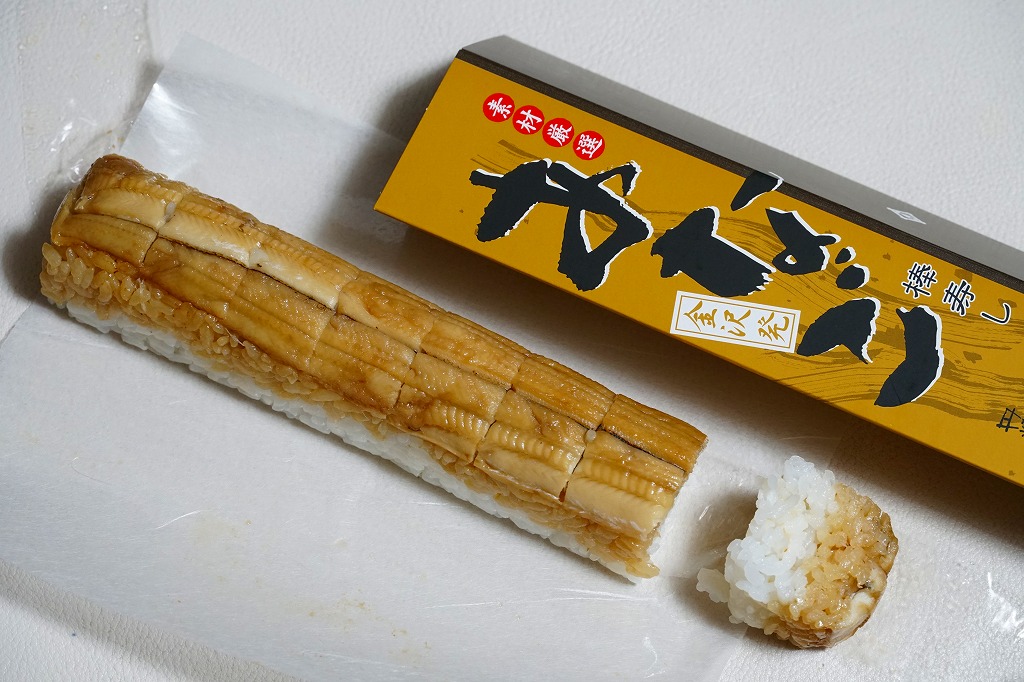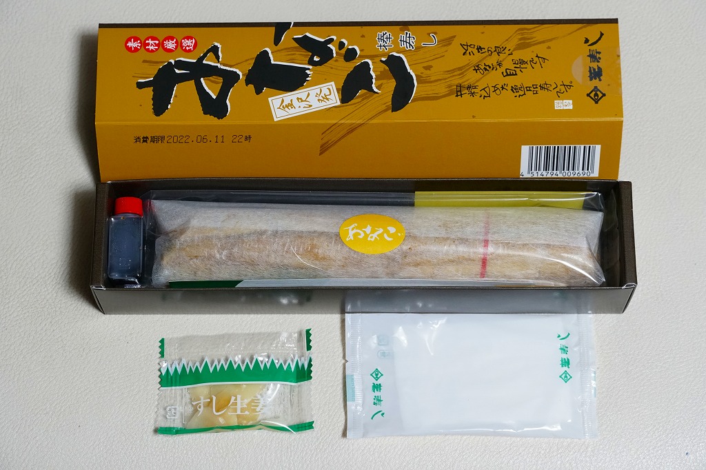 酢飯の半分にタレを染み込ませて、煮穴子を貼り付けた棒寿司を1本、縦横にフィルムで巻いて袋に密封し、たれと生姜と割りばしとおしぼりを含めて紙箱に詰めて、スリーブに収める。味は柔らかくも普通の穴子寿司。細長いにも程があると思う、市販の太めの魚肉ソーセージをもう少し太くしたくらいの、スリムな形状が印象的。