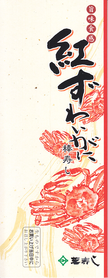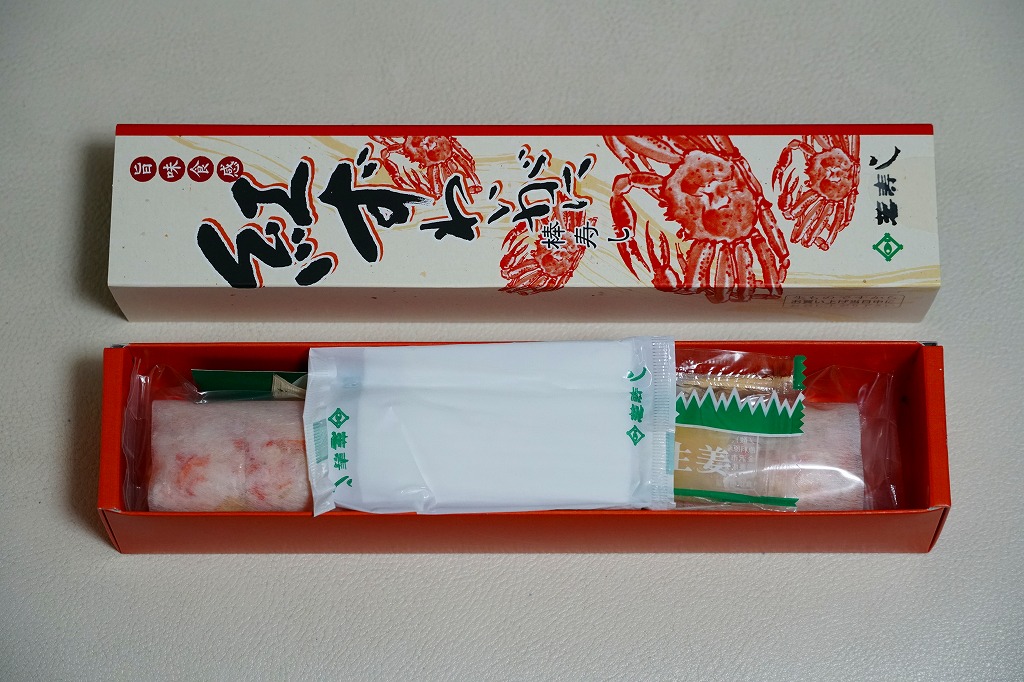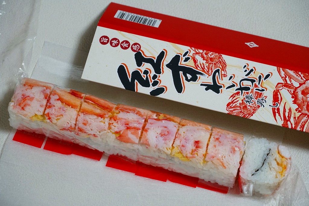 焼海苔を挟んだ酢飯に、ベニズワイガニの棒肉やほぐし身と錦糸卵を貼り付けた棒寿司を1本、フィルムで巻いて8切れにカットして、さらにフィルムで巻いて袋に密封し、醤油とわさびと生姜と割りばしとおしぼりを含めて紙箱に詰めて、スリーブに収める。マヨネーズを隠し味とする、見た目も味も今風のカニ棒寿司。細長いにも程があると思う、市販の太めの魚肉ソーセージをもう少し太くしたくらいの、スリムな形状が印象的。