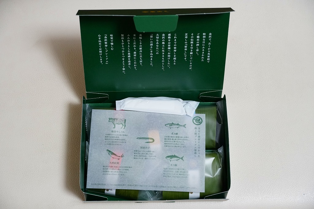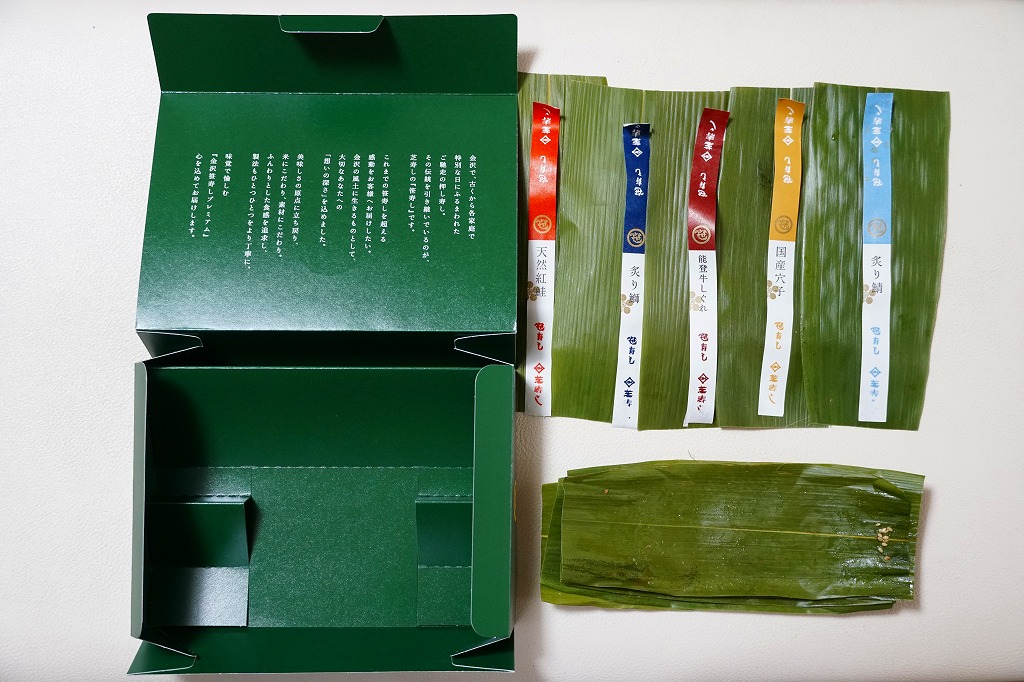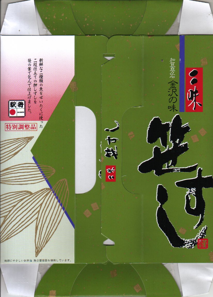 ボール紙で組み立てた笹の葉色の容器の中に無公害樹脂のトレーが入り、笹の葉に包まれた鯖と鱒の押し寿司が、紙帯を締めてビニールで個別に包まれた形で5個整然と入る。金沢駅の押し寿司駅弁らしい、やや固めの食感が特徴。緻密な酢飯に寸分違わぬ魚の身、和菓子折のように整然と並ぶ中身や丁寧な包装に、和と史を感じずにはいられない。パッケージに記される「特別調整品」の意味は不明。2004年度のJR西日本の駅弁キャンペーン「駅弁の達人」の対象駅弁。価格は2003年の購入時で1,100円、2015年時点で1,150円。現存しないのではないかと思う。