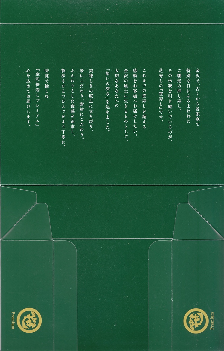 調製元は金沢市内の笹寿司店。金沢駅の商店街ほか北陸3県にチェーン展開するほか、富山駅や小田原駅などの駅弁を常時販売する東京と神奈川のスーパーマーケット「ザ・ガーデン自由が丘」にも商品を卸すため、上野駅で駅弁として親しまれてきたかもしれない。芝寿しは日本鉄道構内営業中央会の会員であり、するとどこかのJR駅で構内営業の権利を持つはずで、駅弁マークを使う駅弁を販売できるが、駅弁を名乗らないし、商品が駅弁と紹介されることもほとんどない。